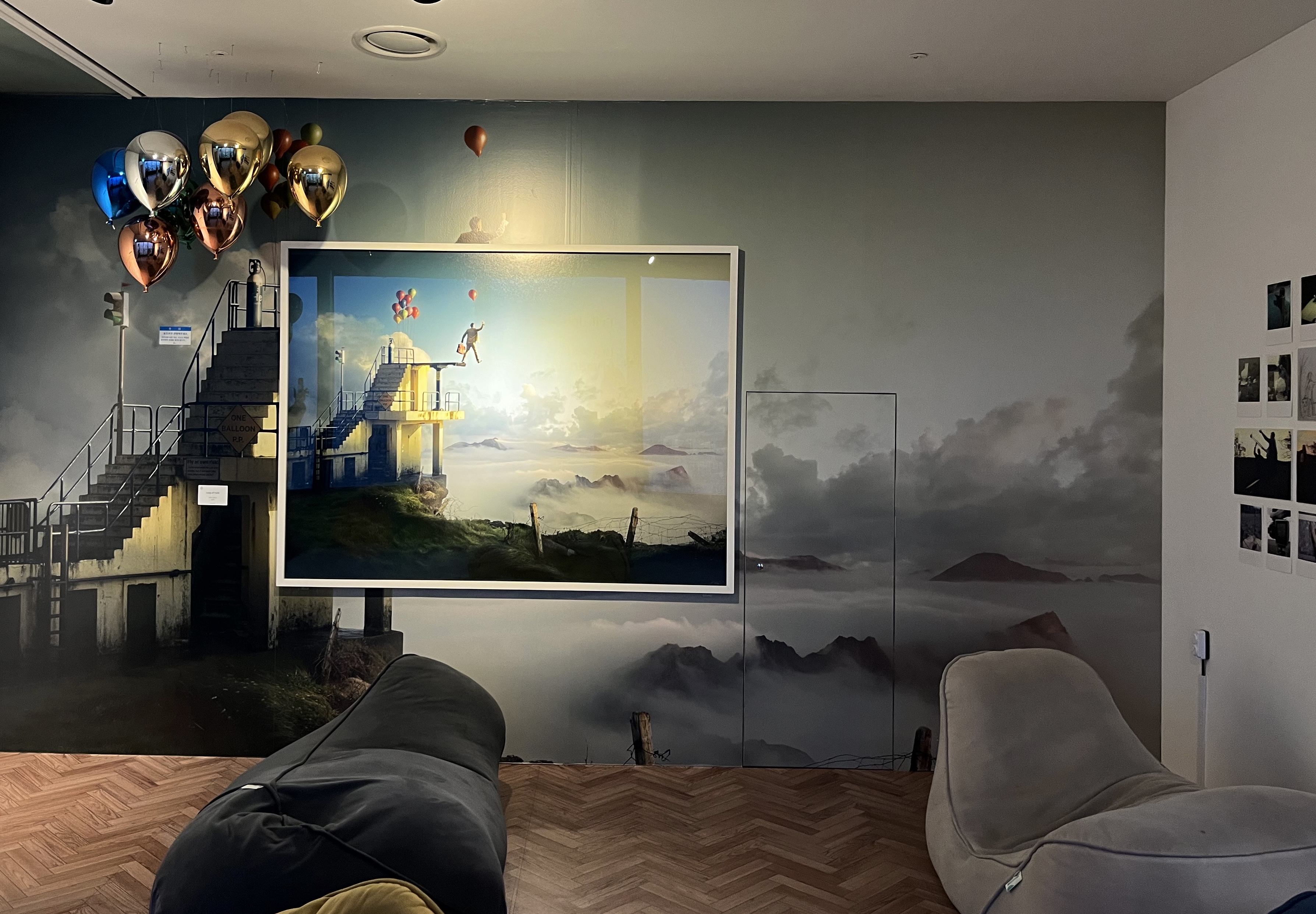 Section 1 ~ 3 이 지나고 전시의 1막쯤 넘어가면 63아트만의 매력, 탁 트인 통 창뷰와 함께 빈백 소파들이 준비되어 있는 쉬어가는 공간이 나오는데요. 이 공간에서는 에릭 요한슨이 작품을 만들 때 아이디어의 기획, 사진 촬영, 이미지 프로세스 그리고 작품 발표까지의 단계를 거치는 과정에 대해 자세하게 설명한 것을 읽을 수 있었고, 에릭 요한슨의 QnA도 남겨져 있었어요. 이 기상천외한 작품들은 보통 문득 떠오르는 영감을 소재로 하지만, 그 아이디어가 작품으로 완성되는데 까지는 생각보다 상당한 시간이 소요됩니다. 이 아이디어를 기획하고 스케치하는 것까지 보통 1~12개월, 원하는 결과를 얻기 위한 사진 촬영의 과정은 보통 1주일 그리고 최종 이미지를 만들어내고 최종 디테일까지 잡아내는 데에는 20시간 이상의 시간을 들여 작품을 만들어낸다고 해요.