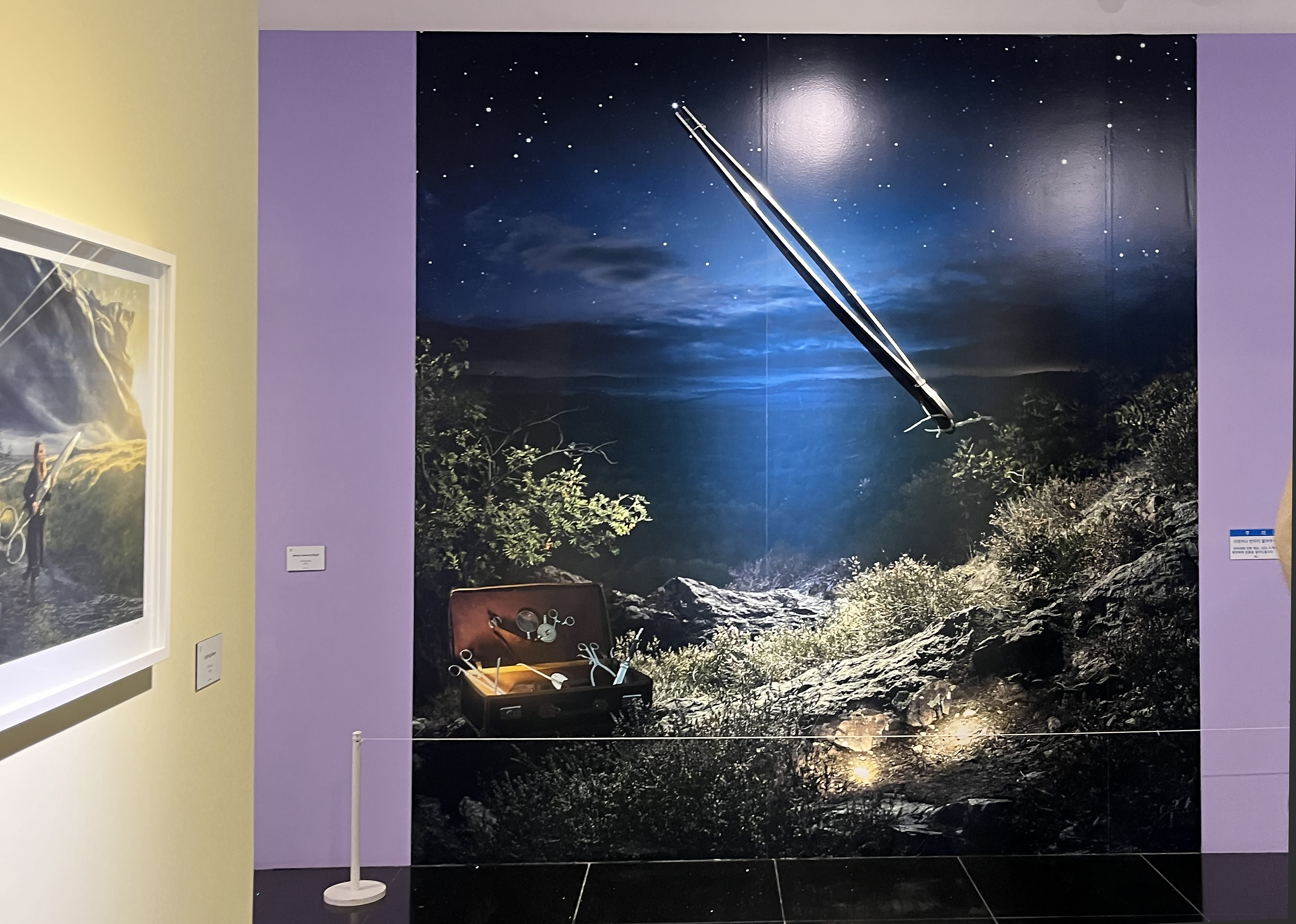 작품에 커다란 대형 핀셋이 붙어 있습니다. 핀셋으로 별을 따는 듯한 모습의 작품이 바로 옆에 함께 있는데요. 실제로 밤 하늘의 별을 핀셋으로 가볍게 딸 수 있다면 어떤 일이 벌어질까요? 기발하게 스쳐 지나가는 생각들을 에릭 요한슨은 쉽게 지나치지 않고 하나의 작품으로 구현해 버립니다. 특히 이 대형 핀셋은 전시의 포토존 중 하나로 작품 속 사람을 따라 하며 인증샷을 남기기 좋았습니다.