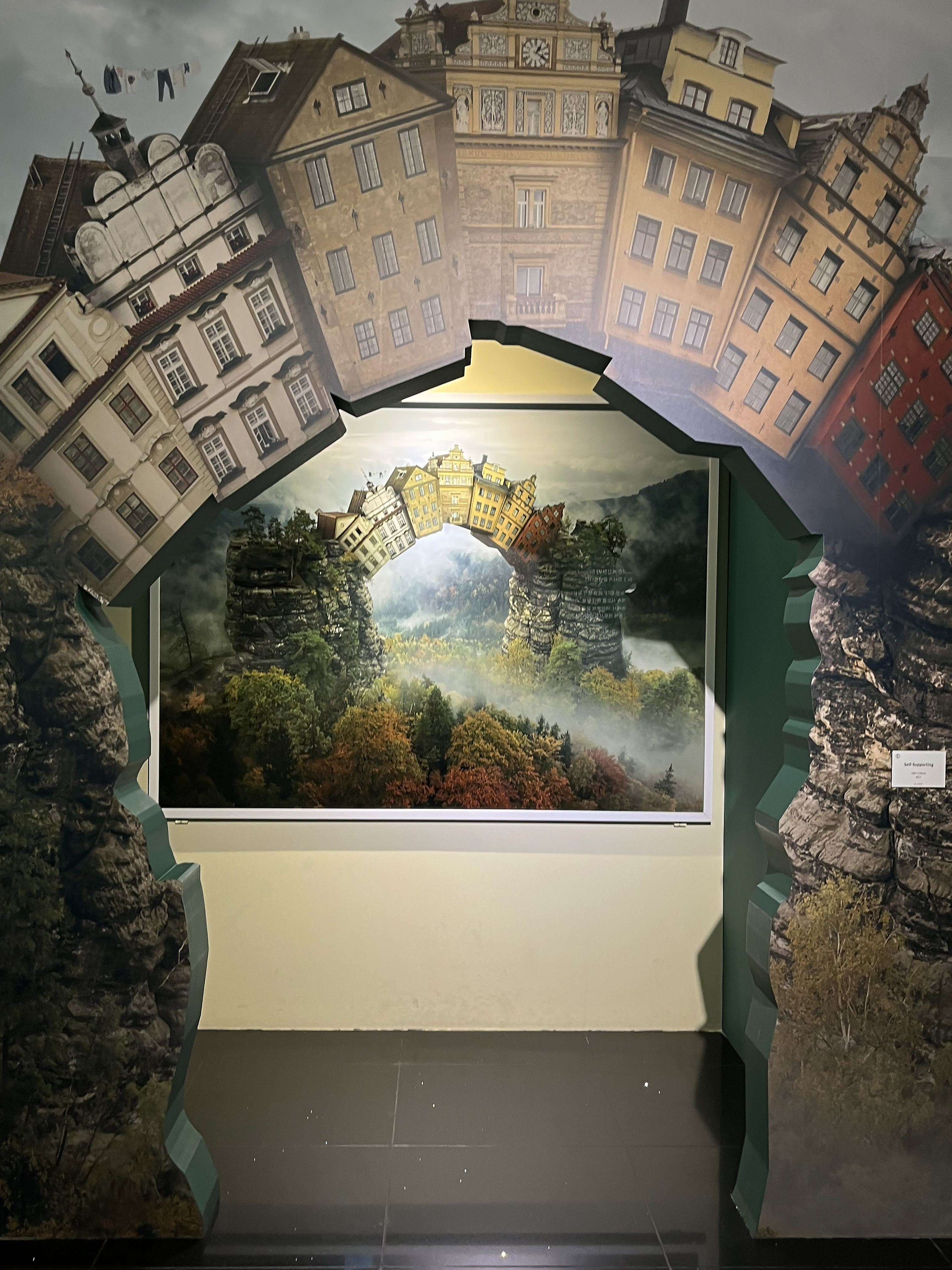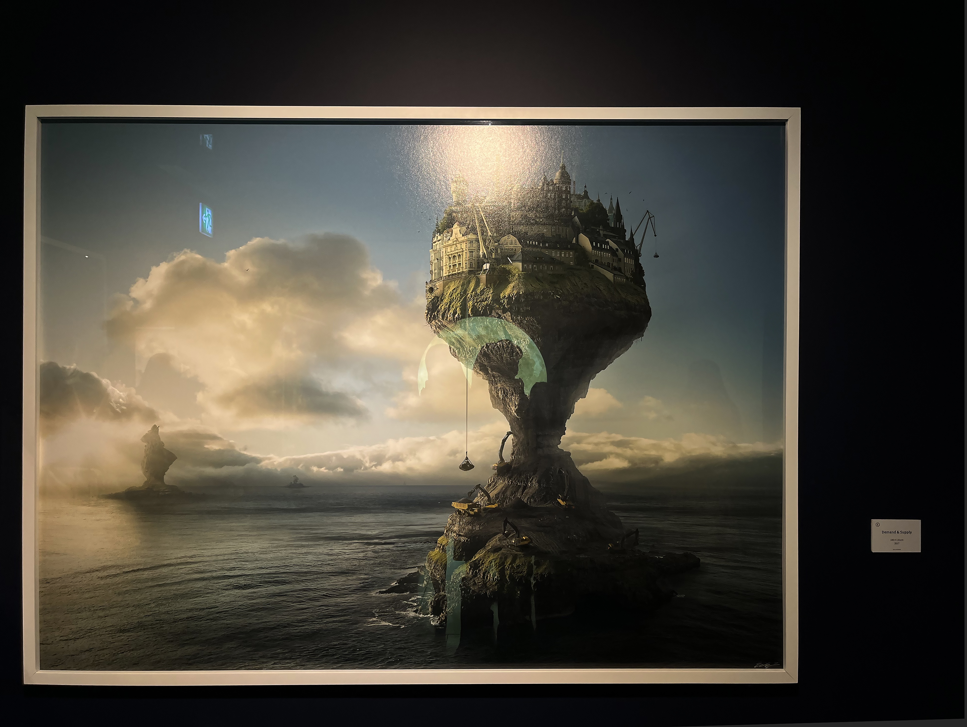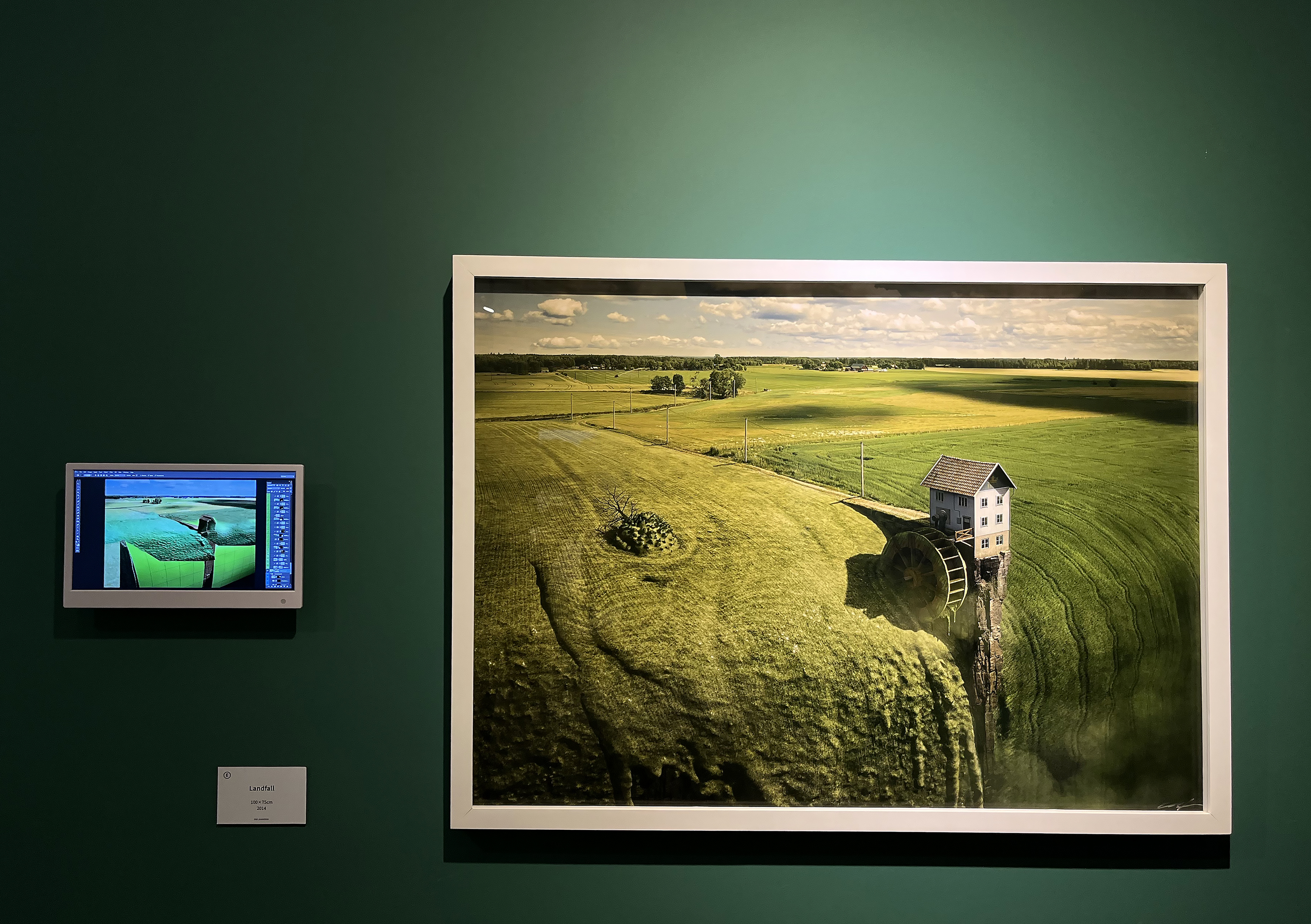 벼랑 끝에 흘러내리는 집, 물고기 위에 있는 마을, 당장이라도 아슬아슬해서 쓰러질 것 같은 바닷속 섬의 외관을 아름답게 하기 위해 땅을 파내고 있는 모습들과 같이 비현실적이고 독특한 사진 작품일수록 바로 그 옆에 붙어 있는 작업 모니터를 더 오랫동안 관찰하고 서 있었는데요. 많게는 300장의 레이어를 사용해 사진을 편집한다고 하니 그 정교함이 정말 어느 정도인지 가늠하기 쉽지 않은 것 같습니다.