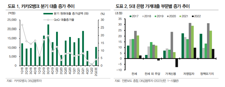 이 팀장은 카카오뱅크에 대해 증권가에서는 대부분 높은 목표 주가순자산비율(PBR)을 적용해 목표주가를 제시하는 경우가 많았는데, 자기자본이익률(ROE) 수준이 낮고 고성장주라는 점에서 목표 주가수익비율(PER)을 적용해야 한다고 생각했다. 그리고 은행으로 인가 받고 대출 위주로 영업하는 이상 성장폭은 유지되더라도 성장률은 크게 하락할 수밖에 없다고 예상했다. “정부에서 카카오뱅크 IPO 전후부터 중저신용자 대출비율 상향을 주문하면서 성장성에 큰 악영향을 받을 것으로 봤습니다. 한국의 가계부채비율이 높은 상황을 감안하면 카카오뱅크가 기존 은행들과 비교해 가져갈 초과성장의 폭은 IPO 전후 기대 보다 높을 수 없다고 봅니다.”