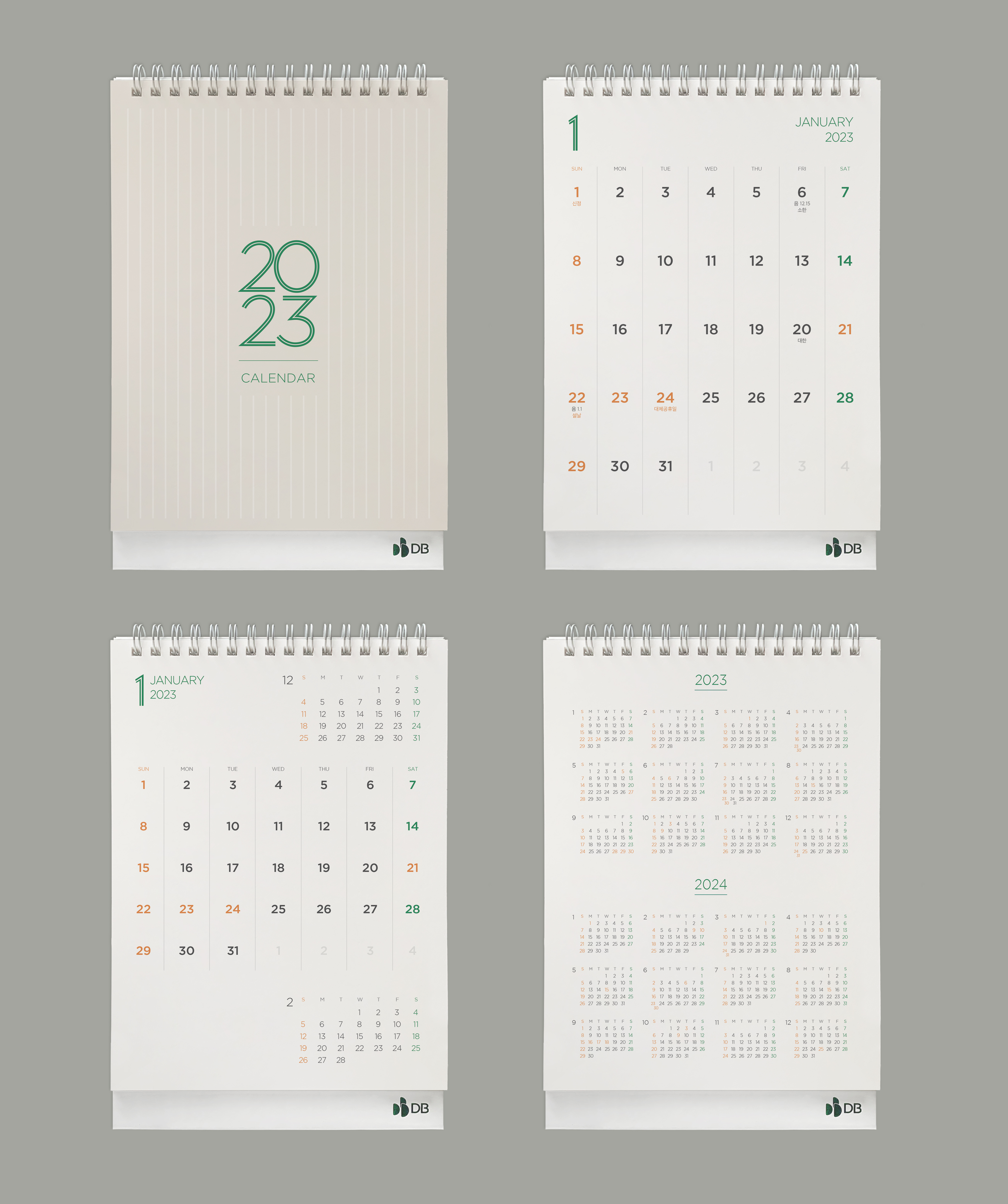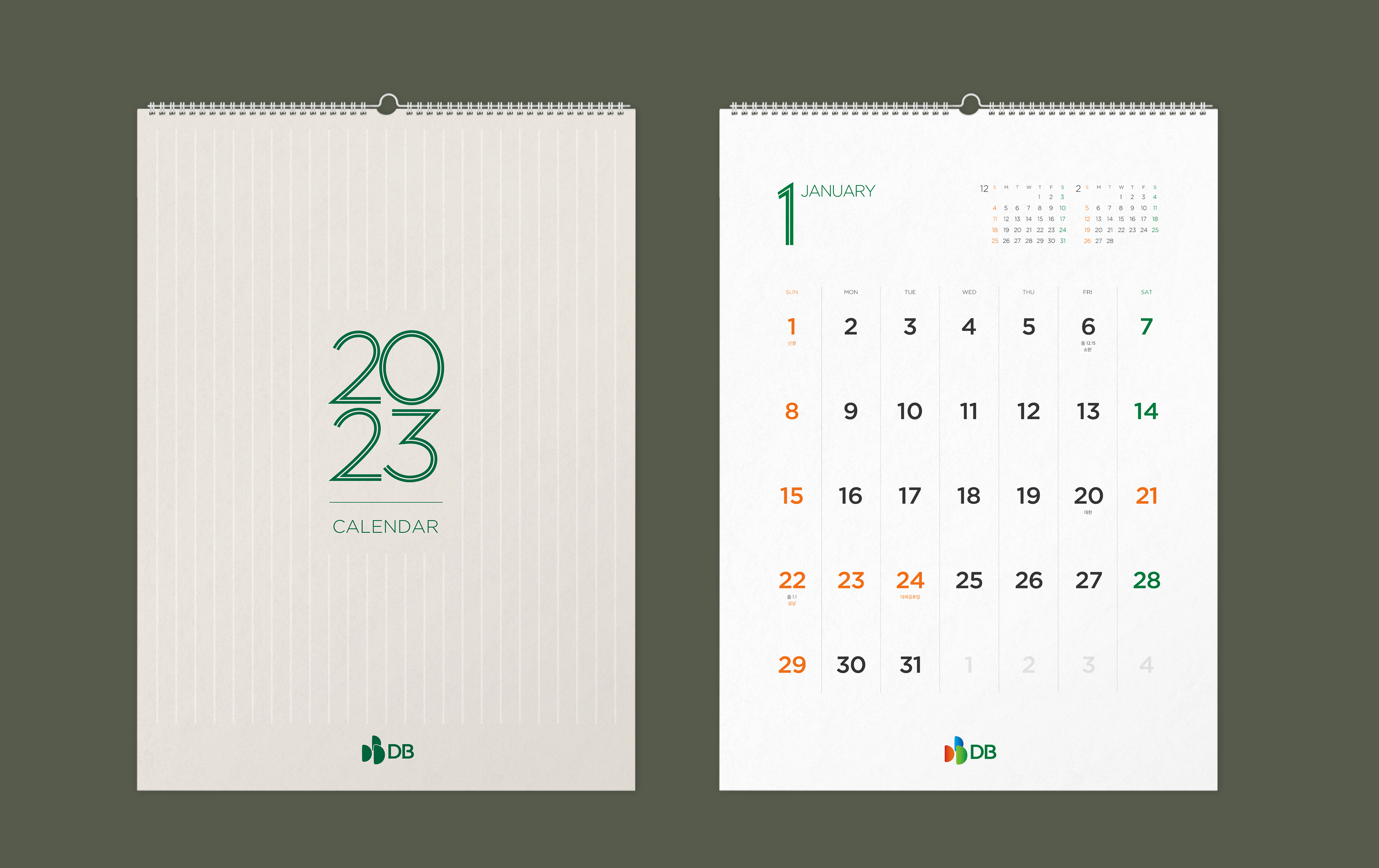 2023년 탁상용캘린더는 데스크에 올려놓기 부담 없는 사이즈입니다. 간결한 모노톤 표지와 삼각대에 DB그룹의 컬러인 녹색을 포인트로 넣어 그룹 아이덴티티를 나타냈고, 메모용 공간을 충분히 확보하기 위해 내지 디자인 시 세로선을 활용, 일별 구분할 수 있도록 하였습니다.