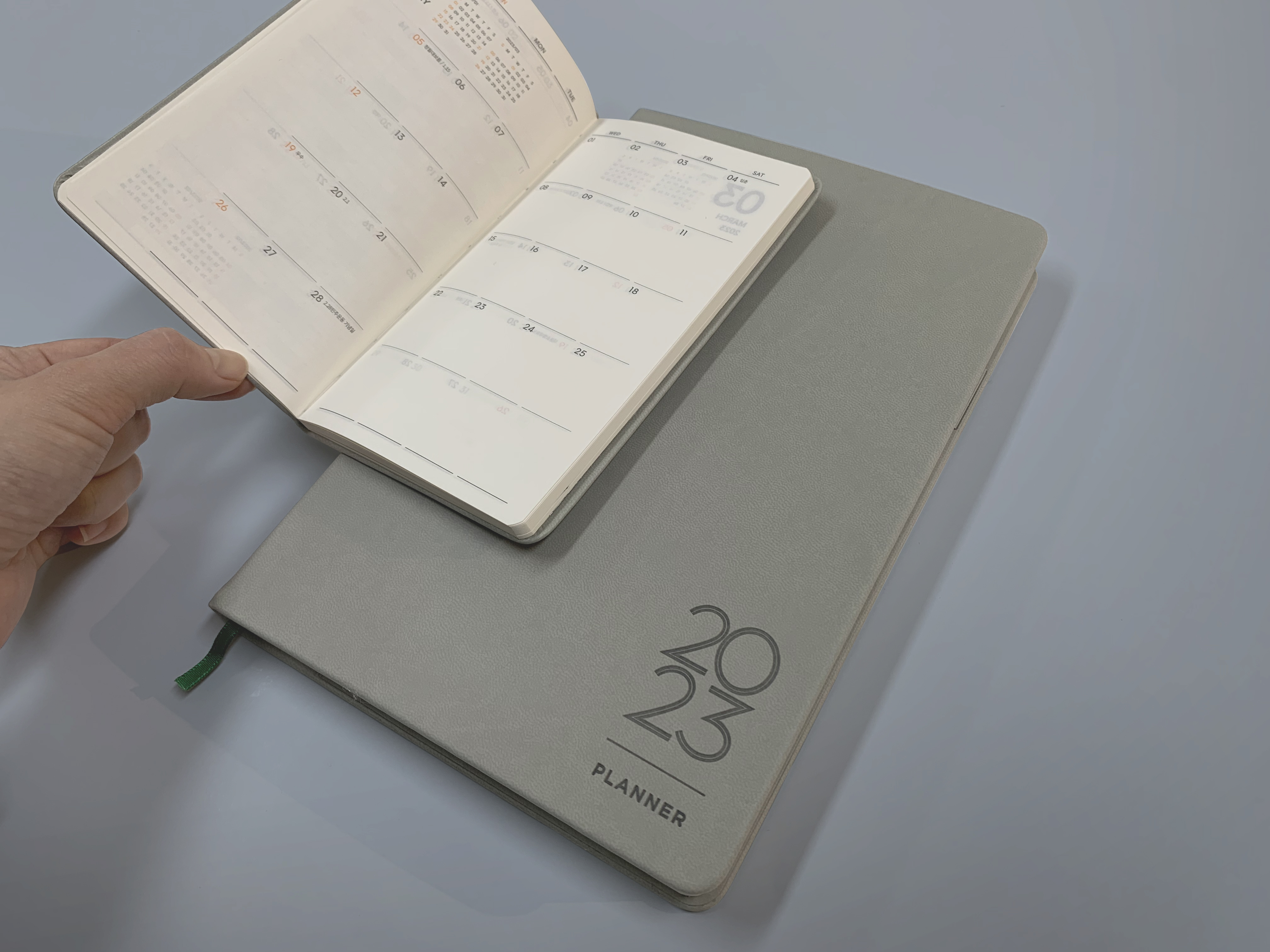 다음은 디자인 상세 수정 및 추가 샘플 제작, 컨텐츠 리뷰와 검수의 긴 과정이 기다리고 있습니다. 시안 선호도 조사에서 큰 디자인 모티브를 정한 다음, 표지의 녹색 박 인쇄가 가능한지, 스킨 소재는 제작에 적합한지 재검토하고, 펜꽃이 추가 등 세부 편의 사항들을 정합니다. 모든 과정을 거쳐 인쇄소에 데이터를 넘기면 제작을 시작합니다.