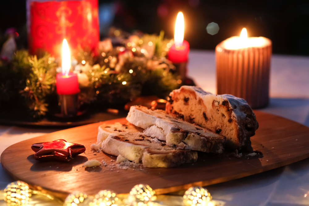 독일에서는 바이낙흐츠간스(Whihnachtsgans)라고 불리는 거위 요리와 ‘슈톨렌(Stollen)’을 크리스마스 시즌에 가장 즐겨 먹는다고 해요. 슈톨렌은 럼에 절인 과일, 설탕에 절인 과일 껍질, 견과류, 향신료를 넣고 구운 빵에 버터를 바른 후 슈가 파우더를 뿌려 먹는 독일식 과일 케이크인데, 마치 아기 예수가 요람에 있는 모습을 닮았다고 하여 더욱 큰 의미가 있는 빵입니다.