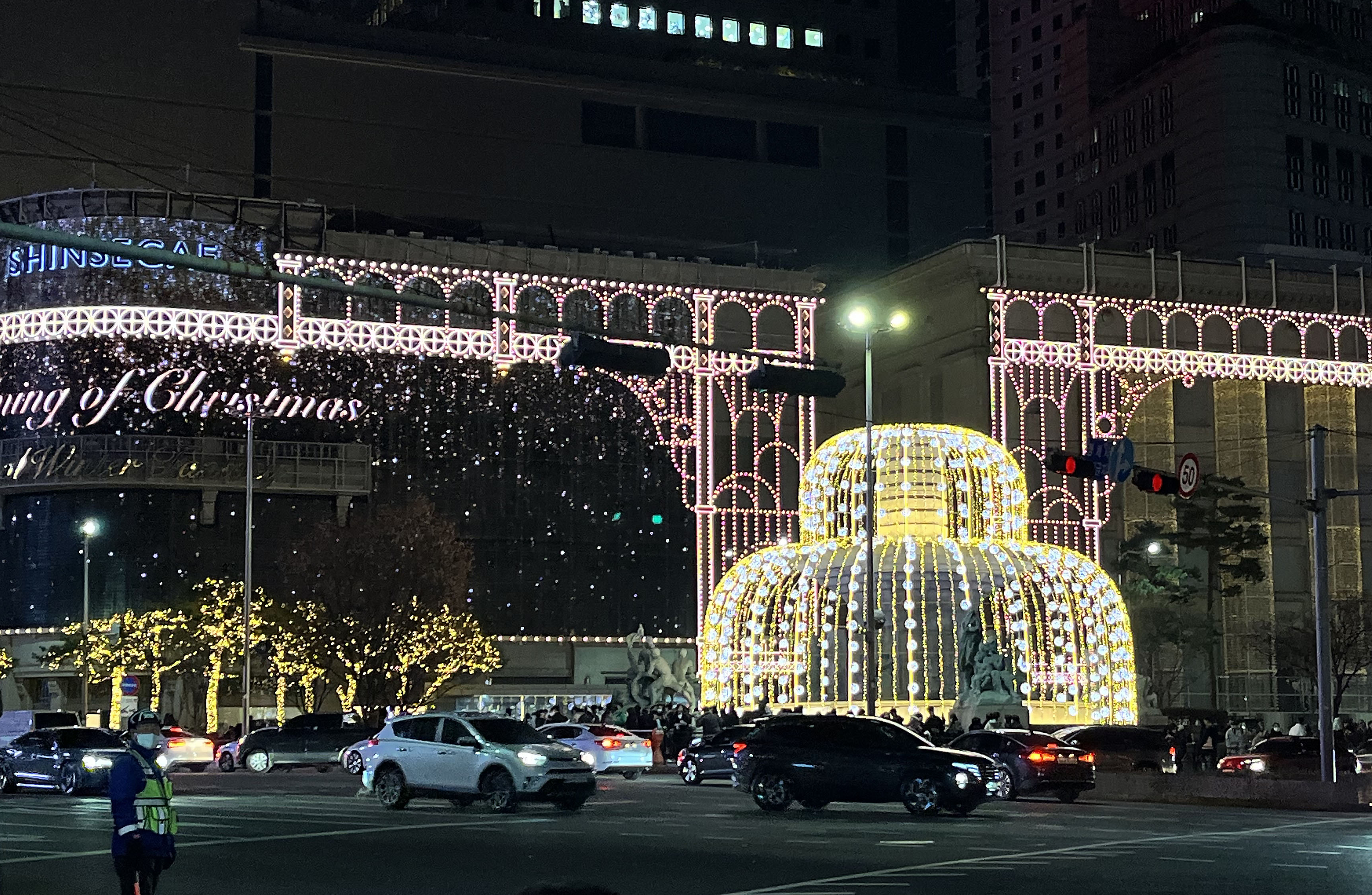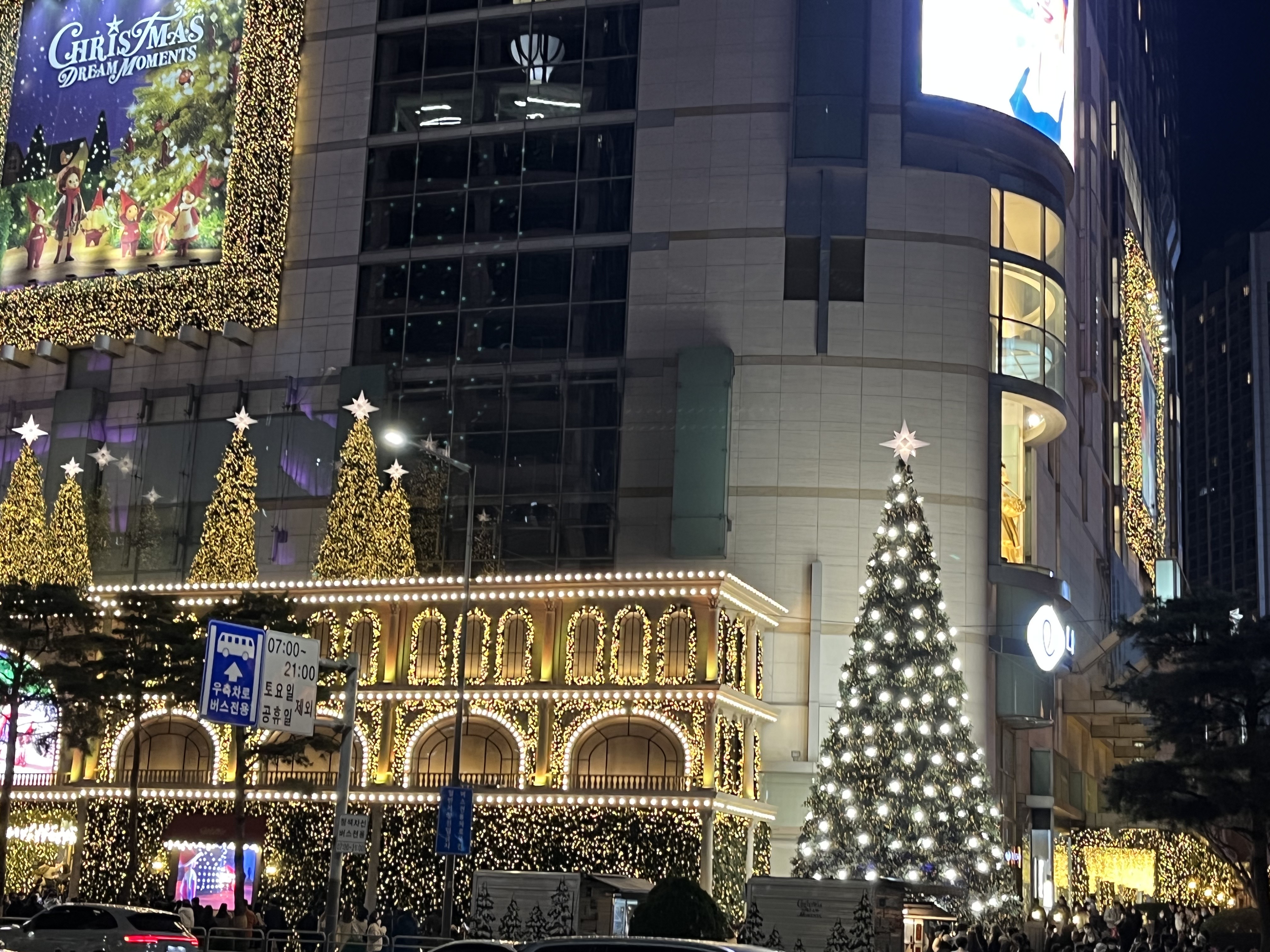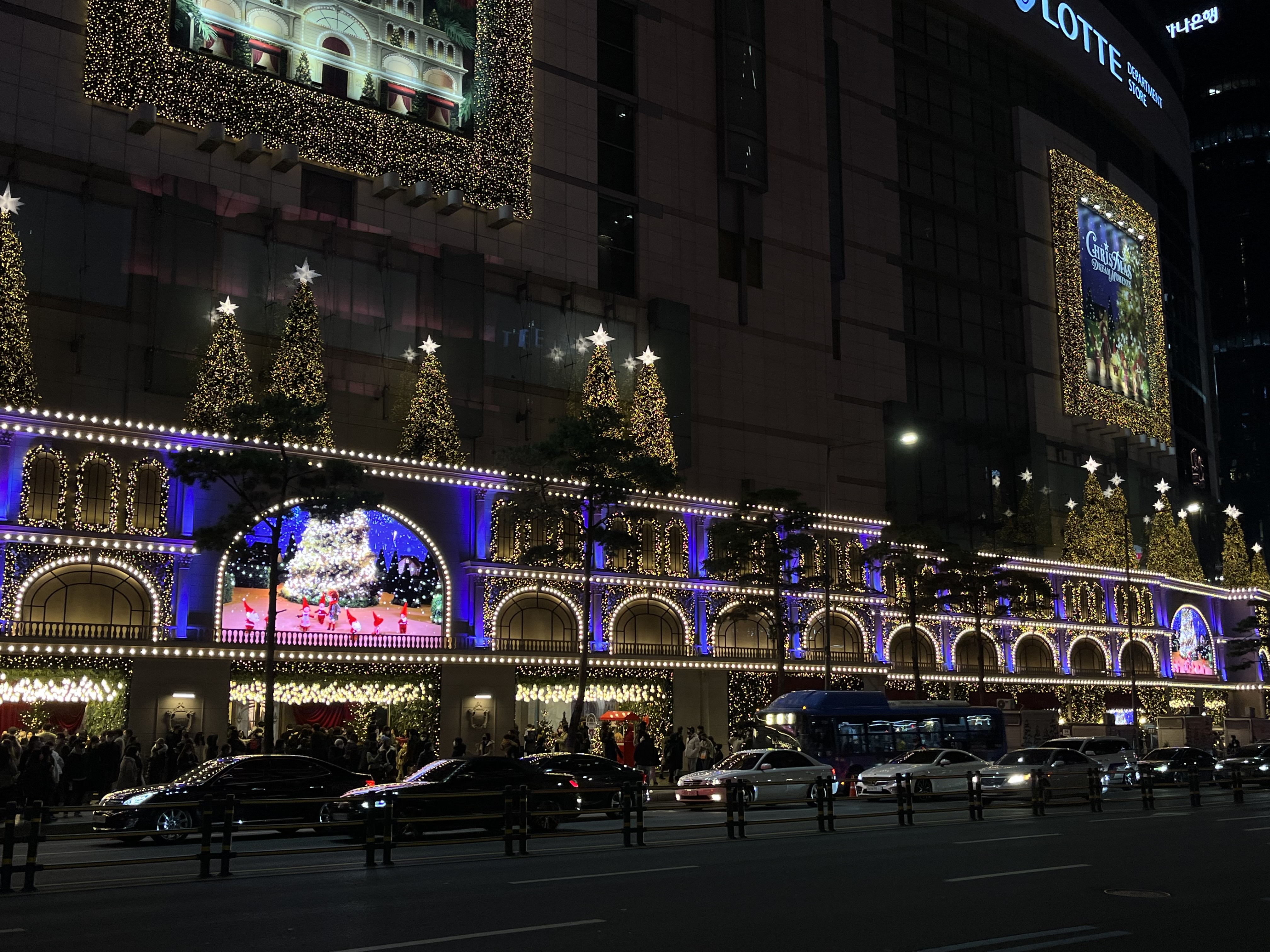 신세계 백화점 본점의 미디어파사드를 관람하셨다면 조금만 걸어 내려와 롯데백화점 본점도 꼭 보시는 것을 추천드립니다. 롯데백화점 본점은 신세계 백화점 본점에서 도보로 5분 거리 내에 위치해 있어 멀지 않은 곳에서 또 하나의 포토존을 만날 수 있는데요. 멀리서 롯데백화점이 보이기 시작할 때부터 건물 외벽에 성탄절 분위기기가 가득한 모습이 보입니다. 건물 앞쪽에는 커다란 트리가 있어 이 트리 앞에서 사진을 찍기 위해 줄을 서는 분들도 많이 계시더라고요. 트리가 알록달록한 색으로 고급스럽게 꾸며져 있어 인증샷 남기기 좋았어요.