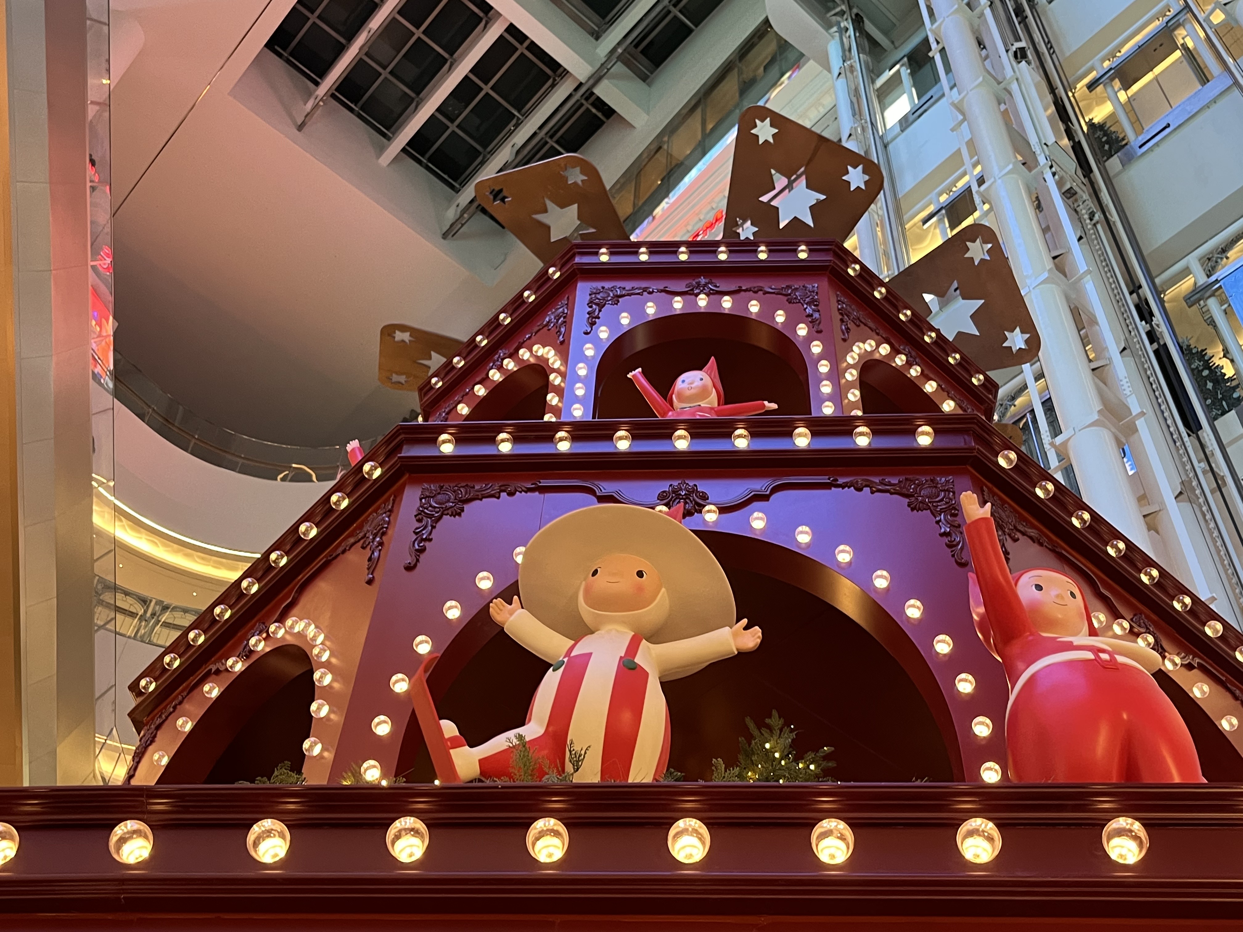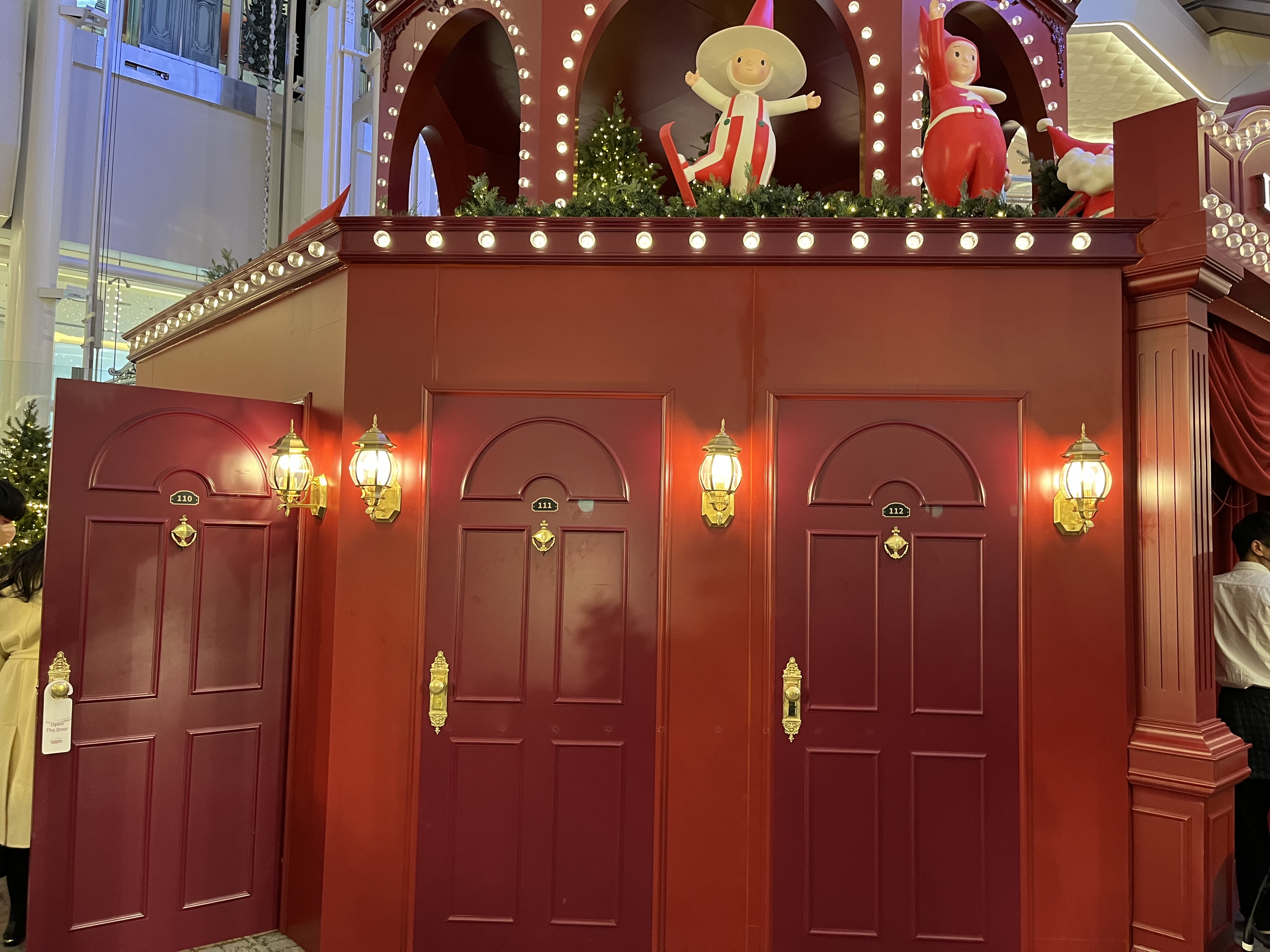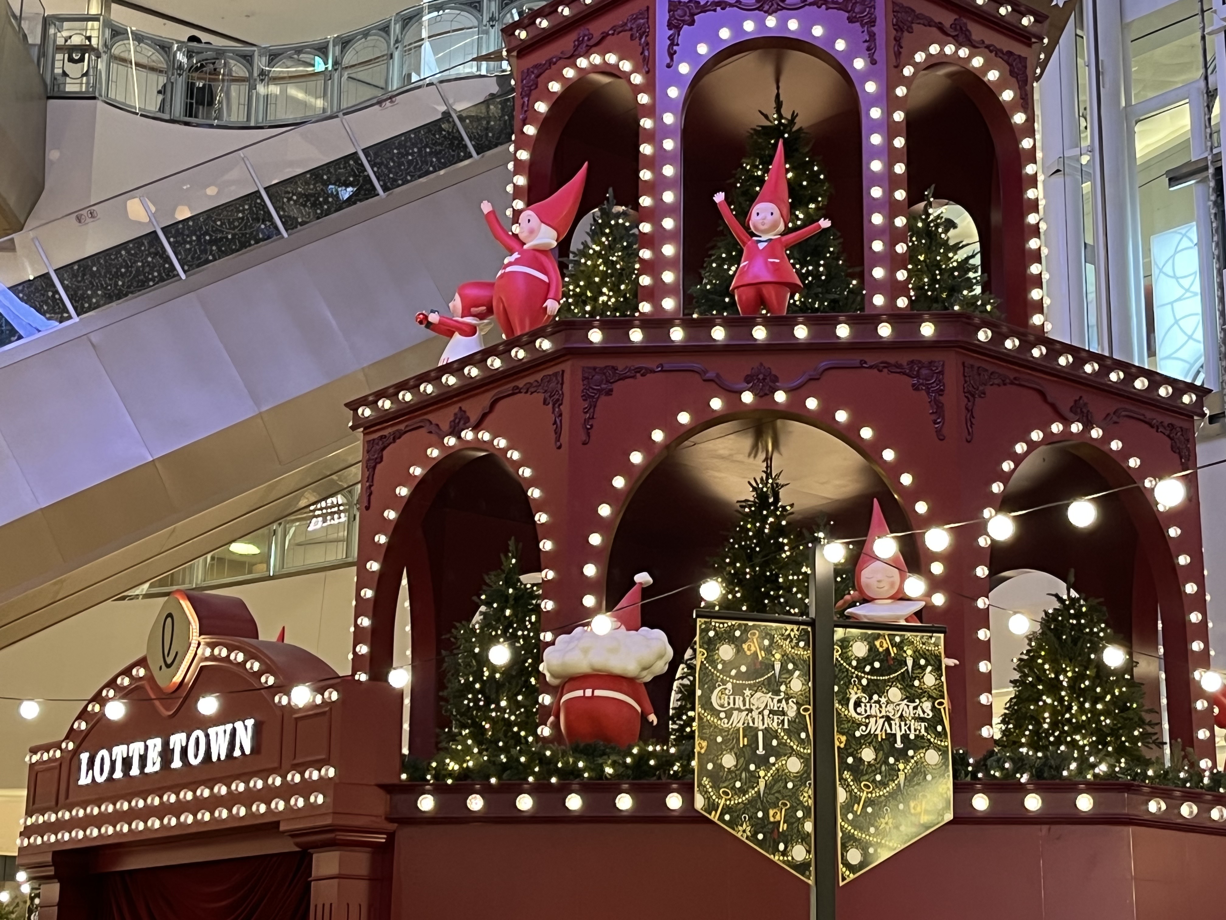 명동은 정말 크리스마스의 한복판이라고 해도 될 만큼 화려한 장식들이 많았었는데요. 잠실 역시 아쉽지 않은 수준의 즐길 거리가 가득하답니다! 잠실역에서 유니클로가 있는 쪽의 롯데월드몰 1층 대형 이벤트 홀로 들어가면 눈앞에 놀이동산이 펼쳐집니다. 3단 케이크 같기도 하고 트리 같기도 한 이 건축물의 2,3층에는 귀여운 요정 똔뚜가 빙글빙글 돌아가며 춤을 추고 있어요. 맨 아래층에는 호텔 객실 문이 여러 개 있는데 이 중 몇몇 개의 방문을 열어보면 저마다의 컨셉에 맞춘 무언가가 숨어 있으니 방문도 한번 직접 열어보세요. 빨간 커튼을 열고 들어가면 화려한 은하수 같은 알전구들이 가득한 공간으로 들어갈 수 있습니다. 이곳 역시 사진을 찍지 않고 나온다면 섭섭할 정도로 화려하고 예쁘답니다.