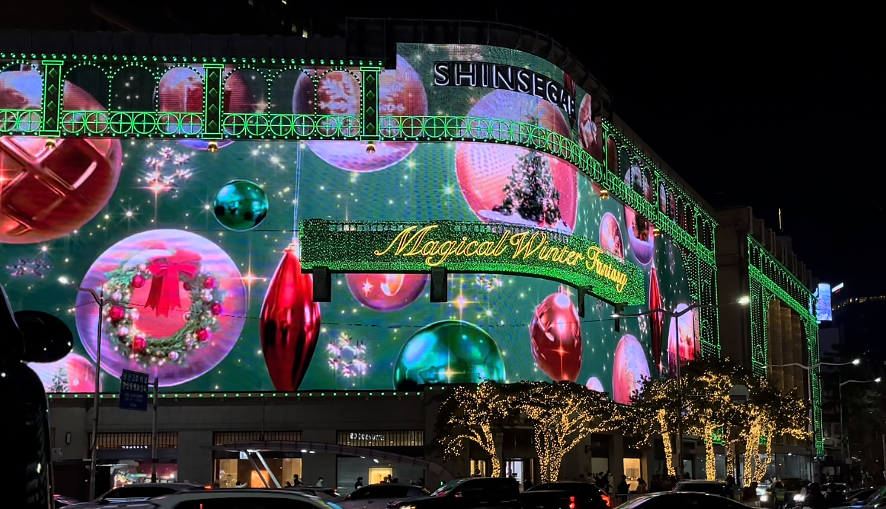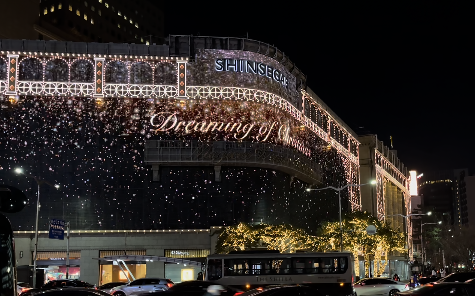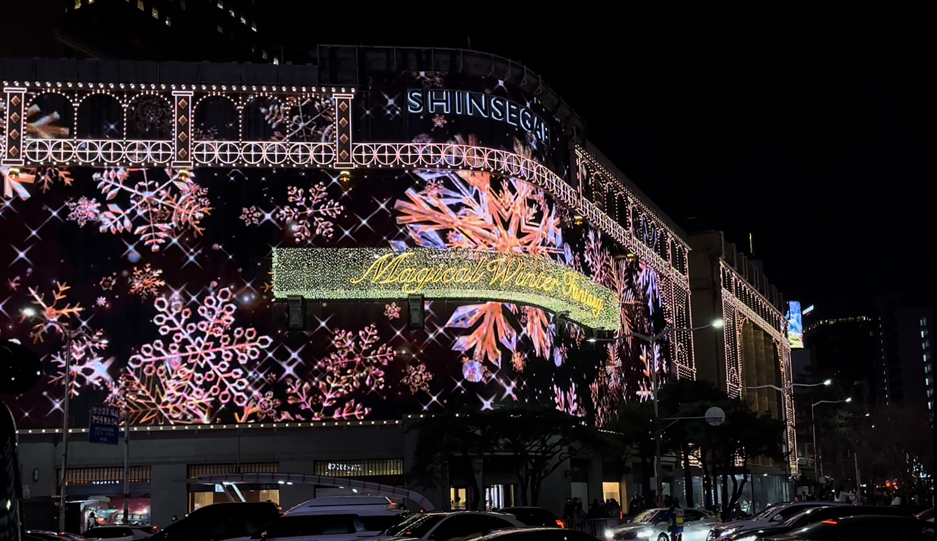 신세계백화점의 미디어파사드는 2021년 겨울 많은 사람들을 놀라게 한 것 같아요. 건물 외벽 전면을 감싸는 미디어아트가 송출되니까 그 규모가 얼마나 화려하고 컸는지 말도 못하게 충격적이었어요.