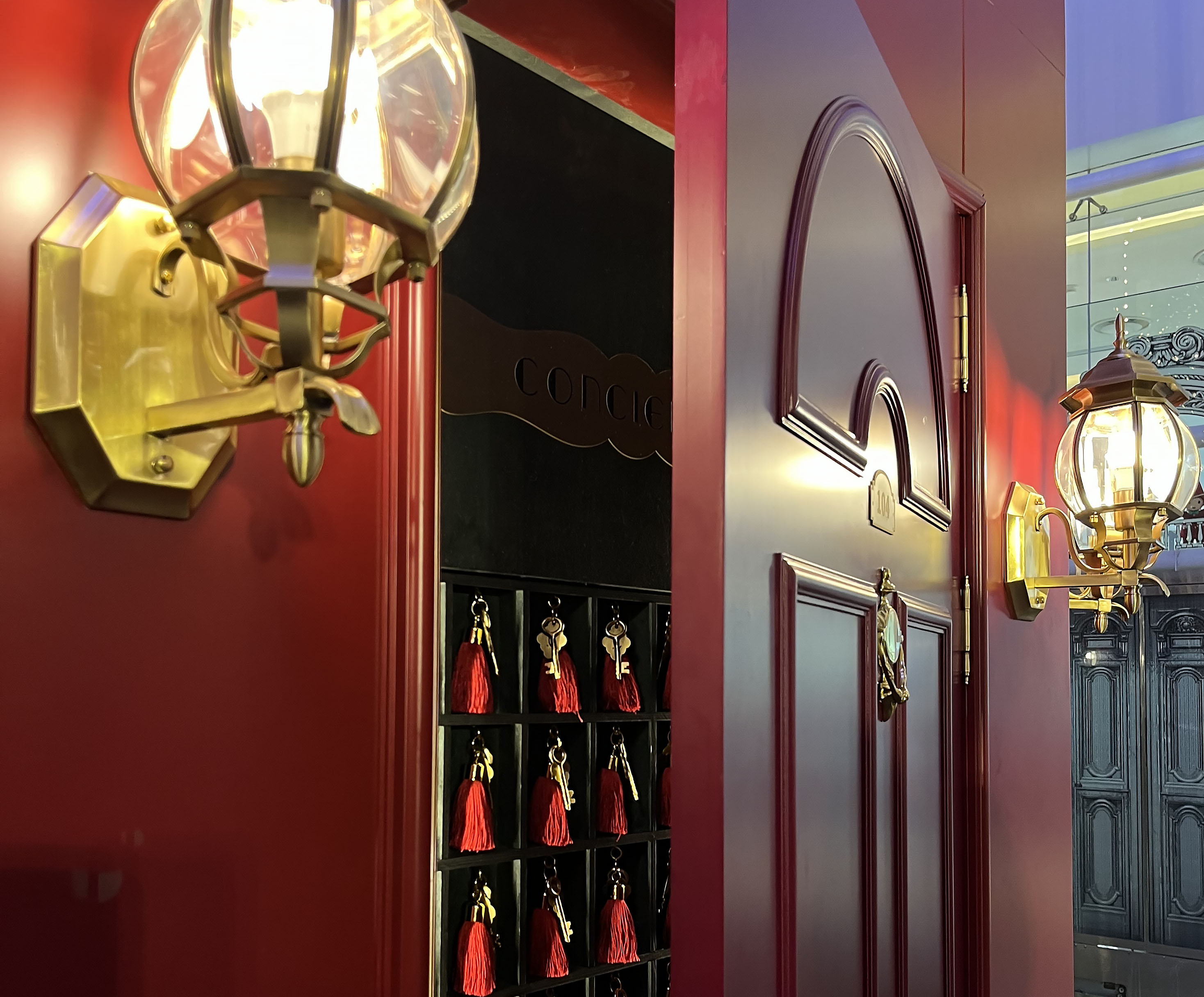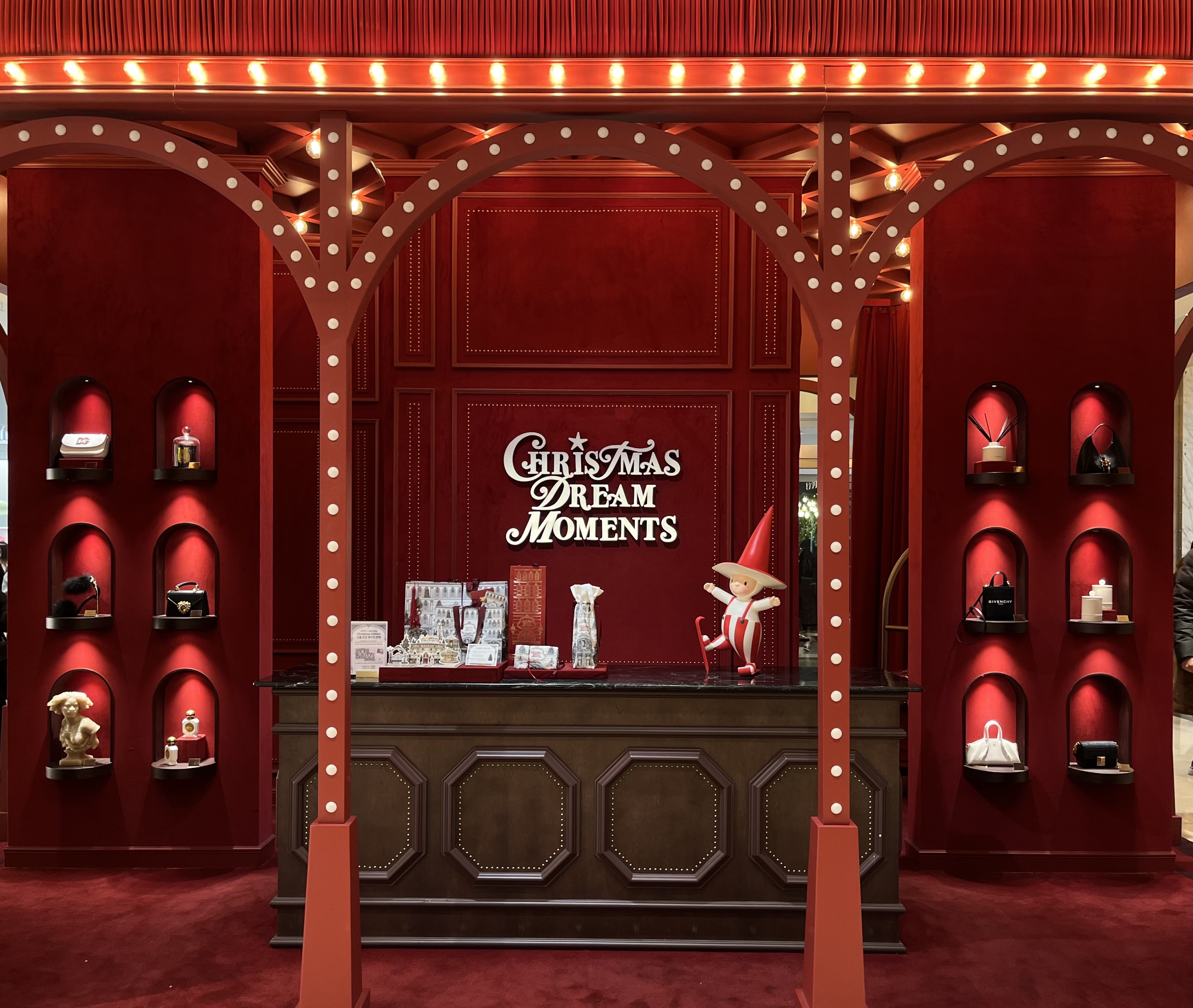 정문 입구로 들어가면 바로 보이는 포토존 또 하나! 호텔 객실에 들어온 것 같은 빨간 연출이 눈에 강렬하게 들어오는데요. 크리스마스 하면 떠오르는 상징적인 컬러 레드를 정말 제대로 활용한 것 같은 롯데백화점 본점이었습니다. 이 붉은 컨셉의 컨시어지 데스크는 직접 데스크 뒤로 들어가 연출 사진을 찍을 수 있는데요, 밀랍인형이 서 있는 앞쪽뿐 아니라, 바로 뒤쪽에도 컨시어지 데스크가 연출되어 있어 앞면 뒷면 두 가지의 인증샷을 찍으실 수 있어요. 생각보다 줄이 금방 빠져서 대기가 길지 않았답니다.