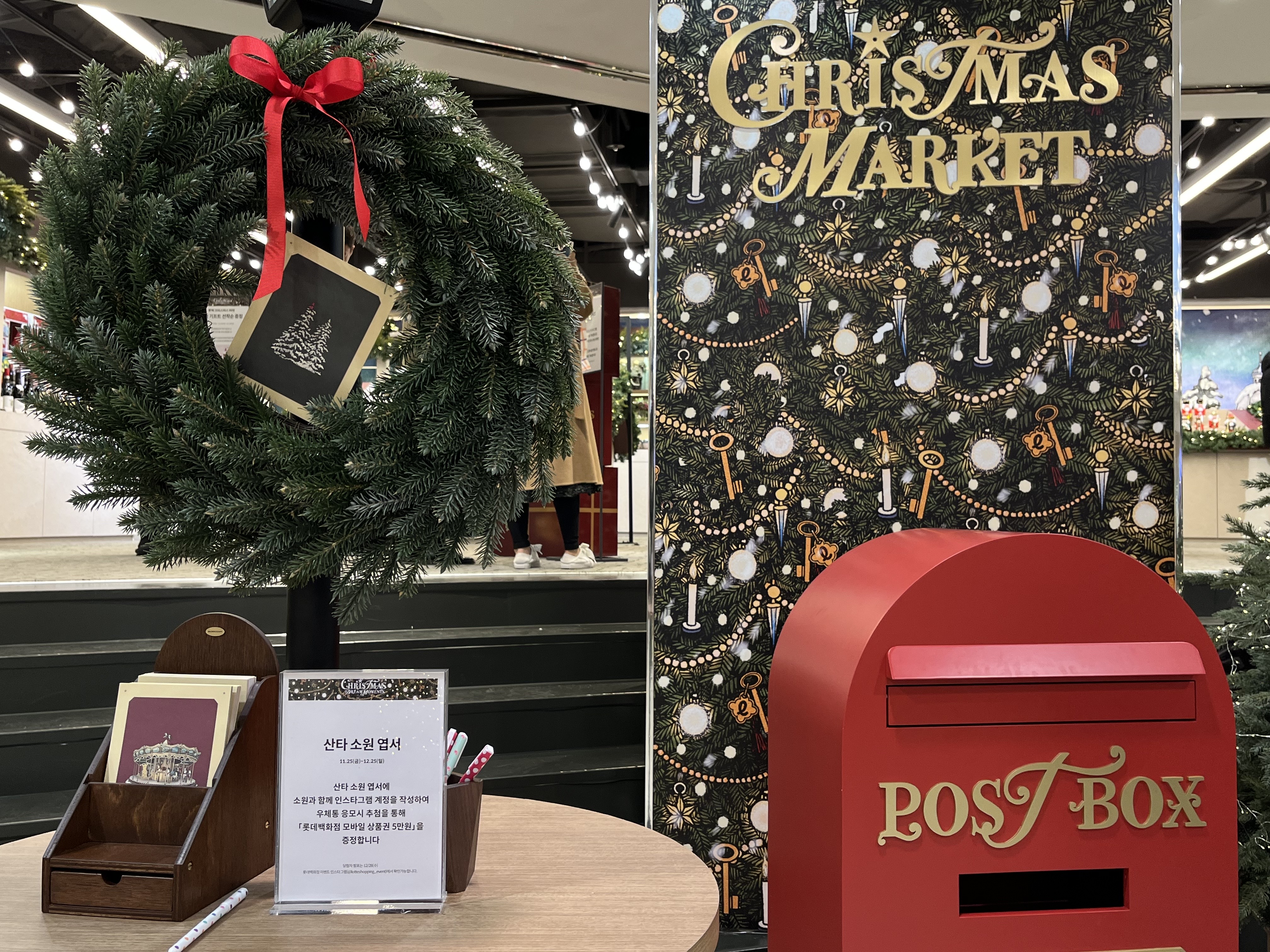 크리스마스 마켓 앞의 우체통! 이곳에서는 새해 소원을 카드에 적어 산타에게 보낼 수 있습니다. 산타에게 소원을 적어 우체통에 넣고 인증샷을 SNS에 올리면 추첨을 통해 5만원 상당의 롯데백화점 상품권도 준다고 하니까 참여하지 않을 이유가 없겠죠?