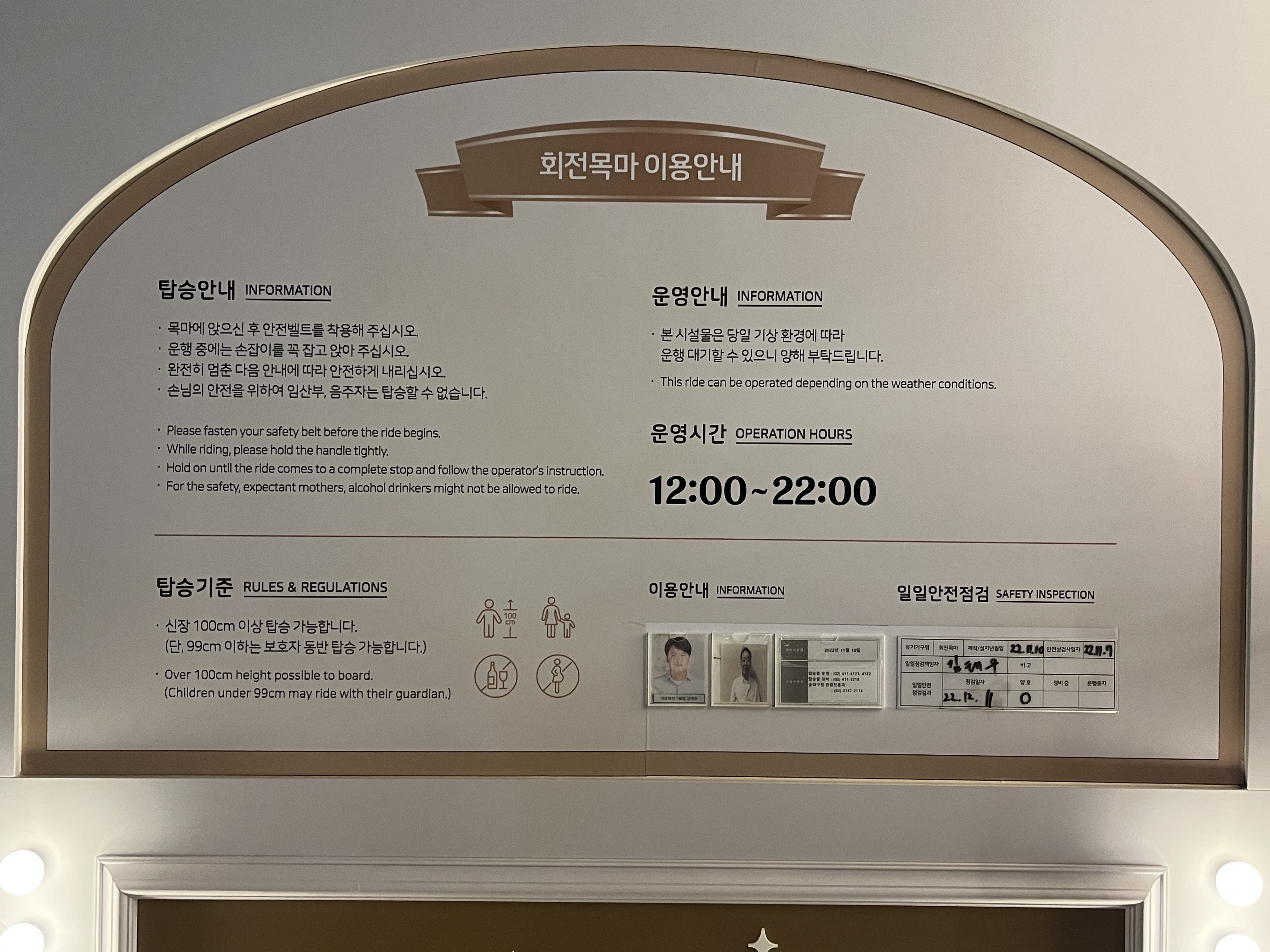 개인적으로 낮보다는 저녁에 타야 놀이동산의 환상이 가득한 느낌에 퐁당 빠져들 수 있지 않을까 싶은데요. 낮에 산 영수증이더라도 근처 식당이나 카페를 이용하거나 볼 일을 보고 난 후 저녁에 회전목마를 타는 것도 좋은 방법일 것 같습니다.