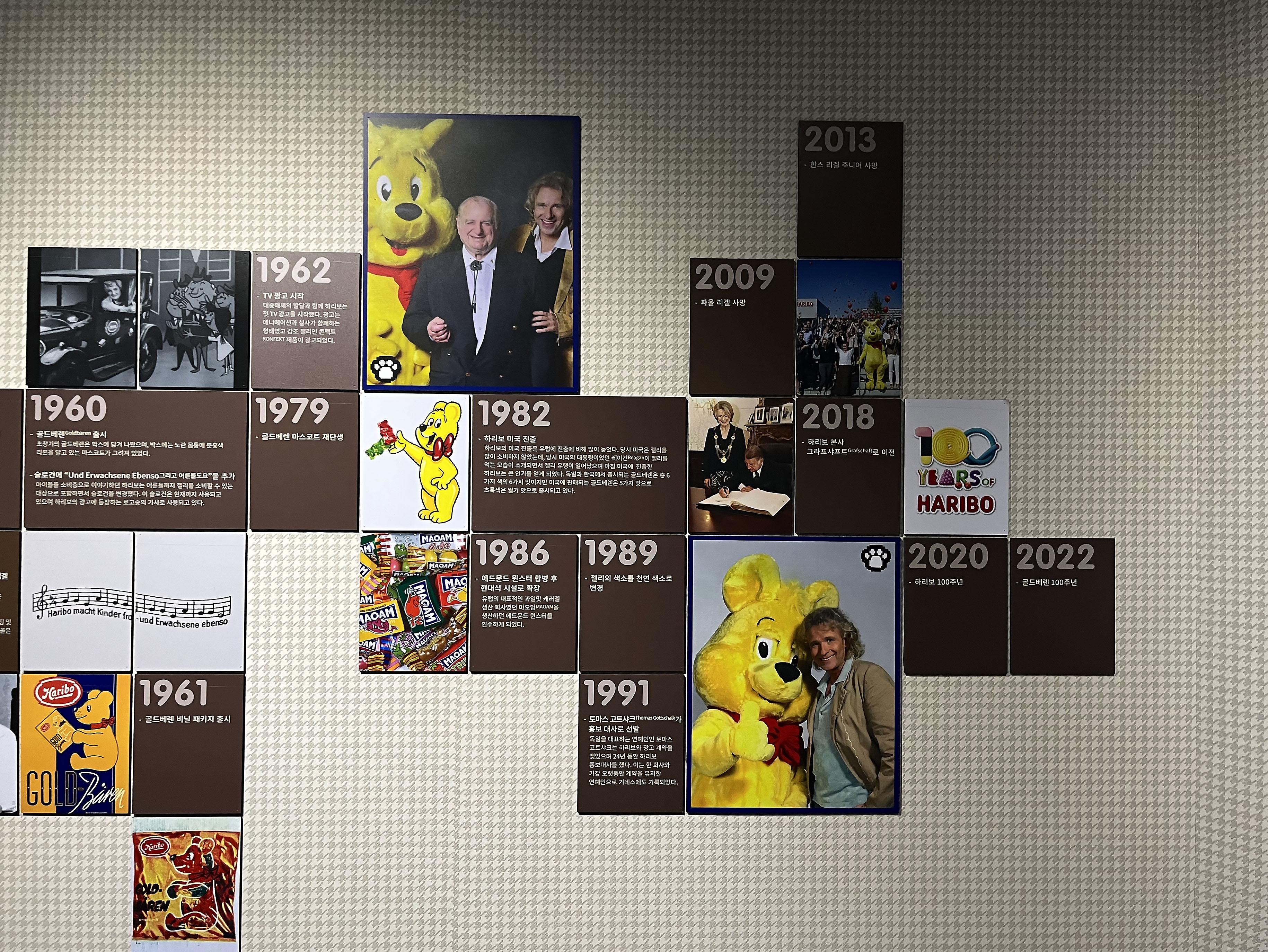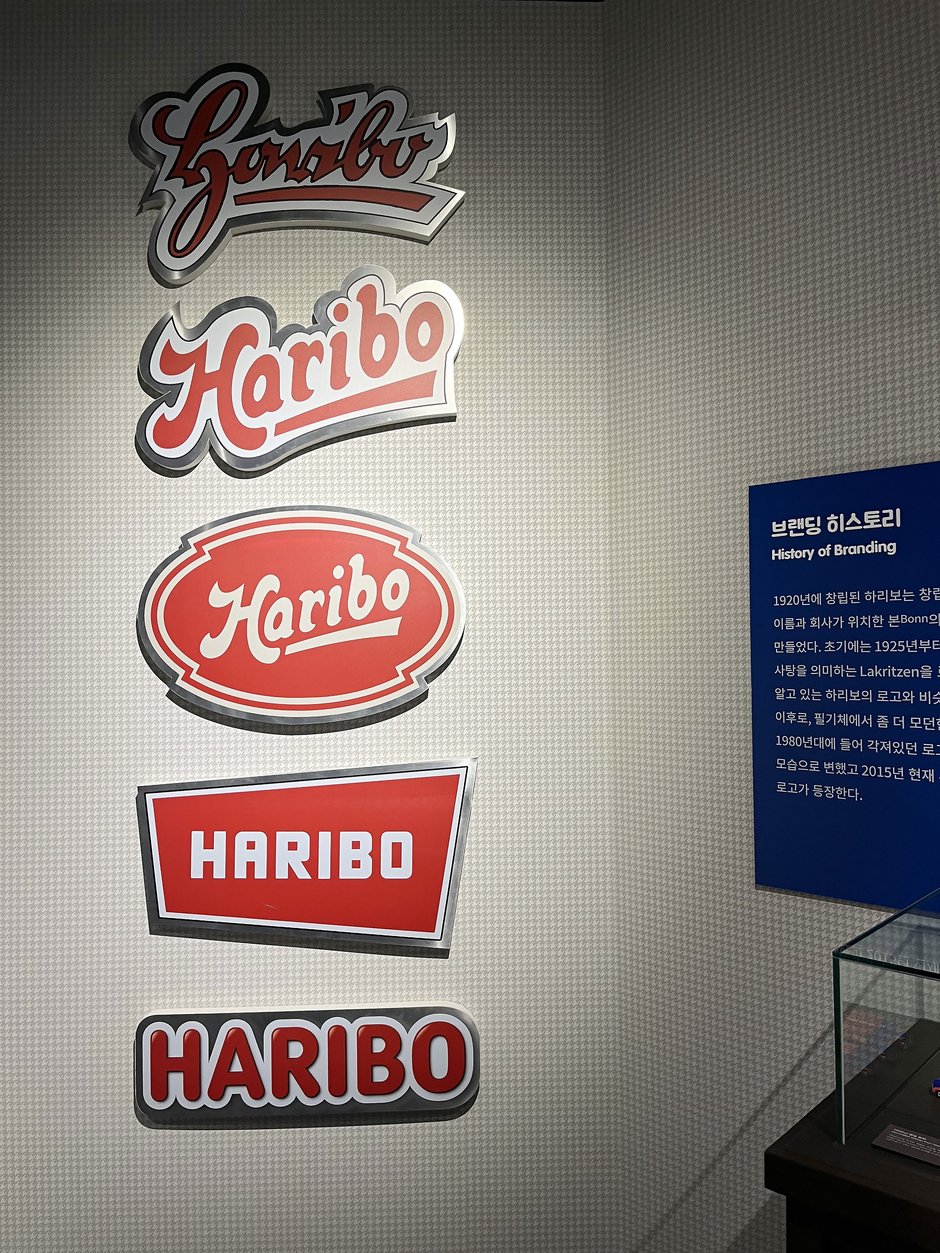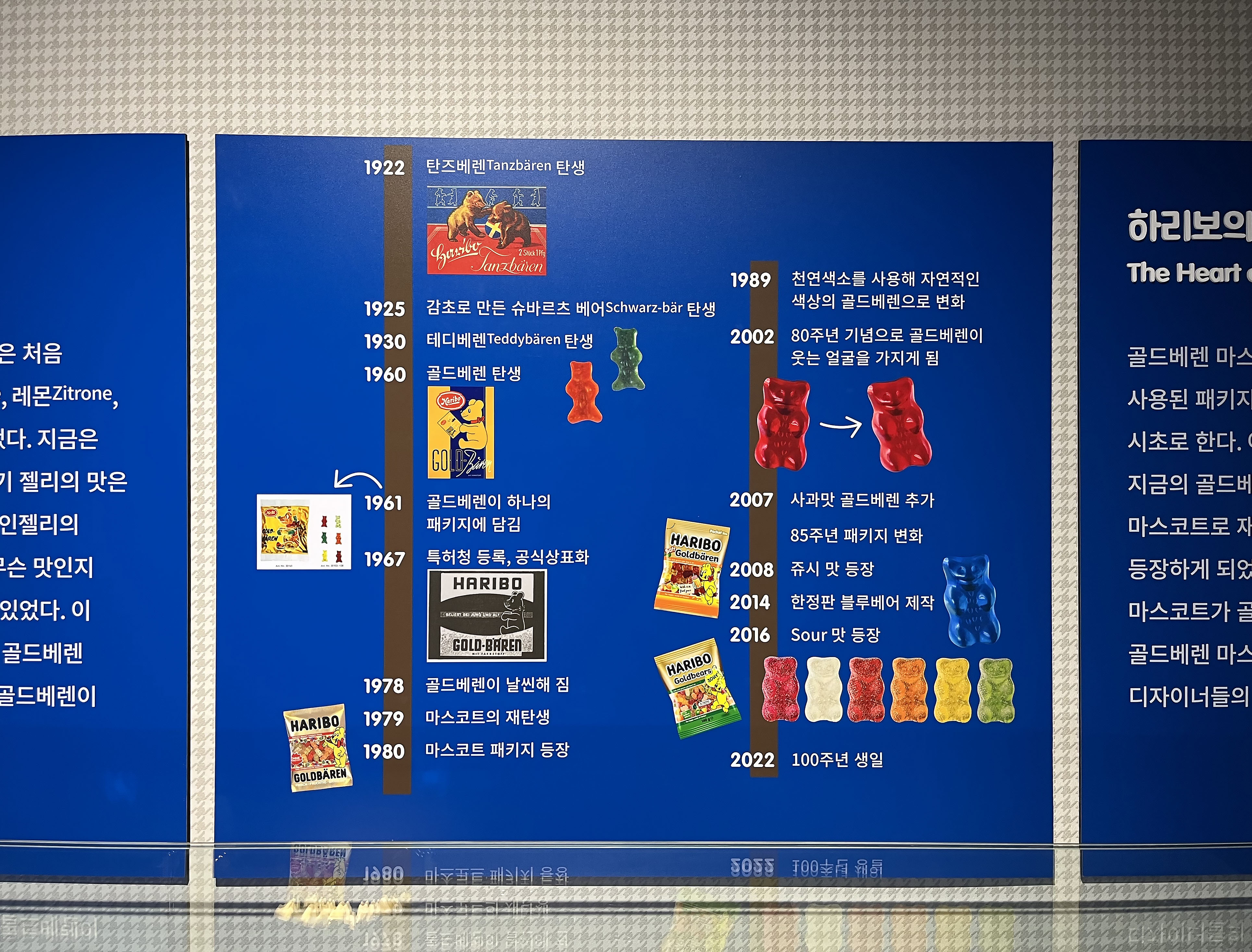 하리보의 로고는 1960년대 이후로 필기체에서 조금 더 모던한 느낌의 형태로 디자인이 바뀌기 시작하며 1980년대에 들어서는 로고의 폰트까지 동글동글한 모습으로 변하였다고 해요. 우리가 지금 알고 있는 로고는 2015년부터 등장했답니다. 이 외에도 하리보 골드베렌의 탄생과 업그레이드, 변화까지의 일대기를 한눈에 볼 수 있게 연표로 정리되어 있었어요.