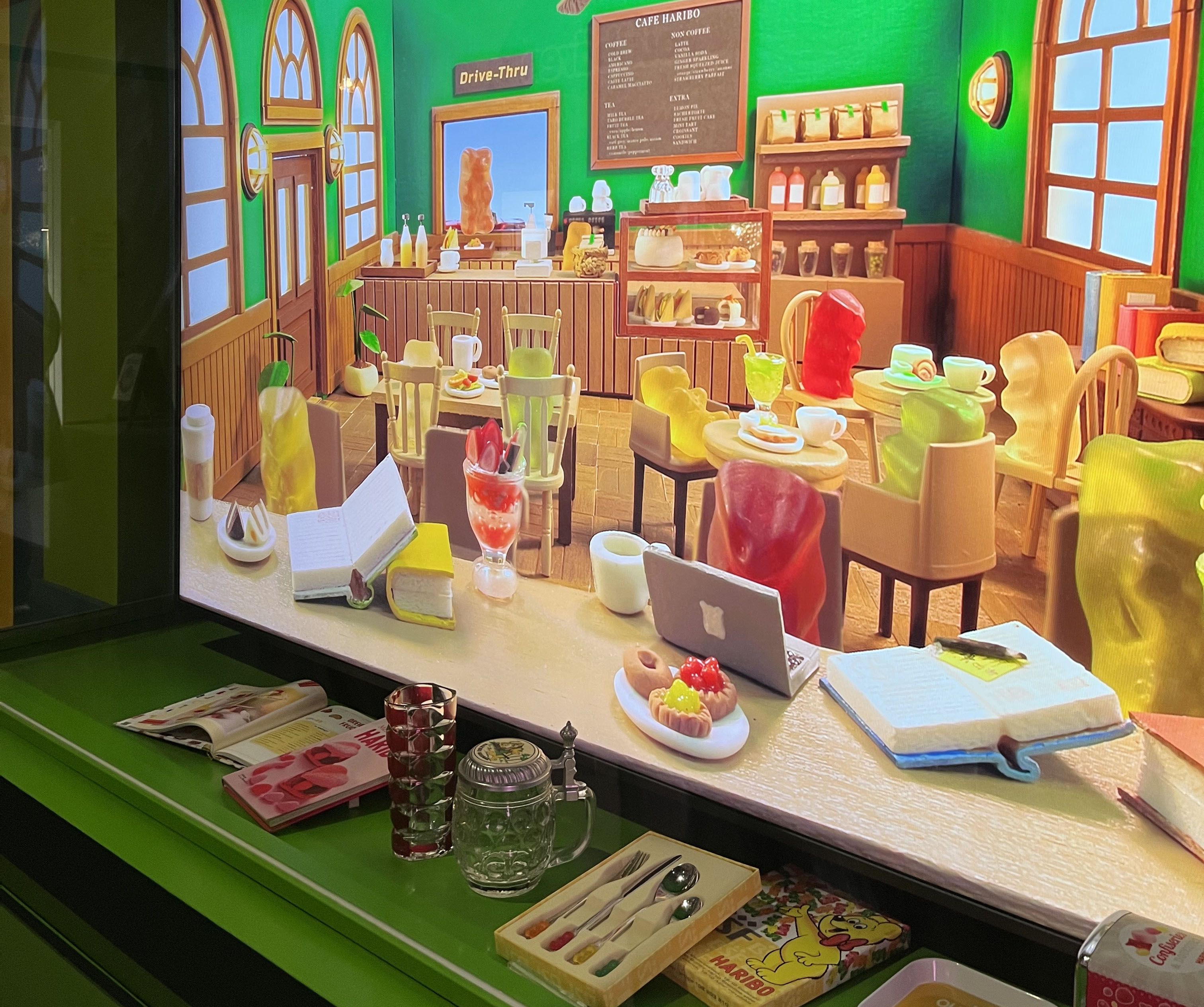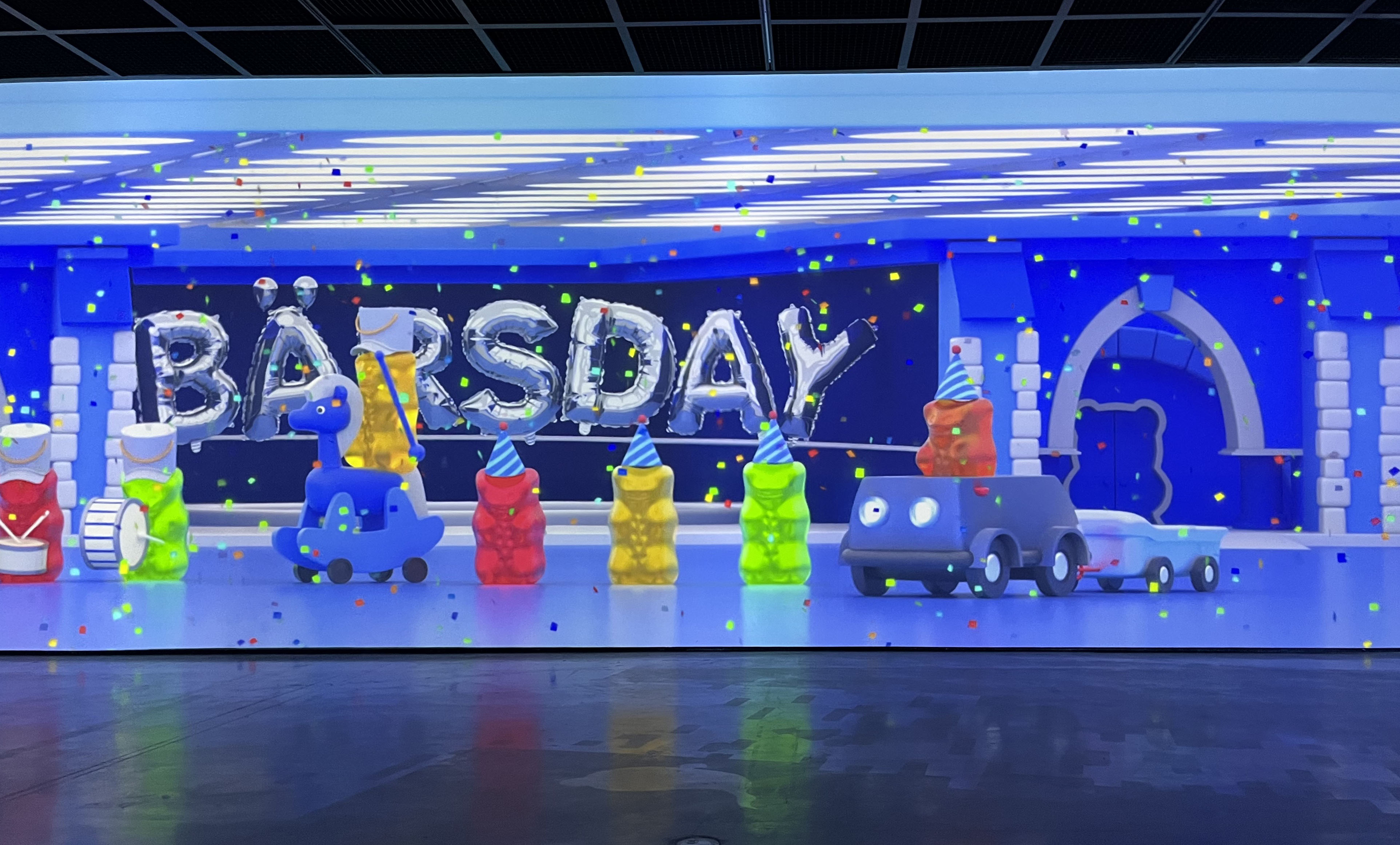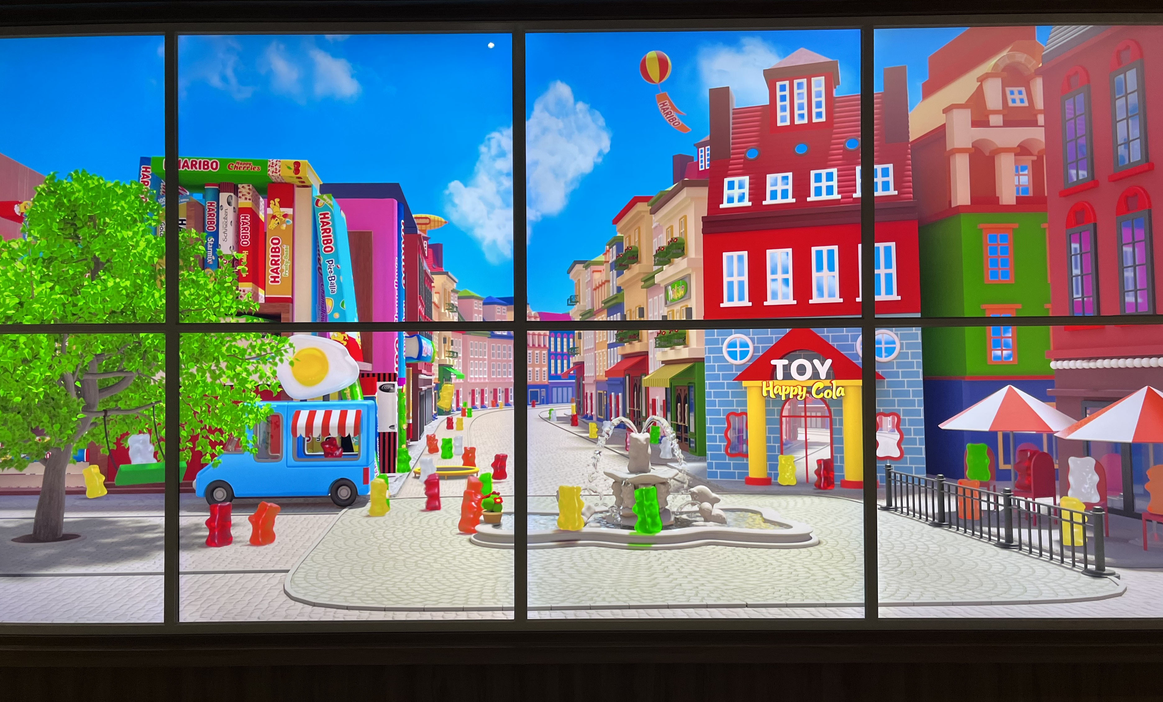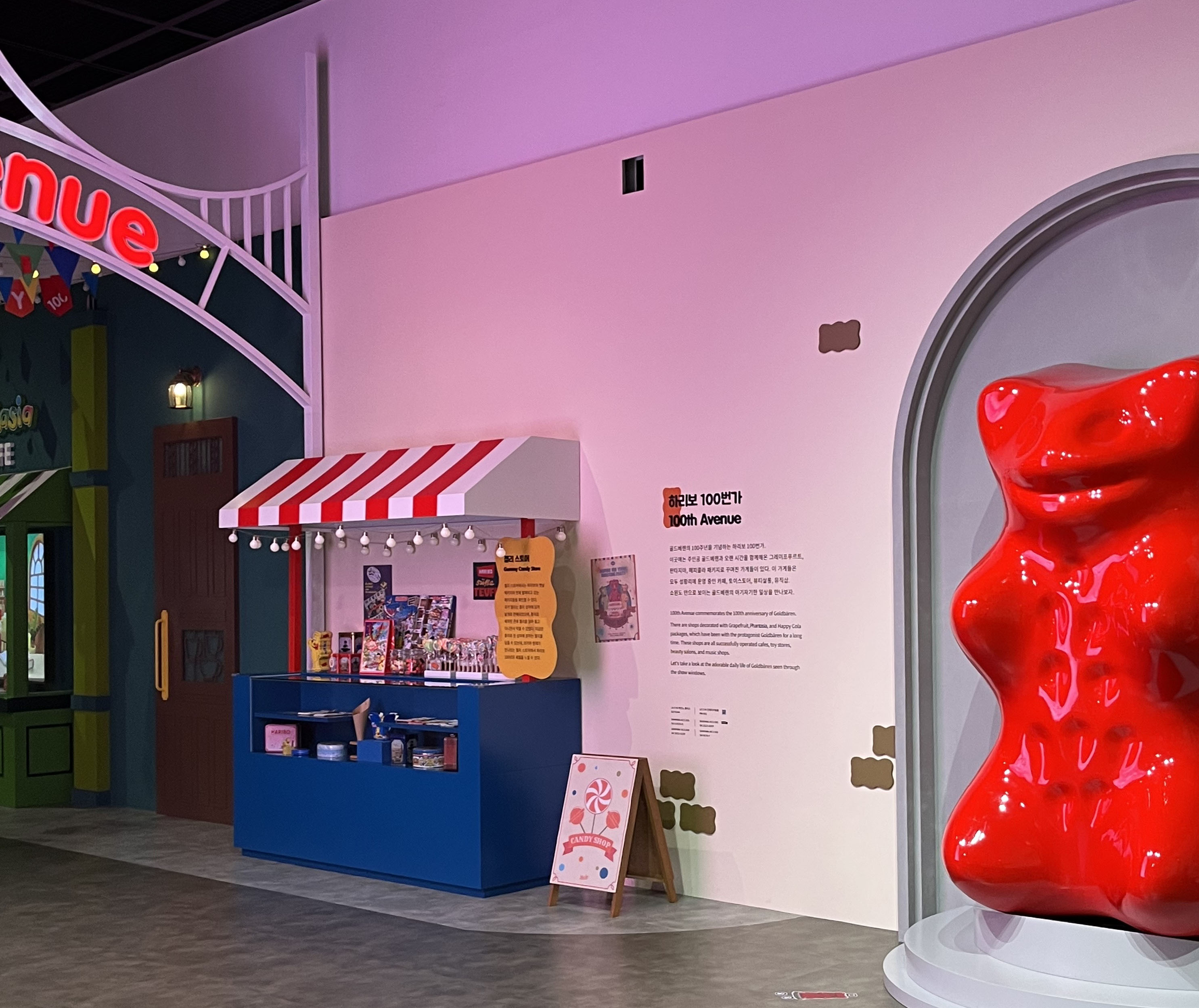 골드베렌의 100주년을 기념하는 하리보 100번가. 이곳에는 주인공 골드베렌과 오랜 시간을 함께 해온 그레이프푸르트, 판타지아, 해피콜라 젤리로 꾸며진 가게들을 볼 수 있어요. 카페, 토이스토어, 뷰티살롱 등 다양한 형태로 운영 중인 가게 쇼윈도를 통해 아기자기한 일상을 엿볼 수 있는 거리입니다. 쇼윈도우 넘어로 움직이고 있는 귀여운 하리보들이 보여요.