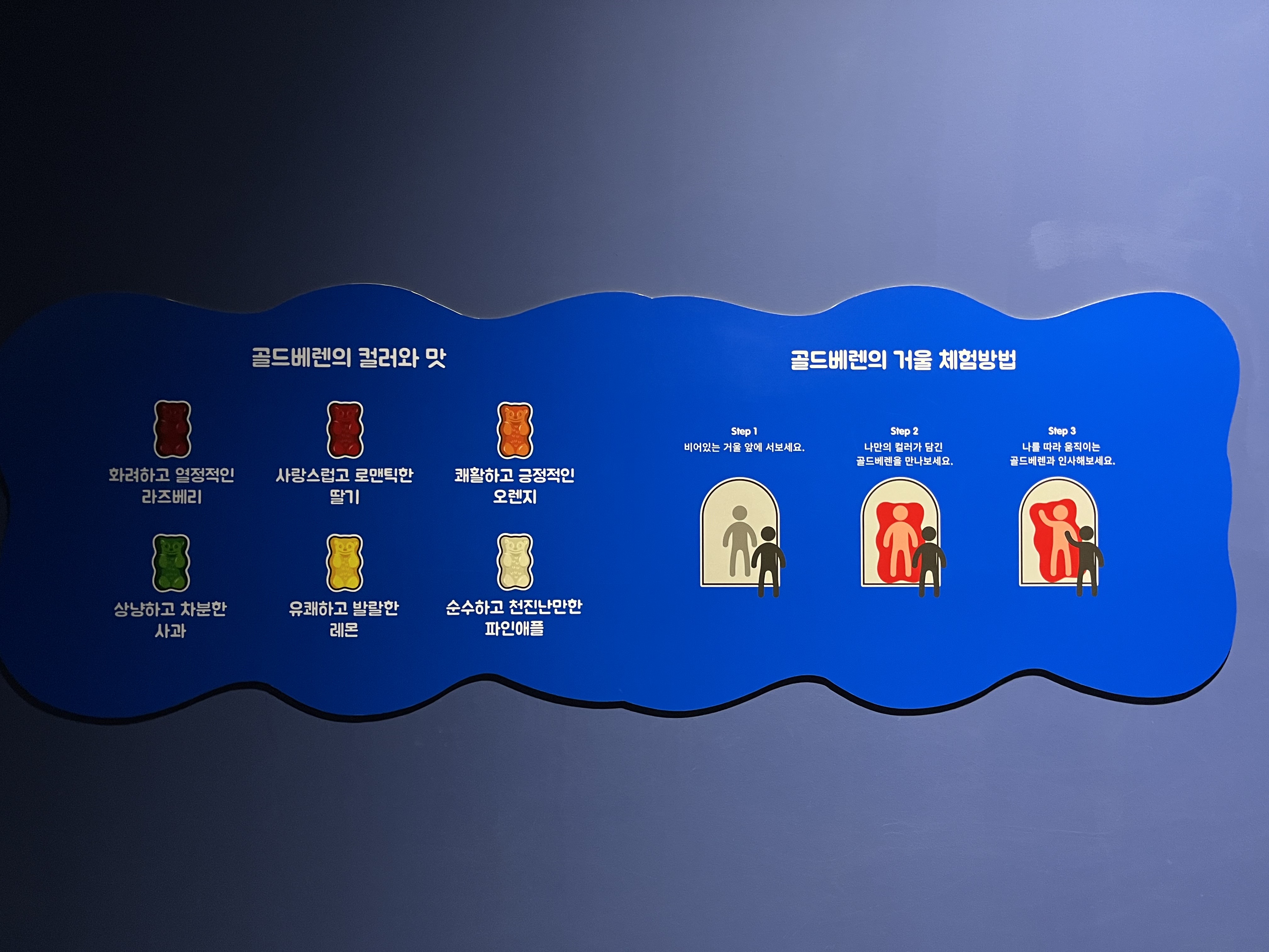 골드베렌 거울을 지나면 숲속의 산새소리와 나뭇잎 소리가 울려 퍼지는 야생젤리보호구역이 펼쳐집니다. 미디어아트를 통해 구현된 숲속의 모습들이 송출되고 있고, 귀여운 하리보 젤리 친구들이 뛰어노는 모습을 볼 수 있어요. 다채로운 동식물 젤리로 이루어진 판타지 공간인데요. 젤리가 탄생하는 생명의 나무와 말랑한 돌다리가 있는 개울, 식물 젤리가 무성한 수풀까지 이 신비로운 곳에서 하리보 친구들의 하루가 펼쳐지고 있답니다. 젤리 도감을 보며 같은 모양을 한 젤리 친구를 찾아보는 재미가 있었어요.