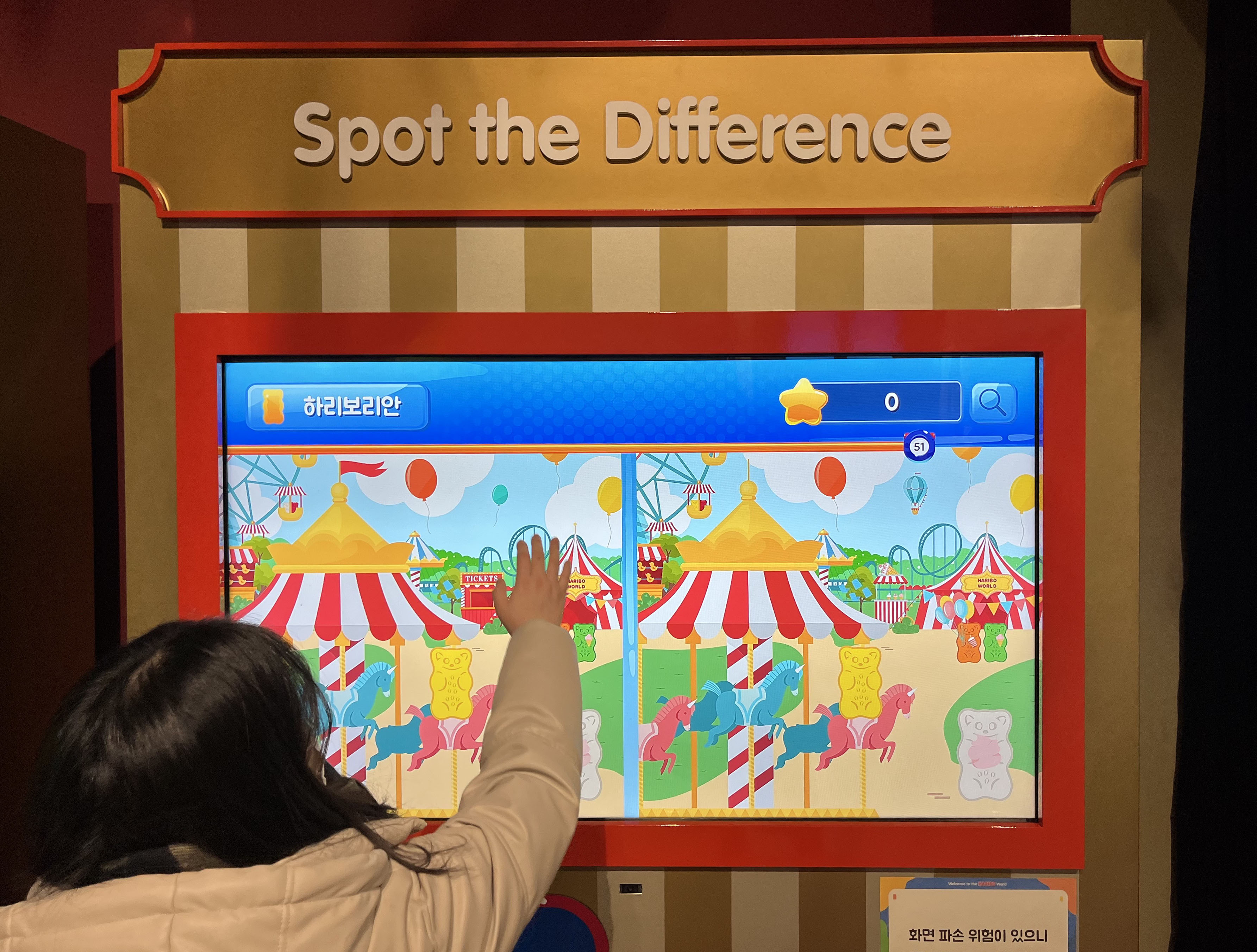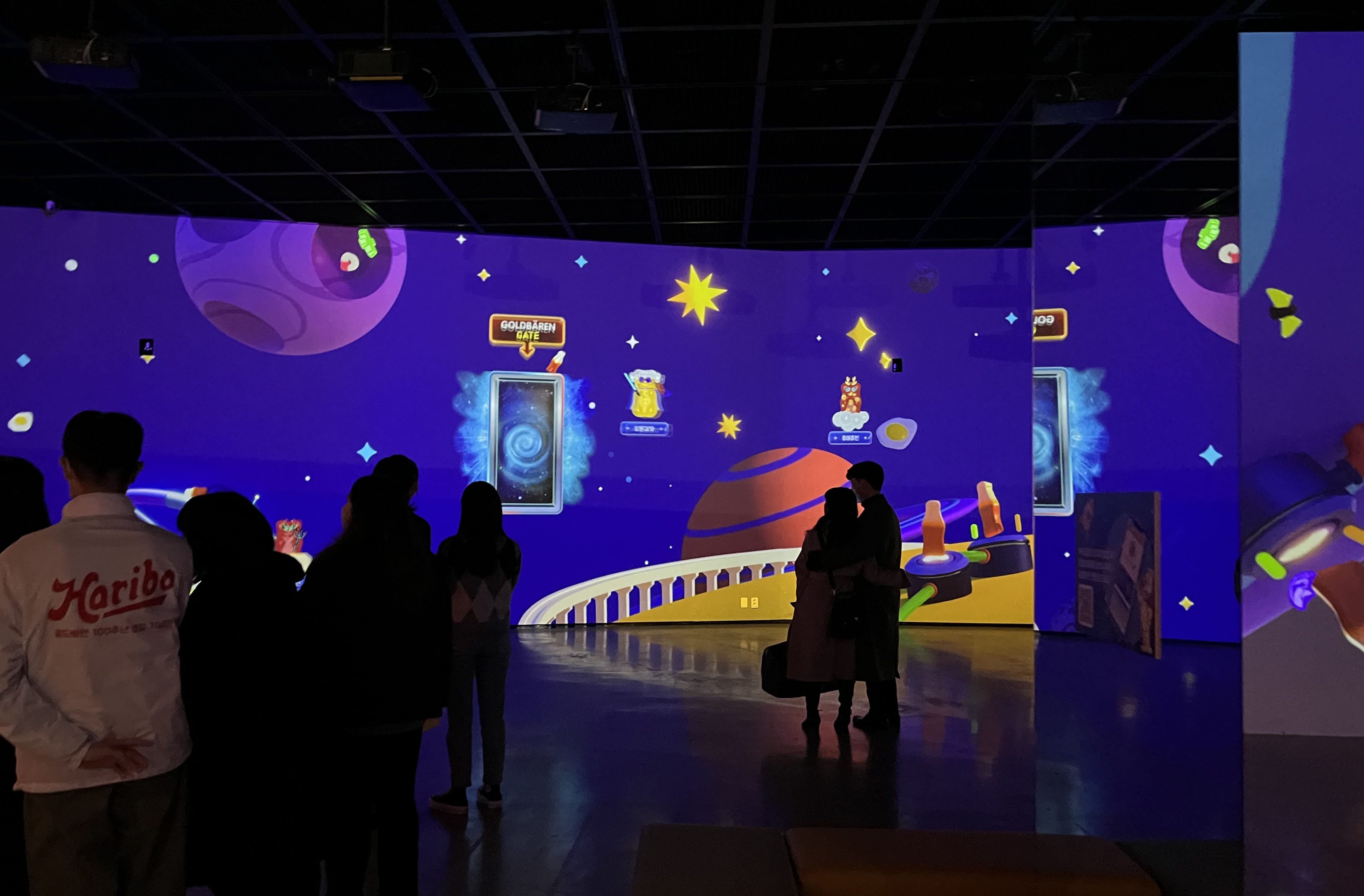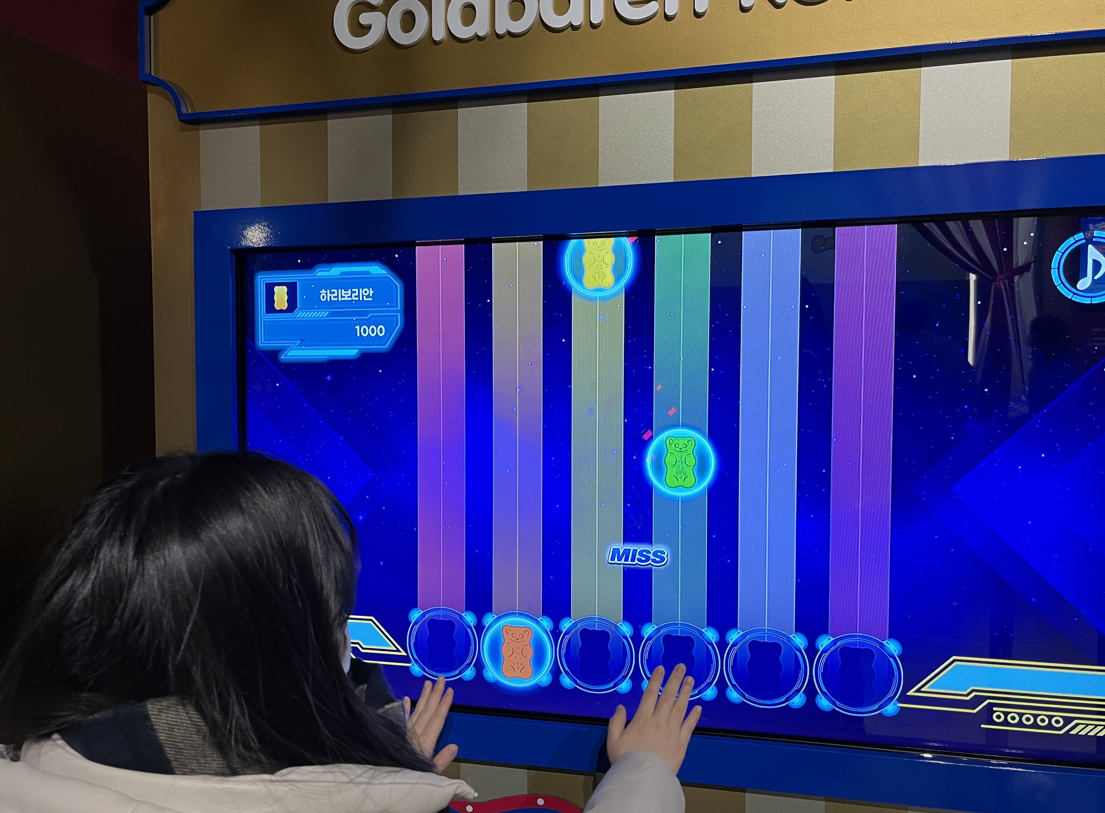 이 공간에서는 앞서 미리 깔아 두었던 어플을 활용해 실제 다른 유저들과 함께 게임을 즐길 수 있어요! 어플을 켜서 나의 골드베렌을 꾸민 후 게임의 문이 열리면 입장! 젤리를 가장 많이 먹은 사람이 1등을 차지할 수 있는데요. 1등에게는 귀여운 하리보 한정판 엽서를 준다고 하니, 꼭 1등을 노려야겠죠? 재도전은 언제나 환영이랍니다!