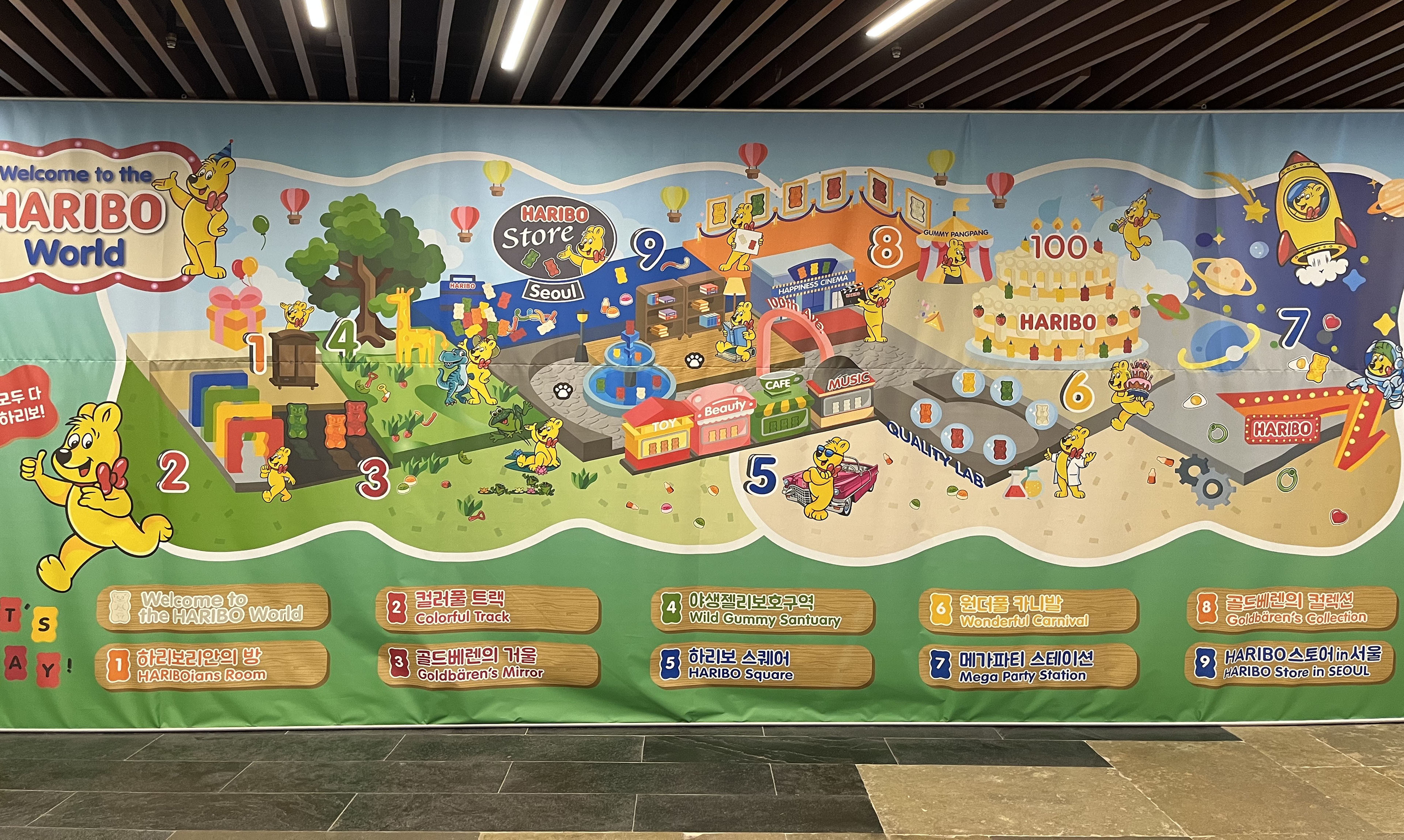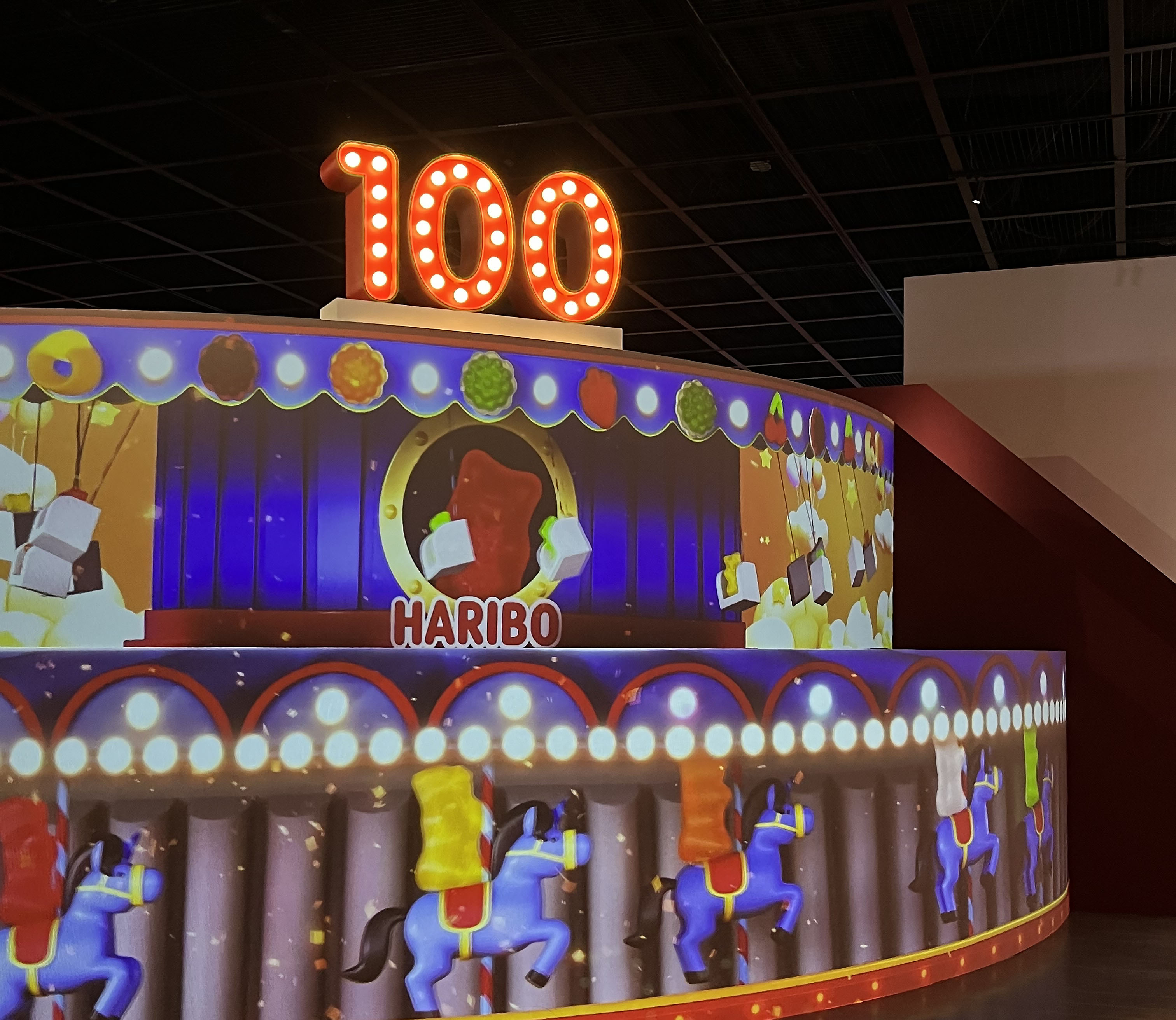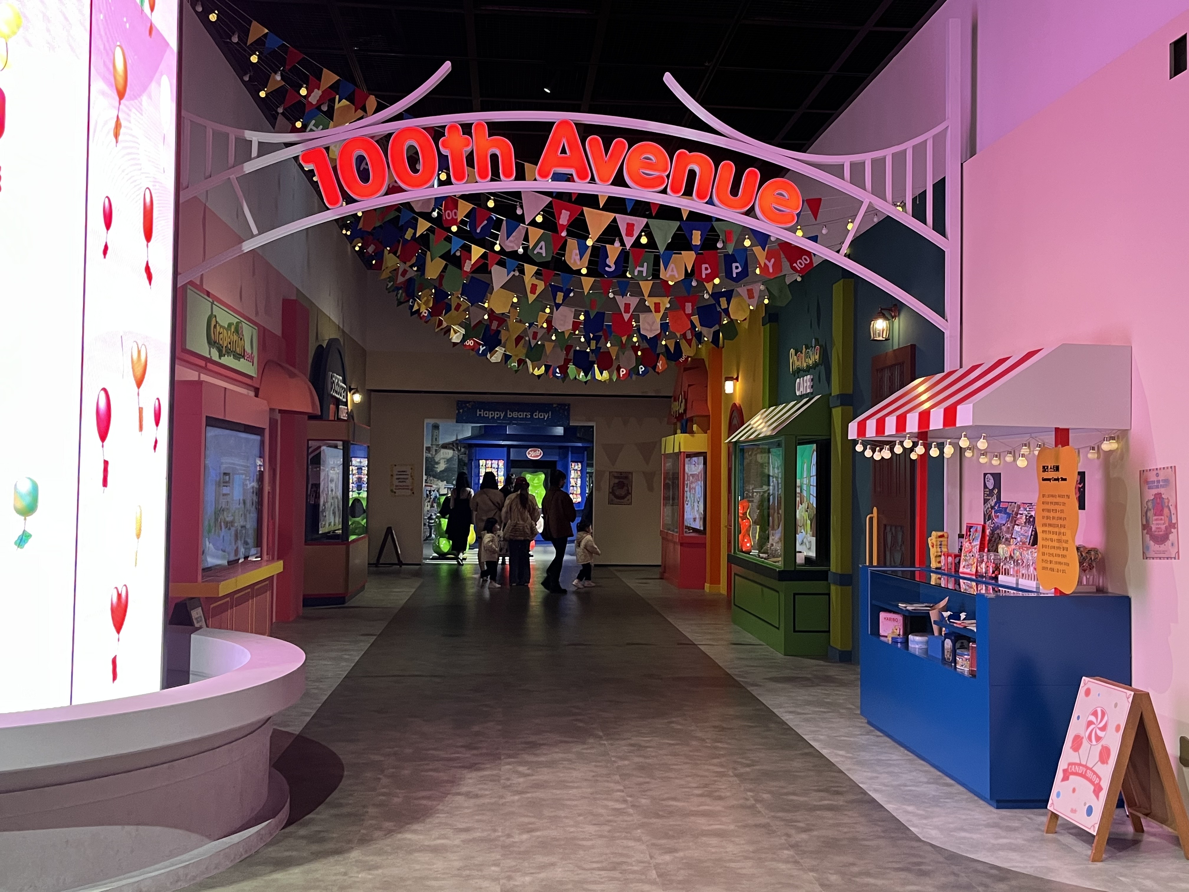 축제를 즐기는 골드베렌들이 보이는 3단 케이크 모형을 볼 수 있어요. 실제로 이 위로 올라가 숫자 100 옆에 서서 인증샷을 찍을 수도 있었고, 하리보가 준비한 신나는 게임들을 무한정으로 즐길 수도 있어요. 아이들이랑 오면 특히 신나게 놀 것 같은 게임이 한가득이었답니다.