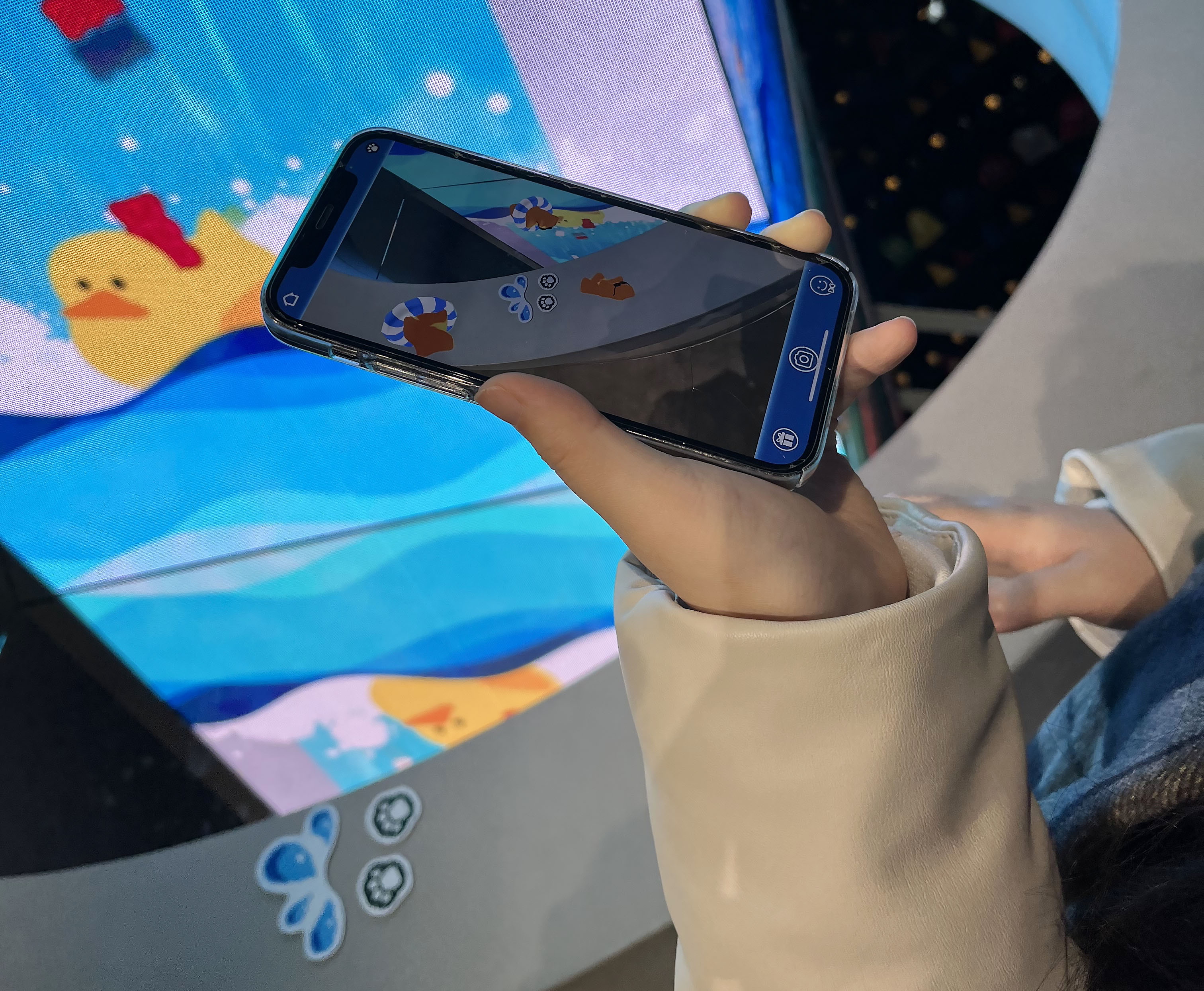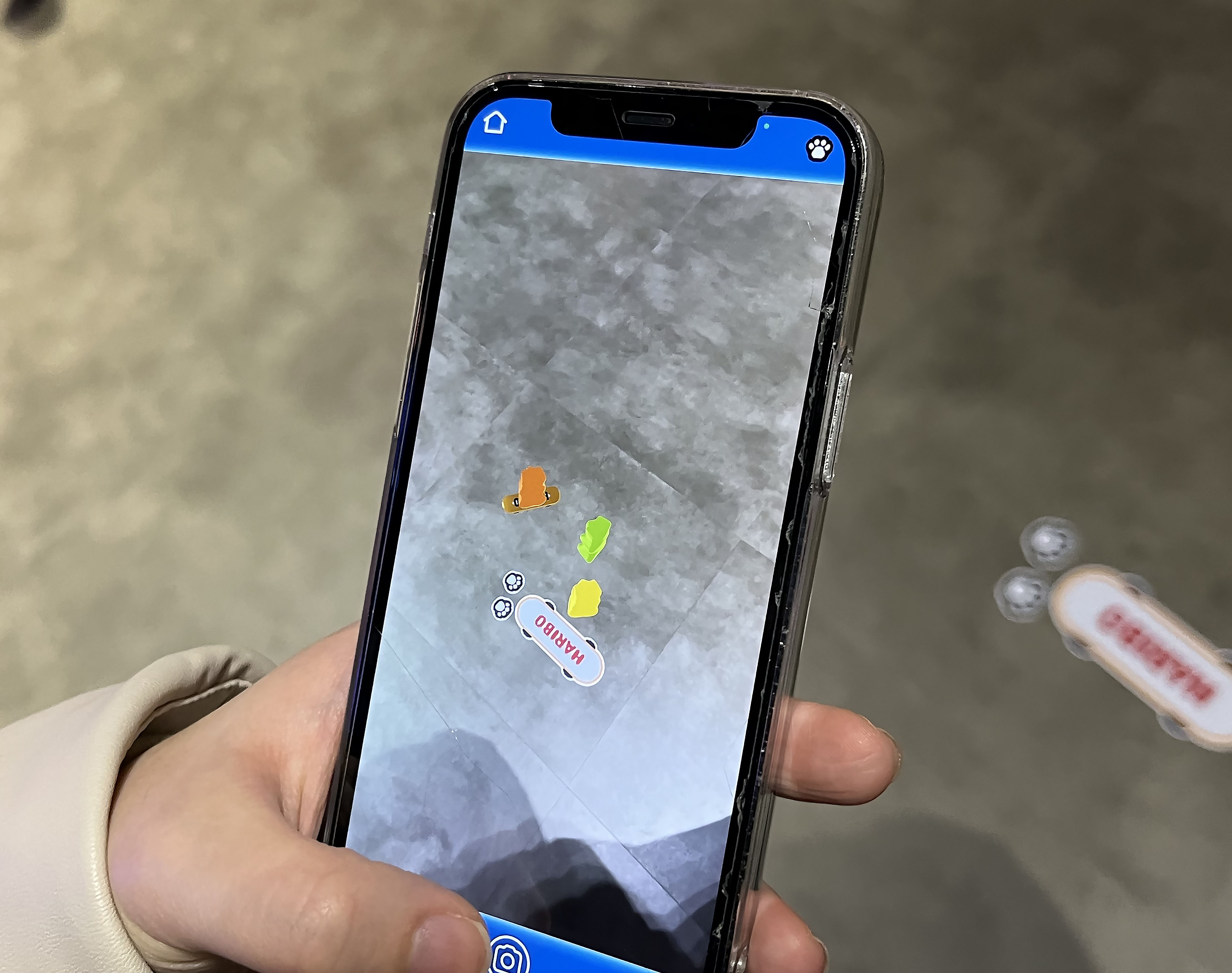 하리보 월드를 더욱 재미있게 즐기고 싶다면 꼭 설치해야 하는 필수 어플이 있는데요. ‘haribo world’라는 어플을 미리 다운로드해 가시는 걸 추천드립니다. 전시장 곳곳에 있는 AR 콘텐츠에 카메라를 가져다 대면 전시장에 숨어서 움직이고 있는 골드베렌들을 볼 수 있고, 필터 카메라를 켜서 골드베렌들과 함께 셀피도 남길 수 있답니다. 분수대에 발자국이 있어 AR 필터를 가져다 대니 귀여운 골드베렌들이 물놀이를 하고 있는 모습을 발견했어요.