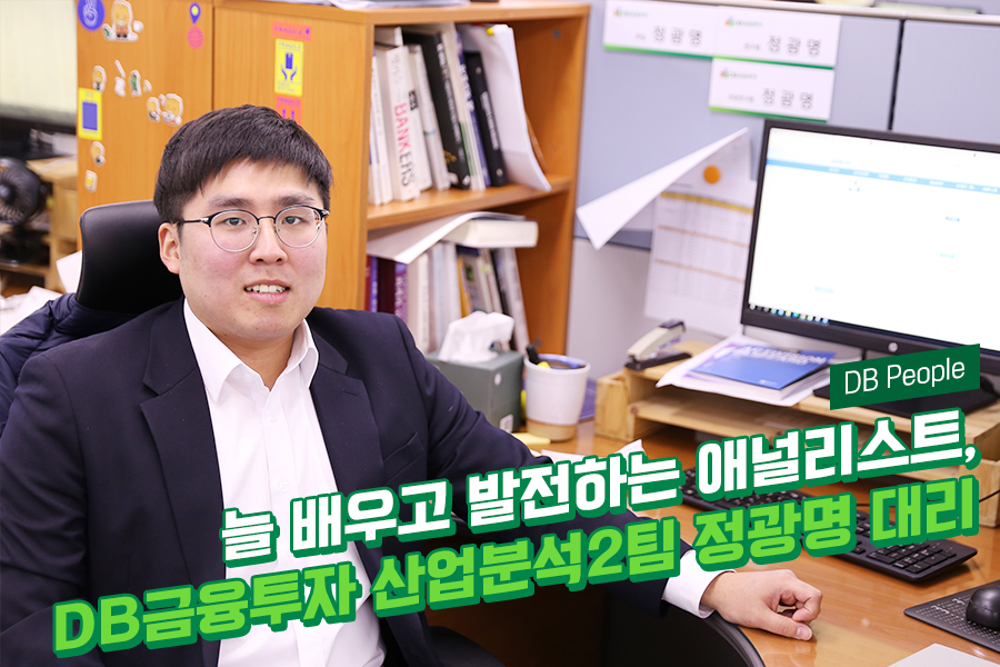 신뢰받는 글로벌 금융투자회사로 성장하고 있는 DB금융투자! DB금융투자는 다양한 사업 분양 지출, 영업망 확대 및 자본 확충, 인재 육성 등을 통해 우량 금융투자회사로서의 면모를 갖추기 위해 노력하고 있어요. 성공적인 투자를 위해서는 투자 대상에 대한 철저한 조사와 분석이 필수인데요. 리서치센터 산업분석2팀에서 근무 중인 정광명 대리를 통하여 이곳의 애널리스트들이 어떻게 직무에 임하는지 알아보았습니다.