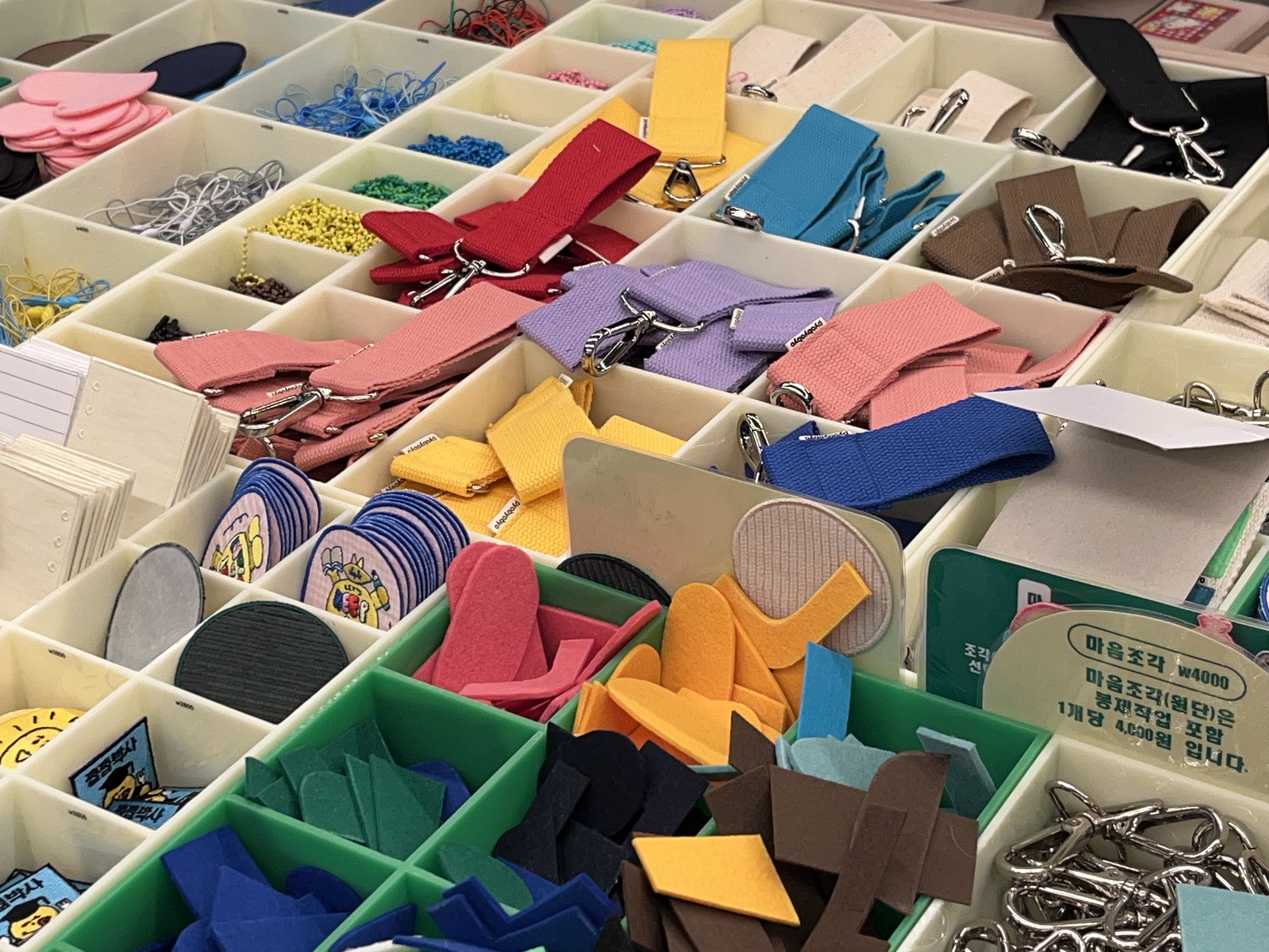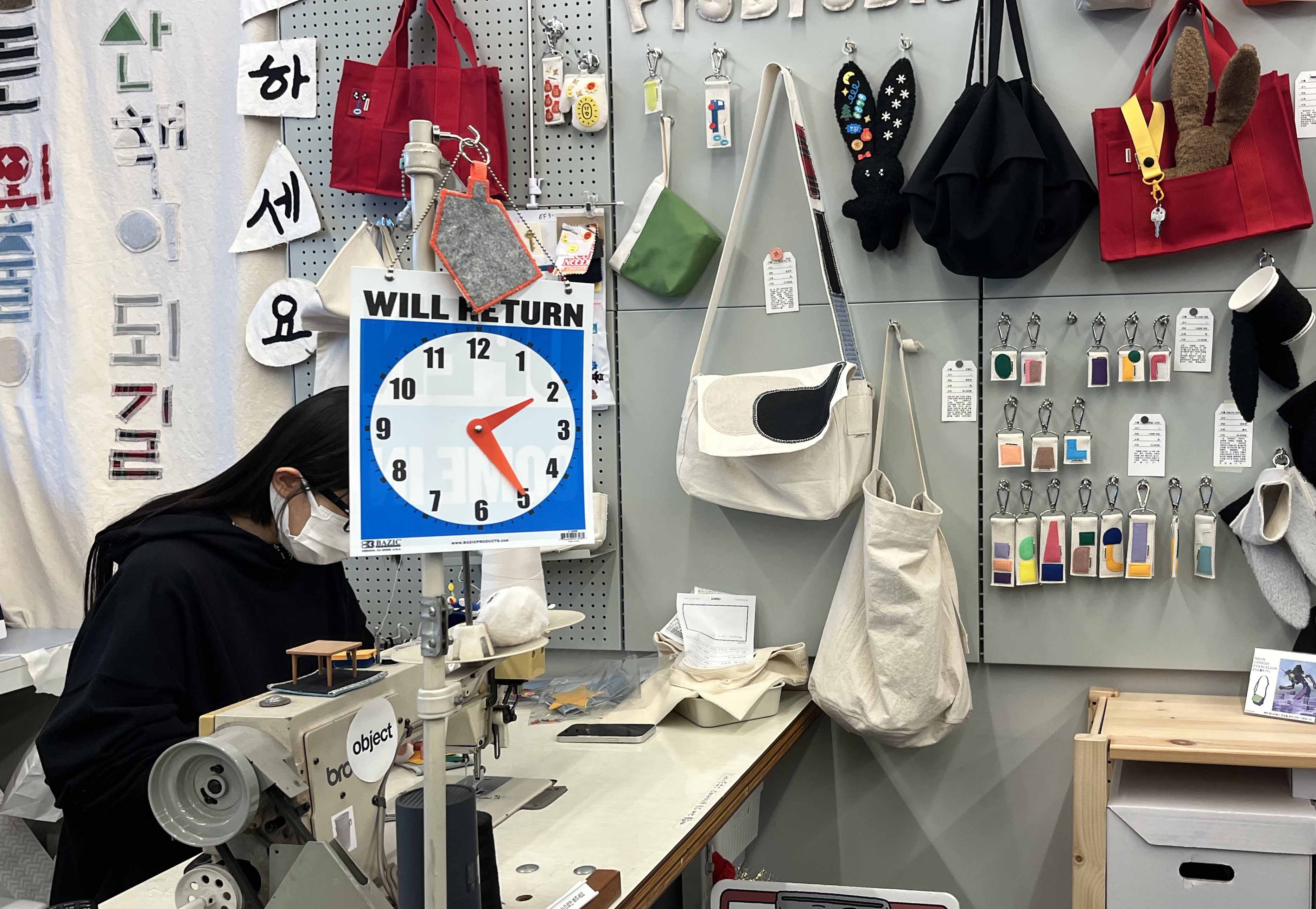 와펜 뿐 아니라, ‘마음조각’이라고 불리는 동그라미, 세모, 트리 모양의 펠트지들도 있었는데요. 이 펠트지들은 표뵤뵤 작가님이 옵젵상가에 계시는 동안 미싱 서비스를 받을 수 있습니다. 재봉틀 작업이 가능한 시간은 평일은 오후 4시-8시, 주말은 오후 1시-8시이기 때문에 필요하신 분들은 시간 체크해서 방문하시면 좋을 것 같아요.