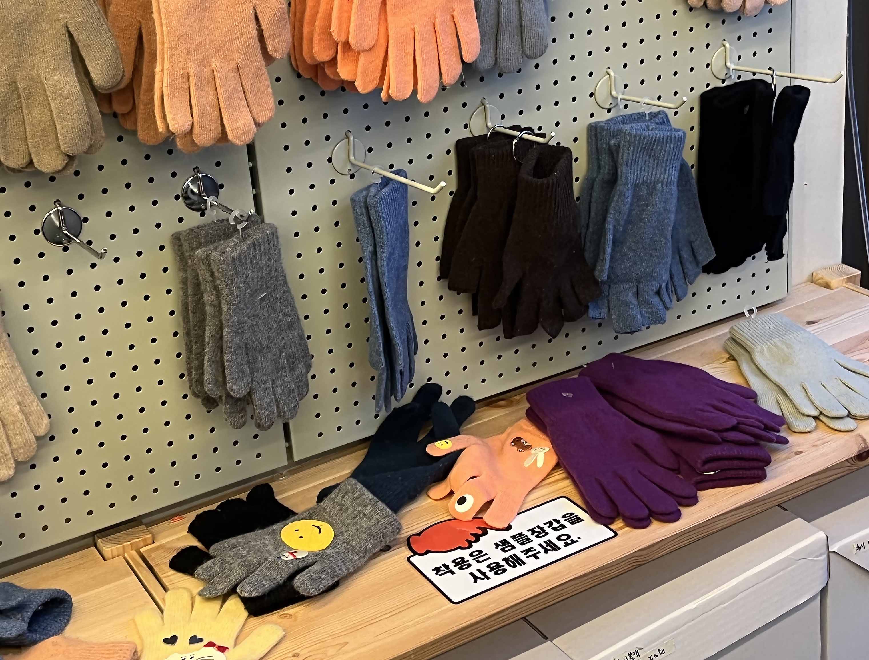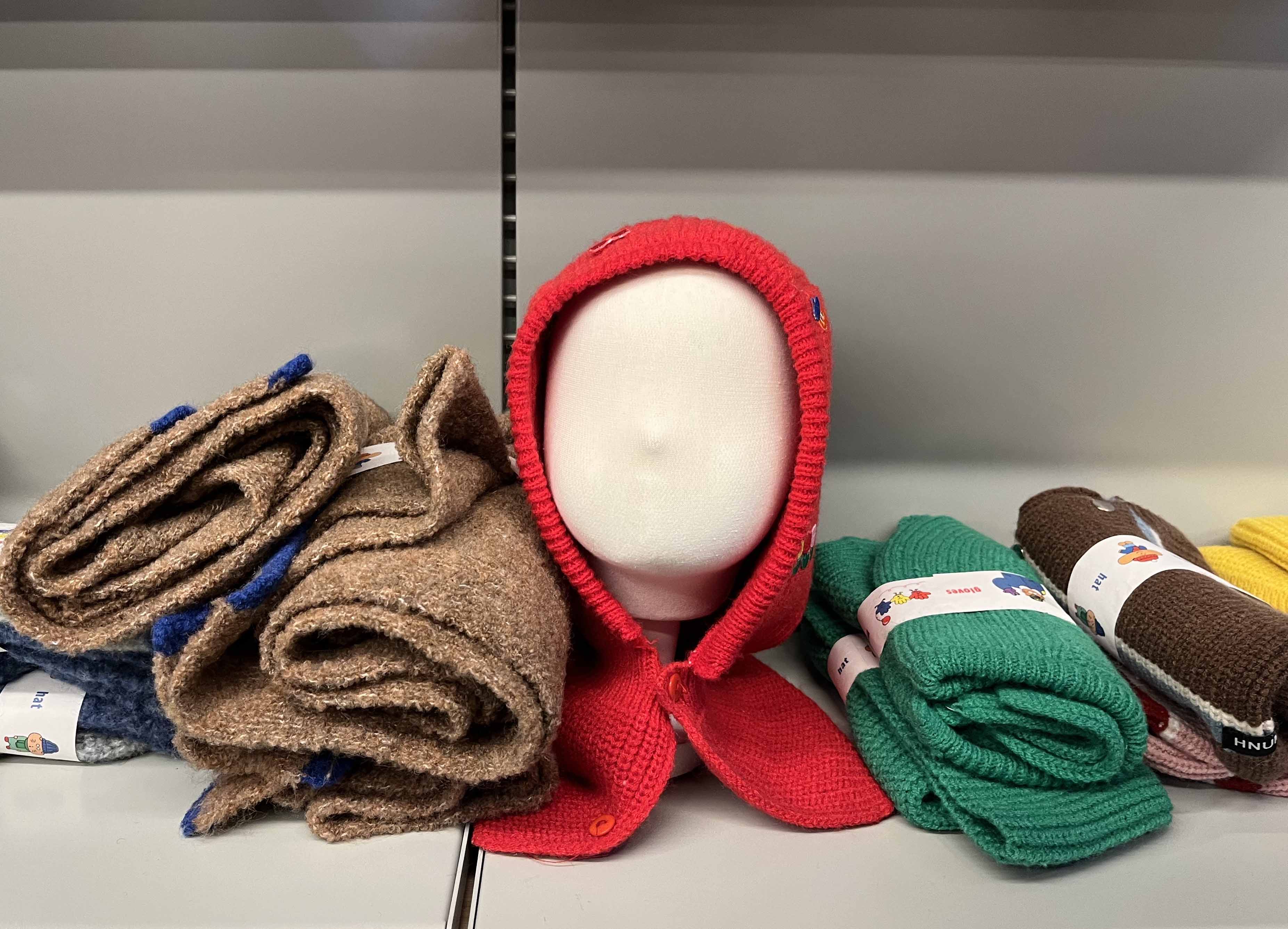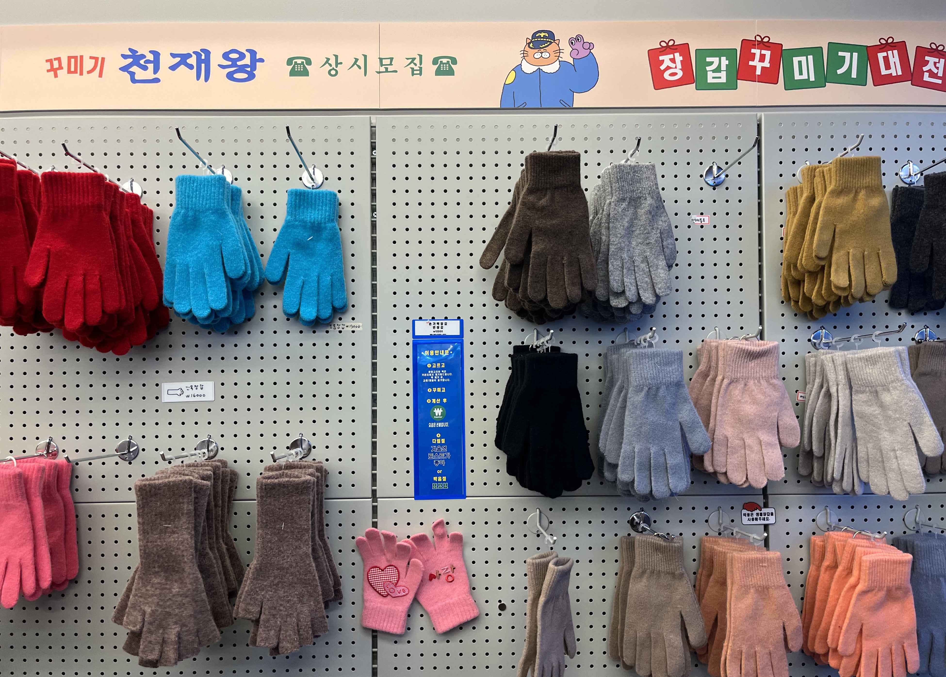 가장 먼저 보이는 장갑 코너에서 원하는 색과 사이즈, 모양의 장갑을 골라 보세요. 아기용 작은 장갑도 있고, 스마트폰 터치를 위해 손가락 끝이 뚫려 있는 장갑, 손목까지 따뜻하게 감싸주는 목이 긴 장갑까지 선택지가 다양하답니다.