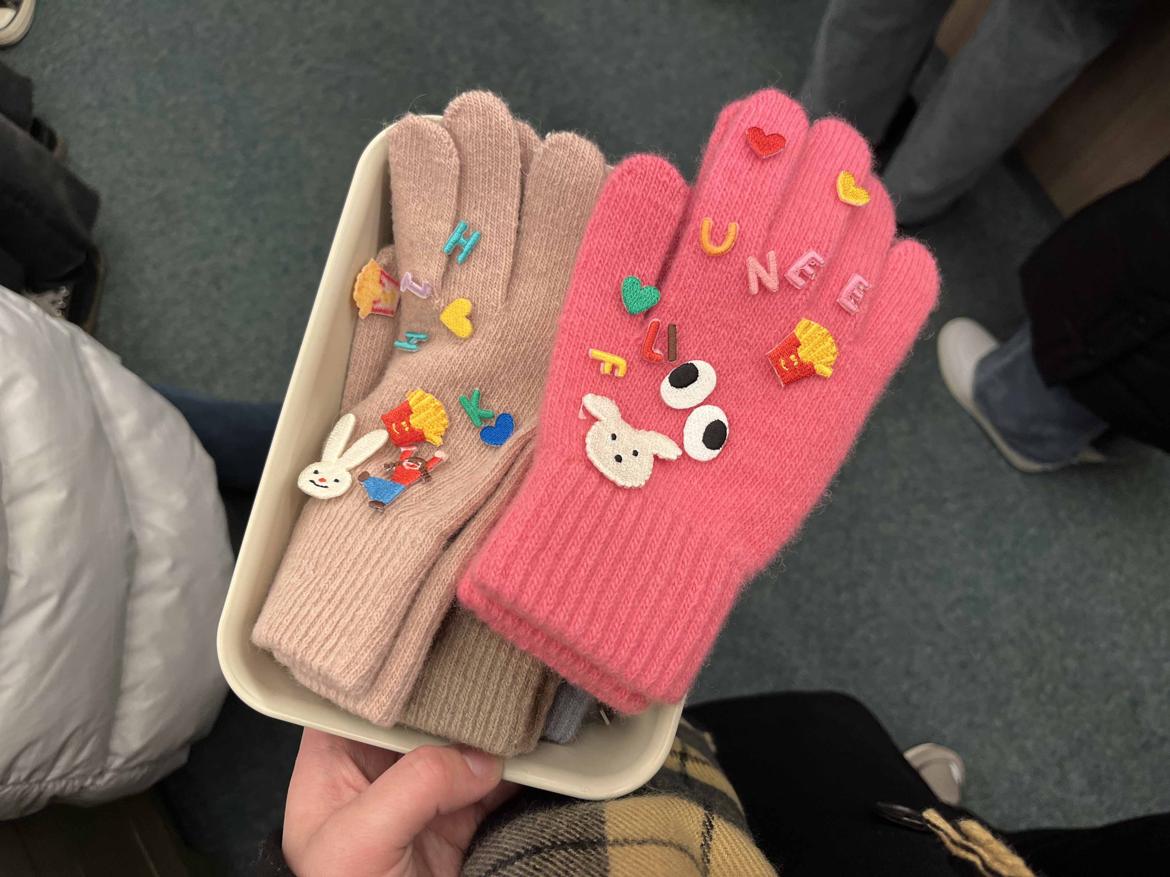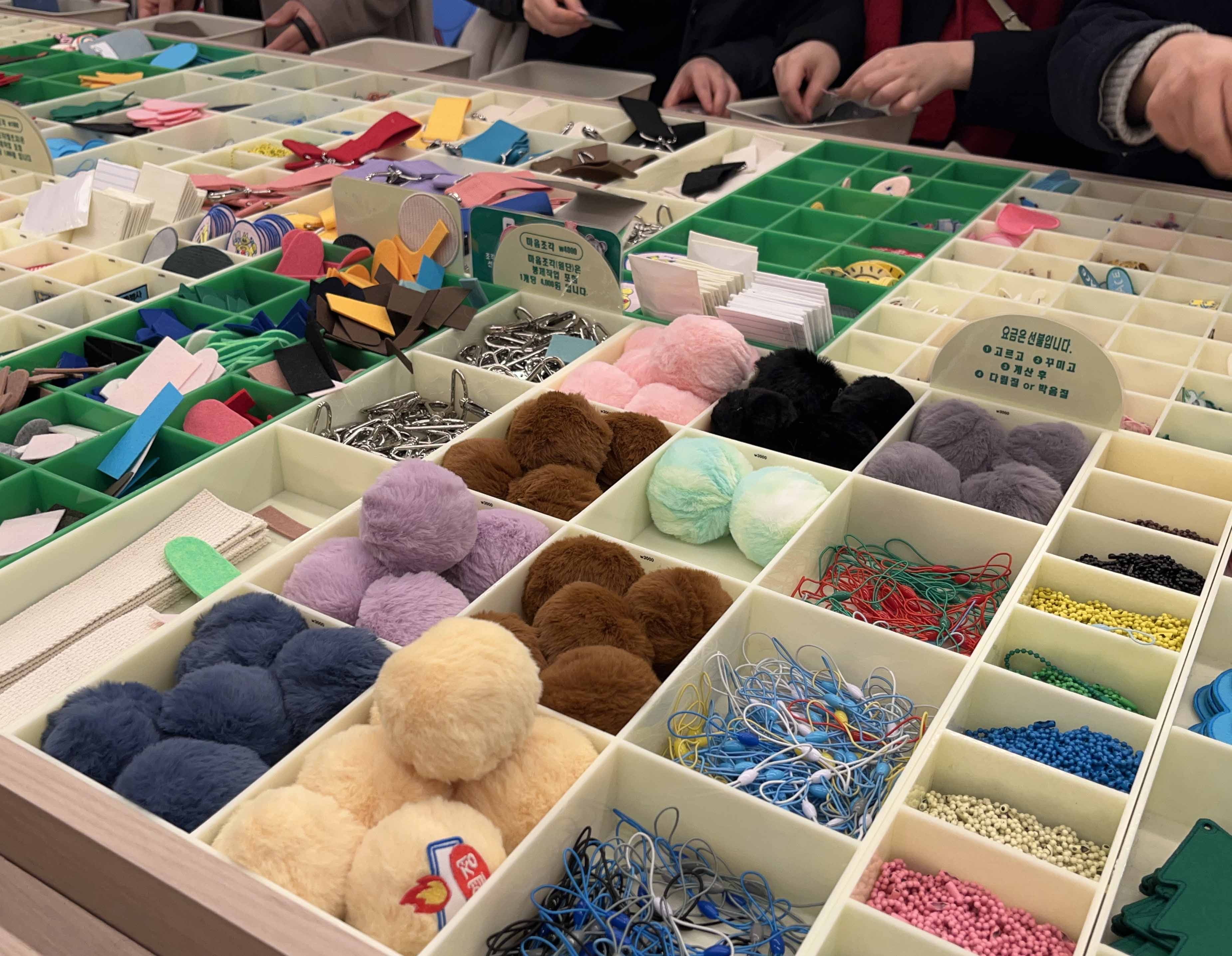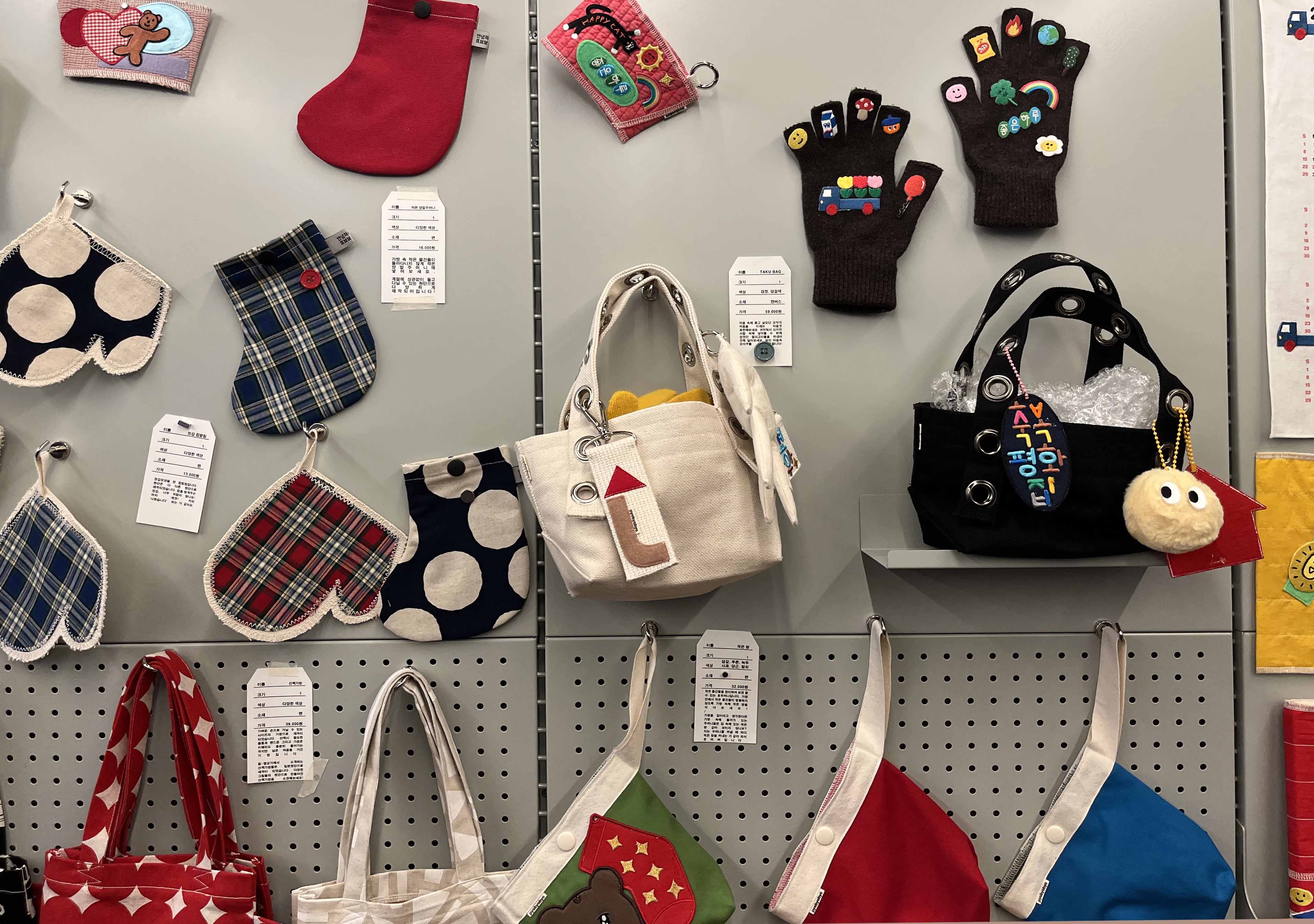 저도 원하는 색감의 장갑들을 골라 이니셜과 좋아하는 동물, 좋아하는 음식, 하트 같은 귀여운 와펜들을 골라 보았는데요. 다 고른 장갑과 꾸미기 재료들은 계산을 완료한 후에 미싱 또는 다리미질 서비스를 받아 완성할 수 있습니다.