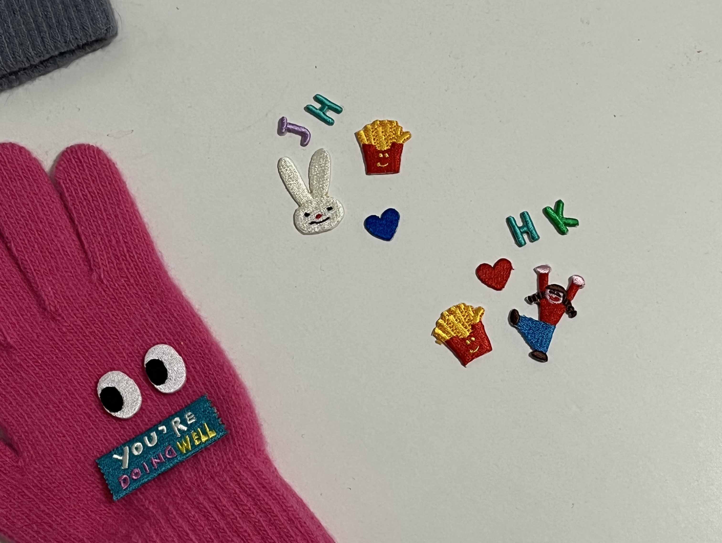 마음조각들이 아닌 와펜들은 뒷면에 접착제가 있어서 원하는 배열대로 만든 후에 다림질로 열을 가해 녹이는 방식으로 붙일 수 있습니다. 계산을 종료한 후에 다림질 서비스를 받을 수 있는데요, 방법이 어렵지 않기 때문에 대기가 길다면 집에서도 간단하게 다림질로 완성할 수 있어요. 저는 일정이 있어 다림질 서비스를 이용하지 않고 집에서 직접 다림질하여 장갑을 완성했어요. 너무 온도가 높아지지 않도록 다림질을 할 때 와펜을 올려둔 장갑 위에 얇은 천을 한 겹 덧대어 다림질을 하시는 것을 추천드립니다.