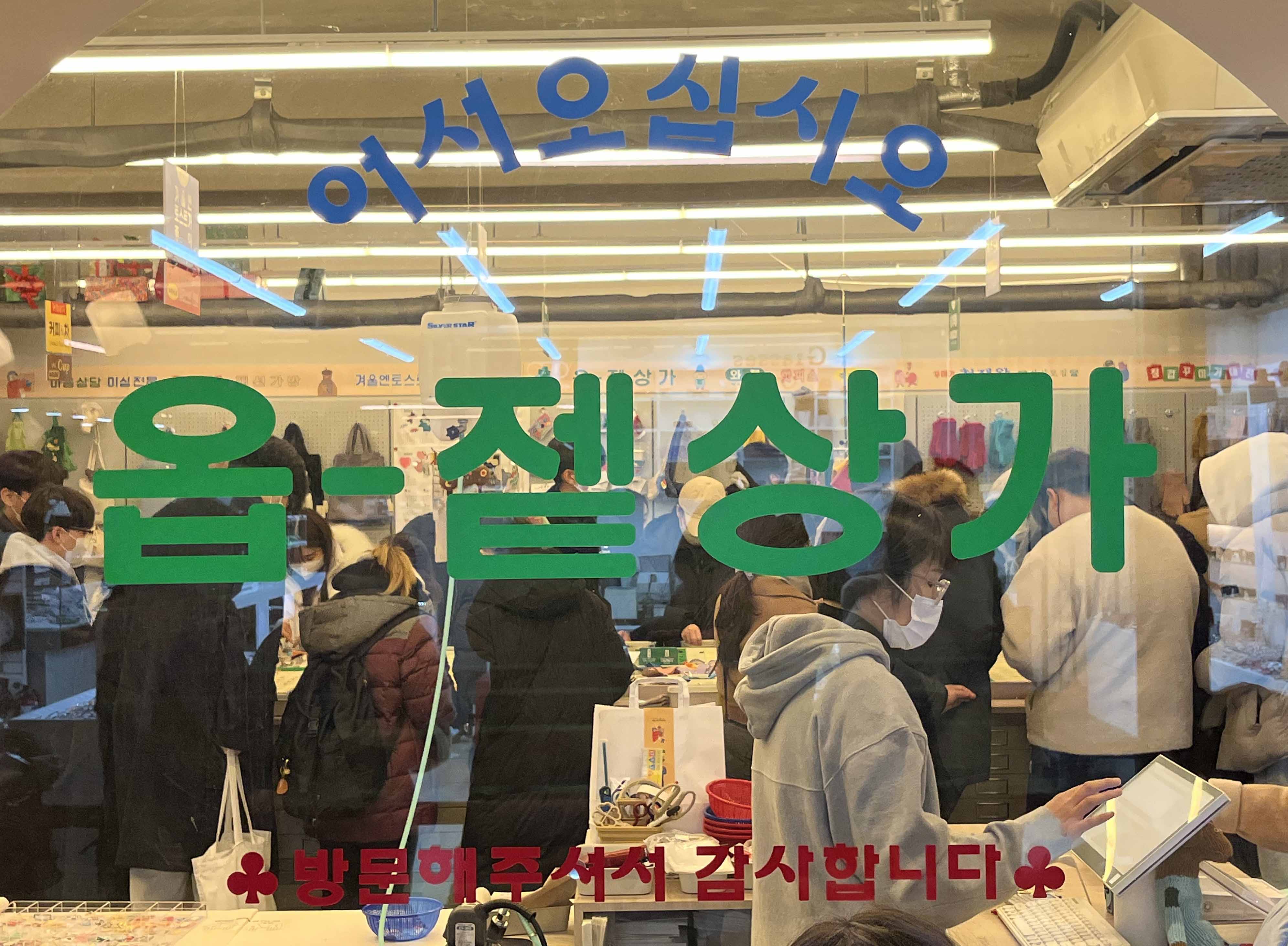 옵젵상가는 연희동의 사러가 쇼핑센터 2층에 위치해 있어요. 오픈한 지 얼마 안 됐는데도 인기가 하늘을 찔러서인지 평일에도 약간의 대기가 있는 편입니다. 아무래도 추운 날씨에 알맞게 장갑과 목도리를 마음껏 꾸밀 수 있기 때문 아닐까요? 평일 저녁 기준 방문했을 때 약 30분 정도 대기가 있었는데요, 기다리는 동안 1층의 잡화점을 구경하시는 것도 좋을 것 같습니다. 우산, 수세미, 수저통 같이 잡동사니들 속에서 동전파스와 같은 보물찾기도 할 수 있답니다.