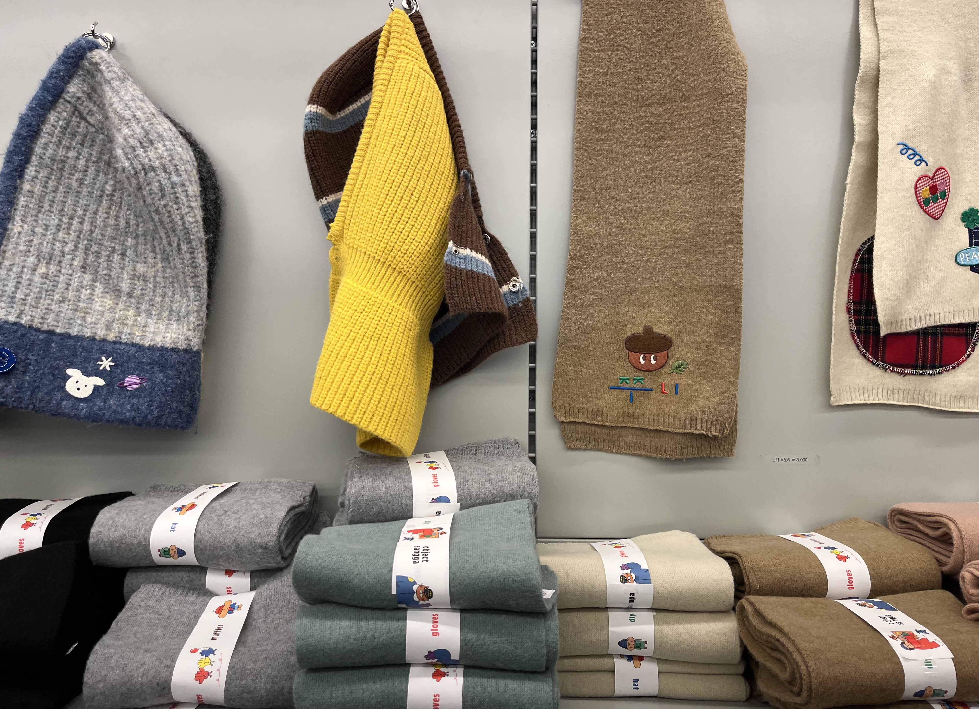 장갑 이외에도 겨울 필수템인 목도리와 바라클라바까지 구매가 가능해서 장갑을 잘 끼지 않는 분들도 즐겁게 고를 수 있을 것 같습니다. 특히 바라클라바는 성인용과 아이용 두 가지 사이즈가 있었는데요. 아이들용 바라클라바에 귀여운 와펜들을 붙인 샘플을 보니 정말 너무 귀여운 거 있죠? 아이가 있다면 엄마와 딸의 커플 장갑, 커플 바라클라바를 꾸며도 좋을 것 같습니다.