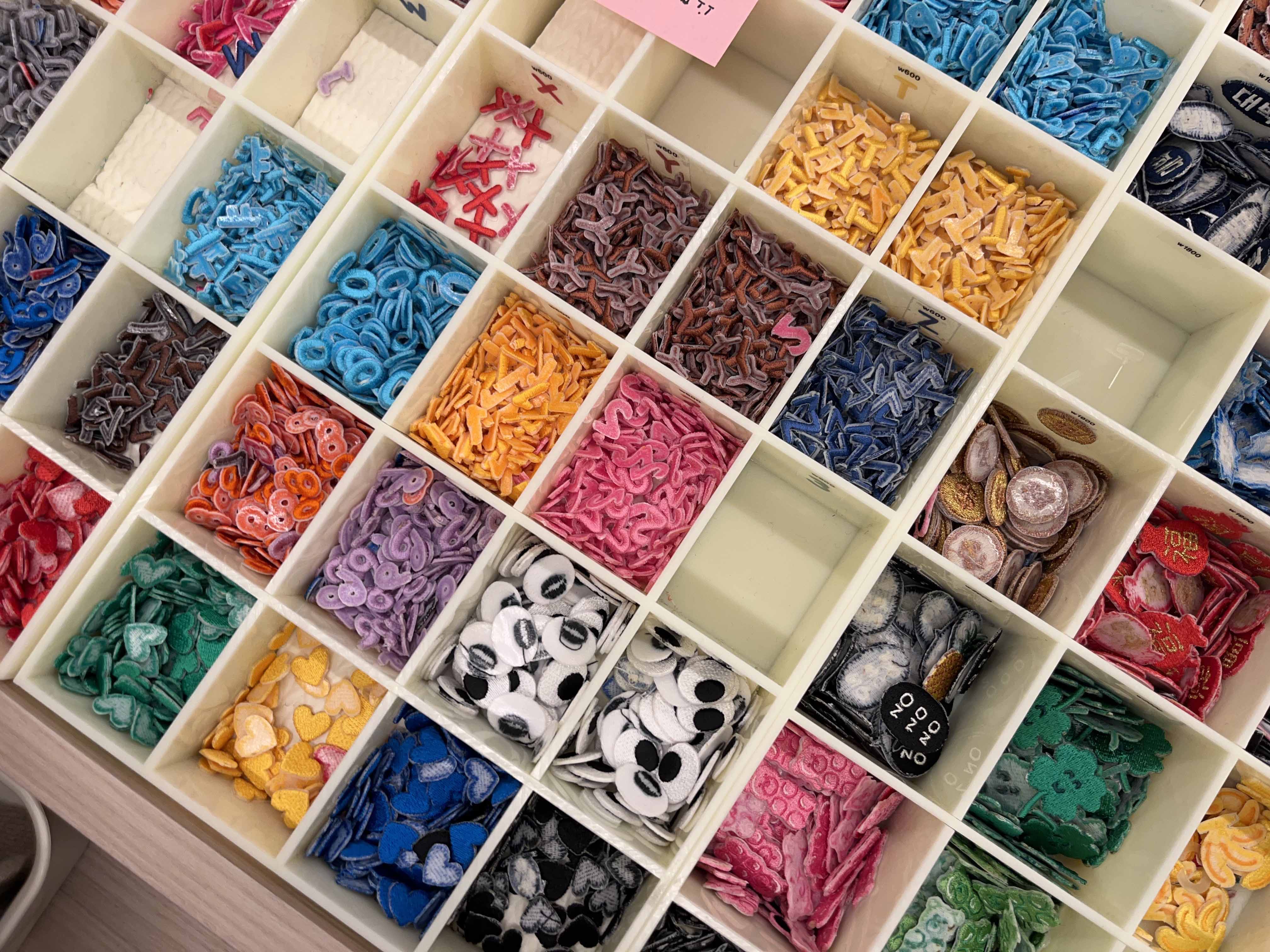 입장할 때 개인 바구니를 하나씩 챙겨서 원하시는 와펜들을 골라 담으시면 되는데요. 대충 어느 위치에 이니셜을 넣을지 색 조합은 어떻게 하면 좋을지 생각해 두면 한결 수월하게 고를 수 있습니다.