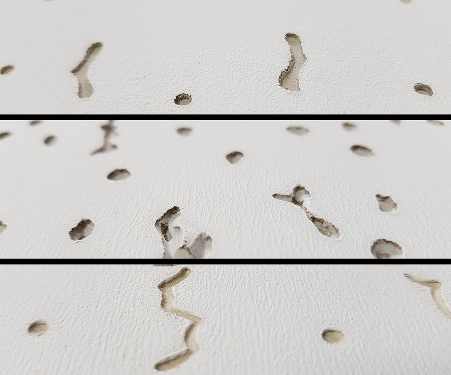 아무래도 천장에 있어서 텍스를 가까이에서 본 적이 없을 텐데, 이해를 돕기 위해 3종류의 텍스(집텍스·아스텍스·아미텍스)를 구매해봤습니다. 텍스를 자세히 들여다보면 표면을 오목하게 파내서 무늬를 새겼습니다. 이렇게 파진 홈이 실내의 소음을 흡수해요.