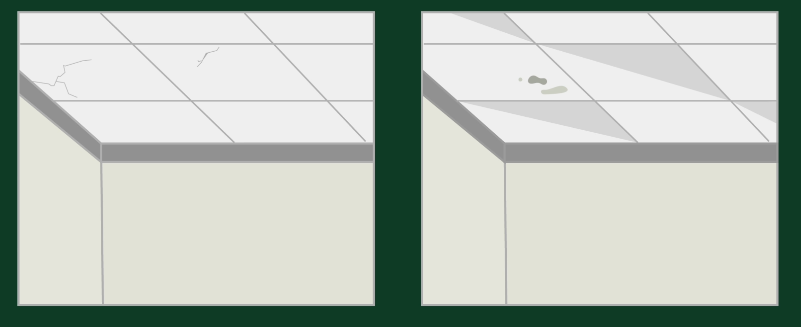 일단 천장에 많이 사용하는 색상은 하얀색 계열입니다. 만약 별다른 무늬 없이 하얀색으로만 되어 있거나 규칙적인 무늬가 있을 경우 천장에 금이 가거나 오염이 생겼을 때 눈에 잘 띄어요.