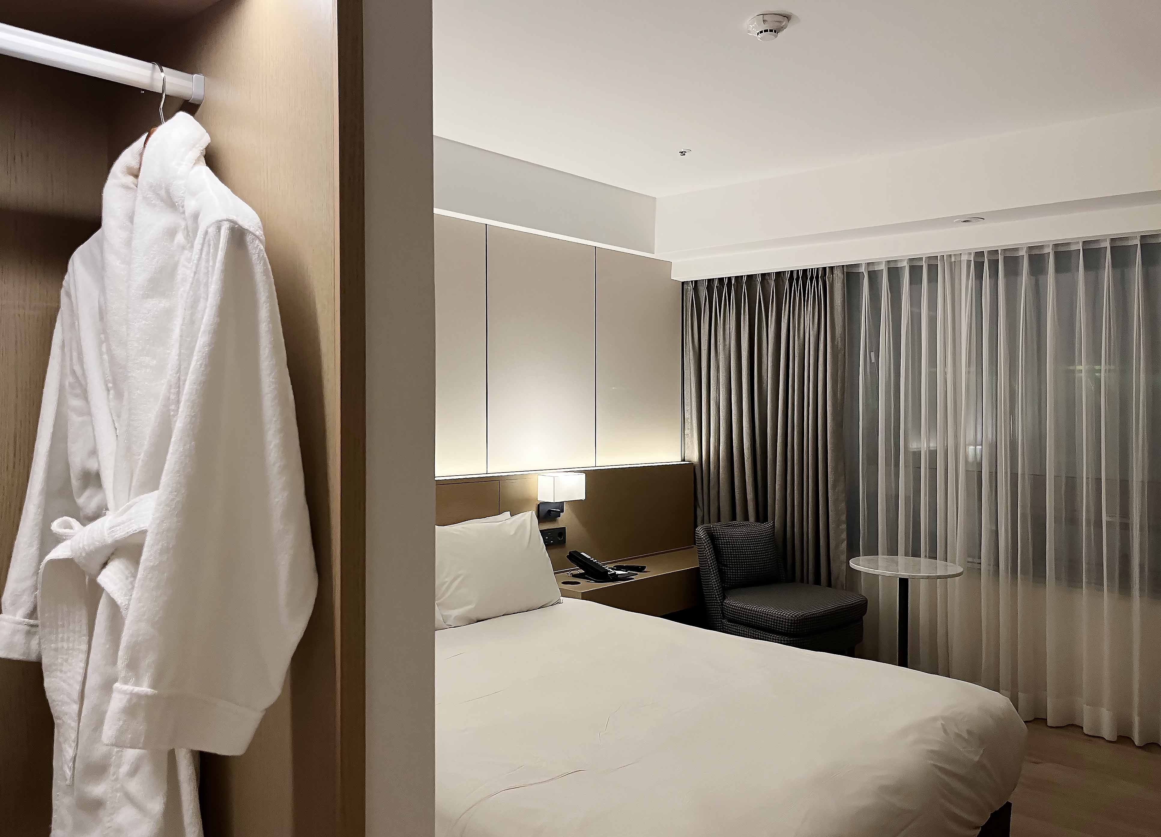 인터불고 엑스코 호텔은 리모델링과 함께 객실들도 모두 신식으로 새롭게 교체되었다고 하는데요. 이 리모델링된 객실들은 디럭스 레벨 이상의 객실들에 적용되었다고 하니, 투숙 시 스탠다드 객실보다는 디럭스 이상 객실을 추천드려요. 저는 디럭스 더블 객실을 이용하였는데요. 가운과 슬리퍼, 어메니티와 물, 커피와 차는 투숙 인원에 맞게 준비되어 있었고, 간이 테이블과 의자가 따로 준비되어 있어 커피와 다과를 즐길 수 있었습니다.