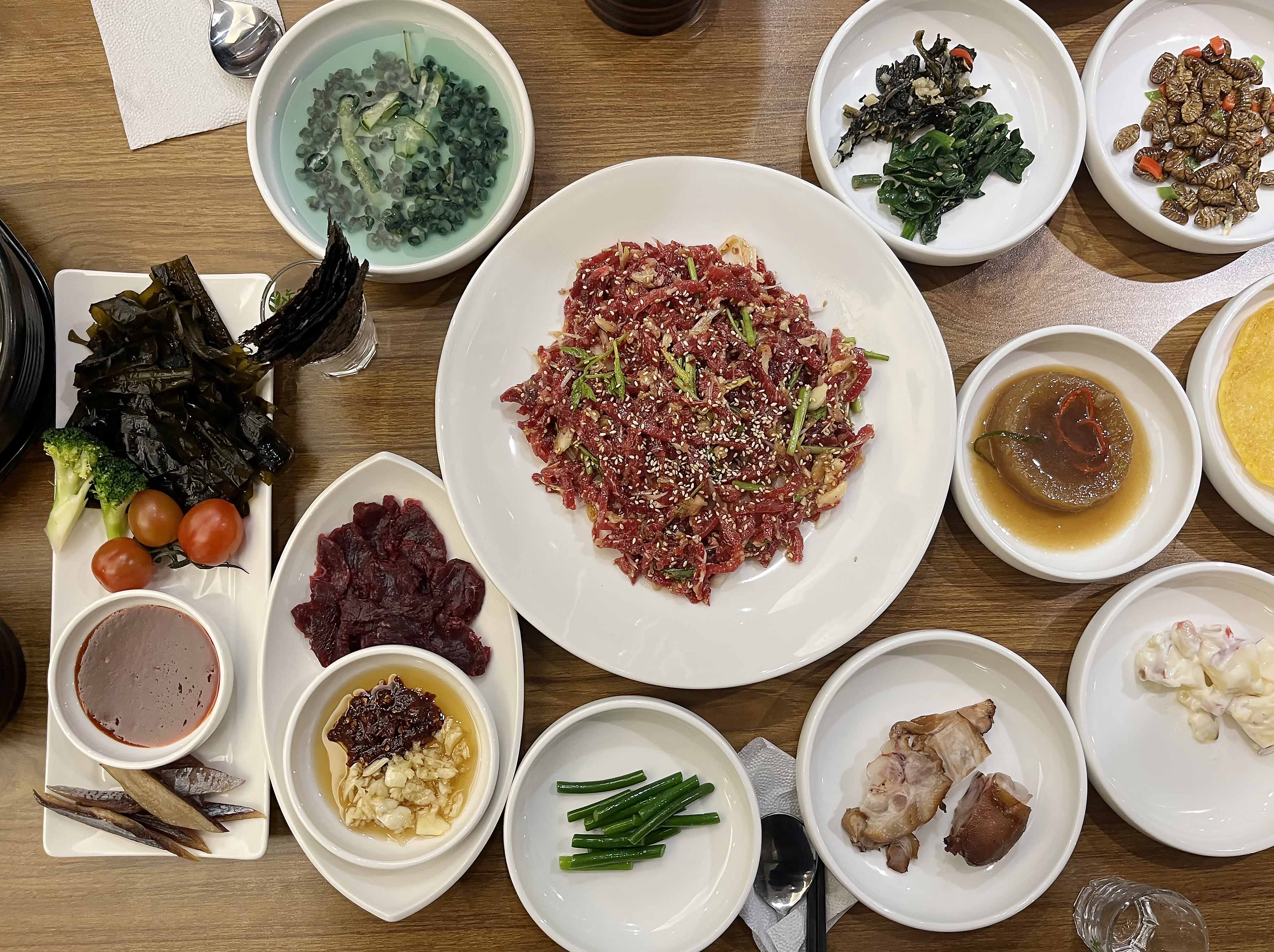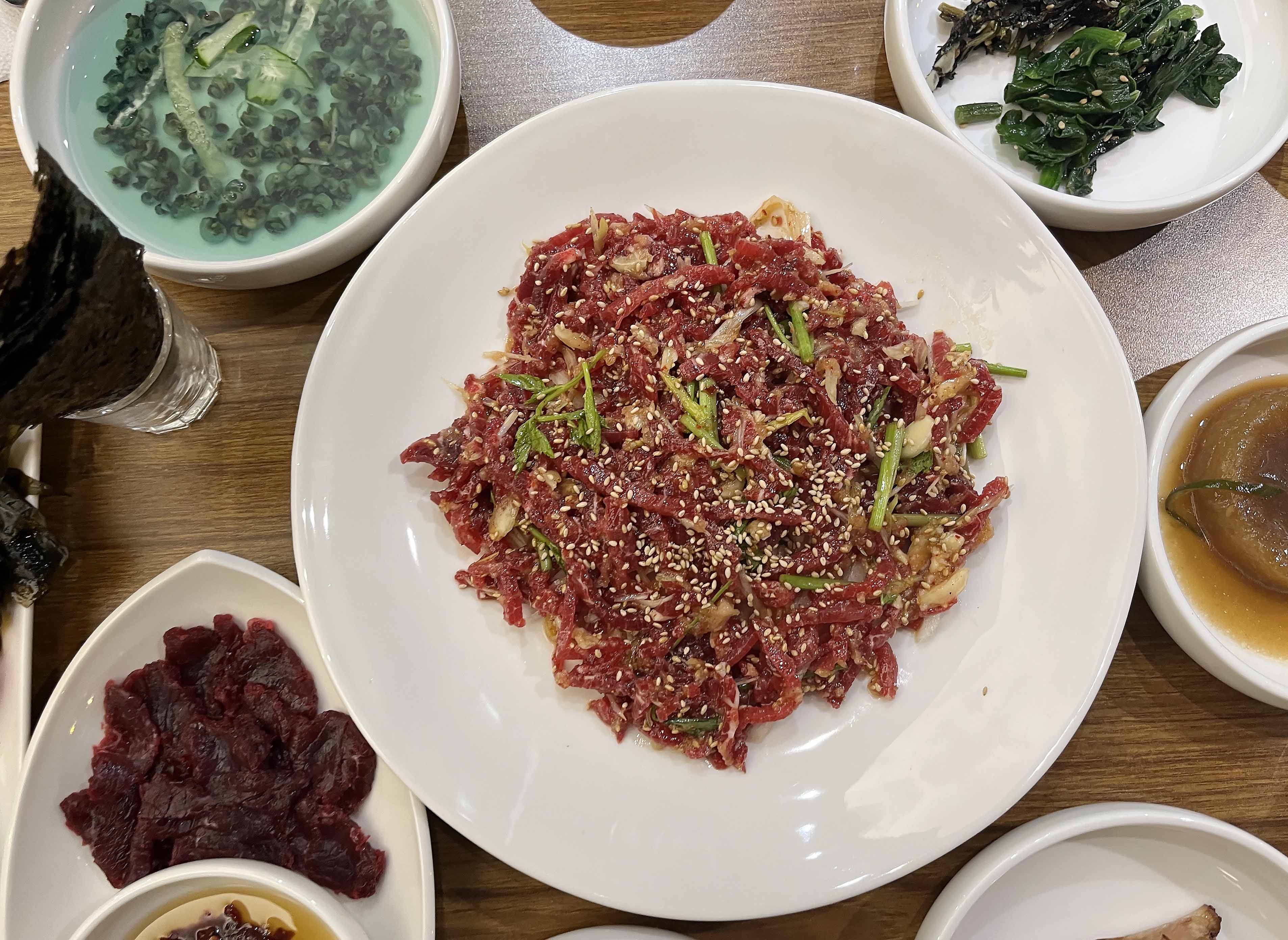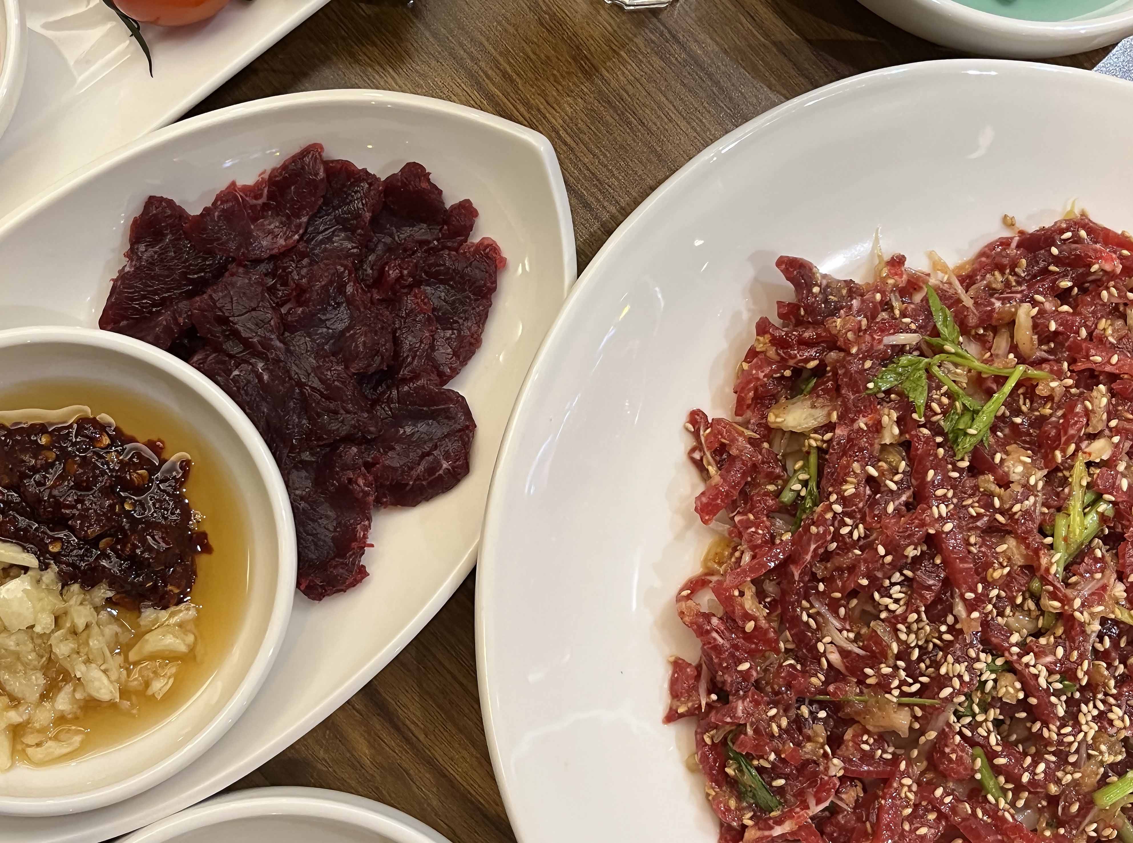저는 인터불고 엑스코 호텔 근처의 새로 생긴 ‘홍시 생고기’를 방문했는데요. 사장님만의 20여년 비법이 담긴 막장 소스와 과메기, 신선한 천엽과 간, 명란젓 김밥, 다슬기, 족발과 나물 반찬 등 한상 가득 차려지는 밥상에 뭉티기를 다채롭게 즐길 수 있었습니다. 뭉티기(생고기)는 소진이 빠르게 된다고 하니 방문하시기 전에 꼭 전화로 확인해 보시는 걸 권장 드려요.