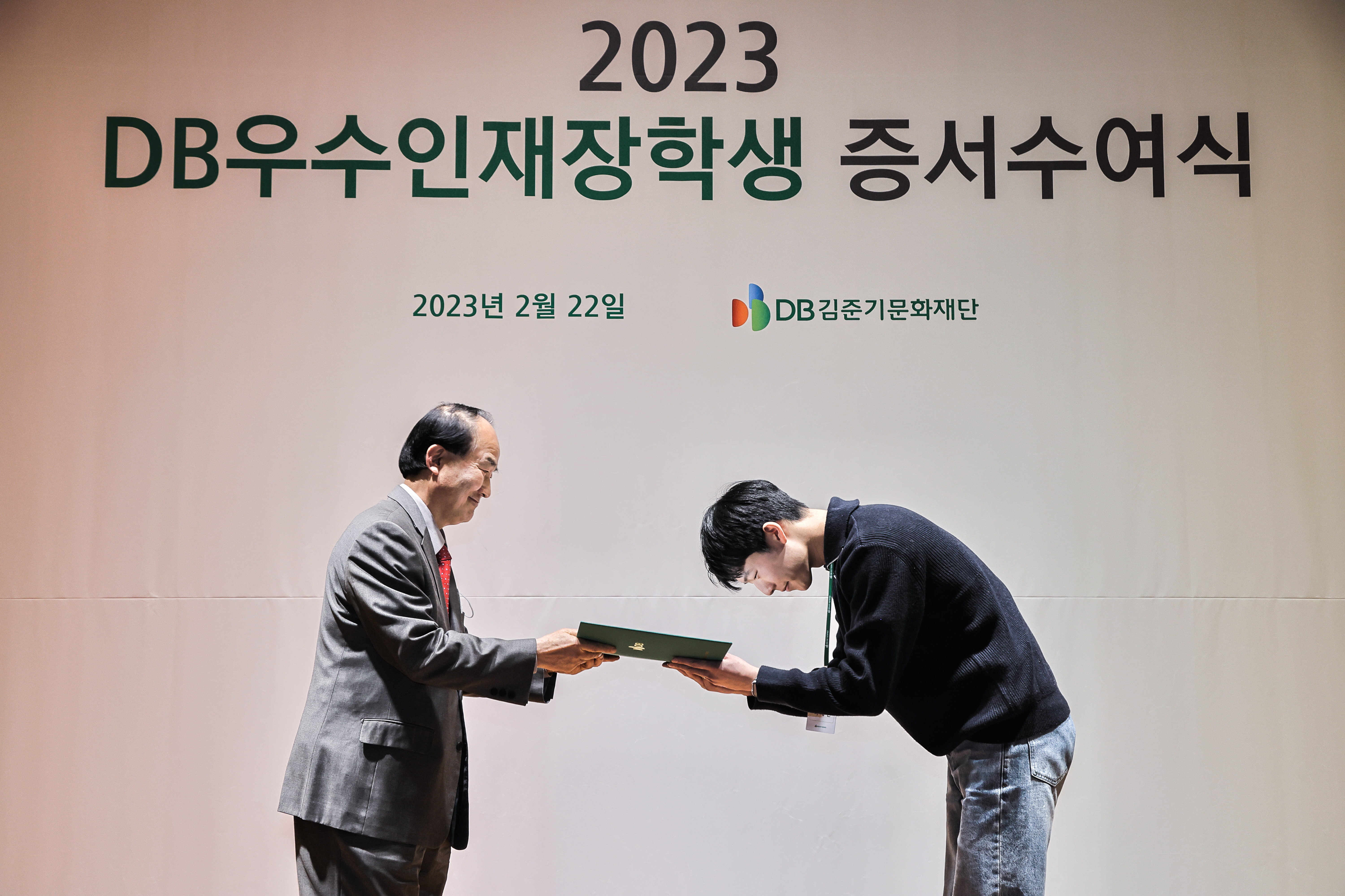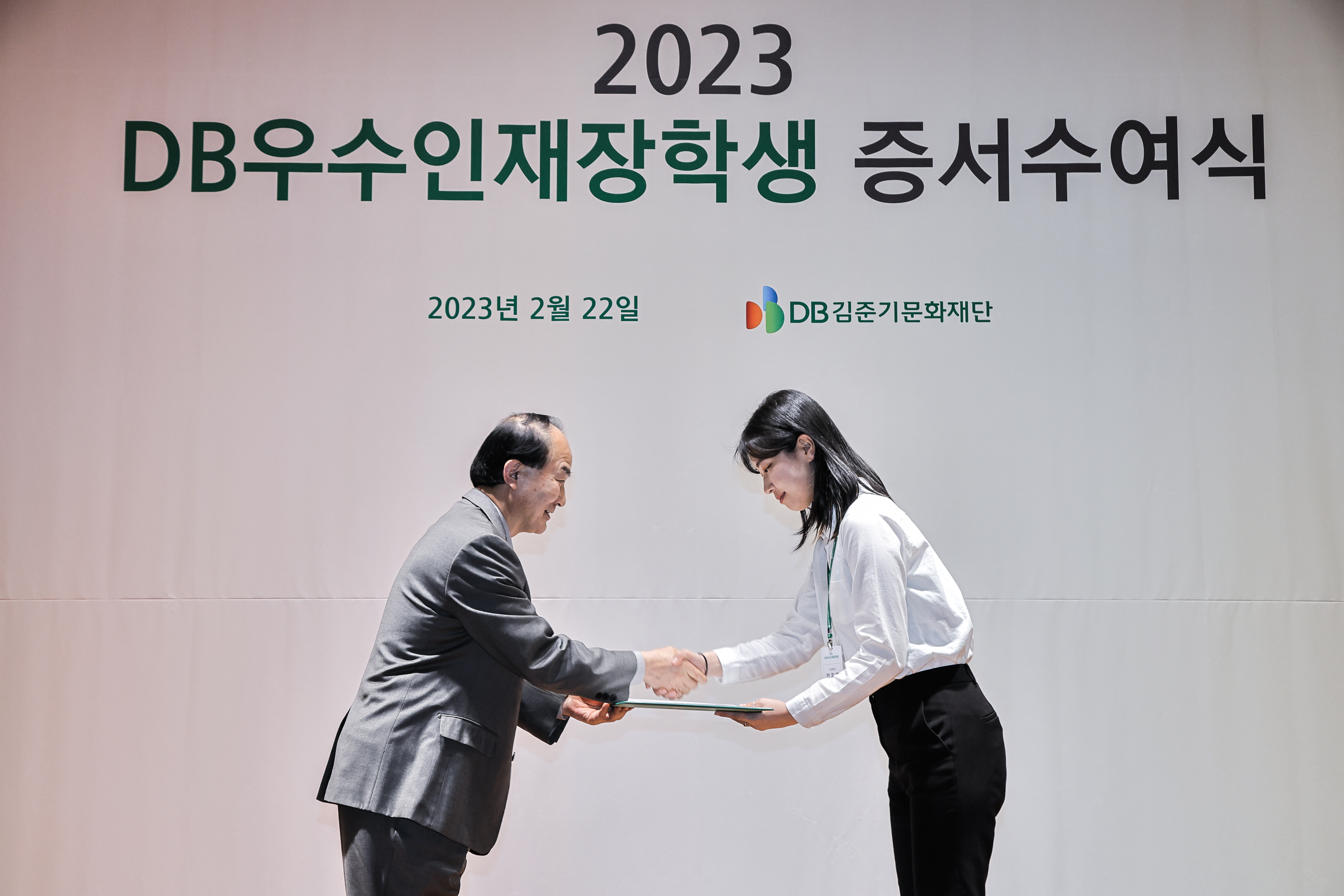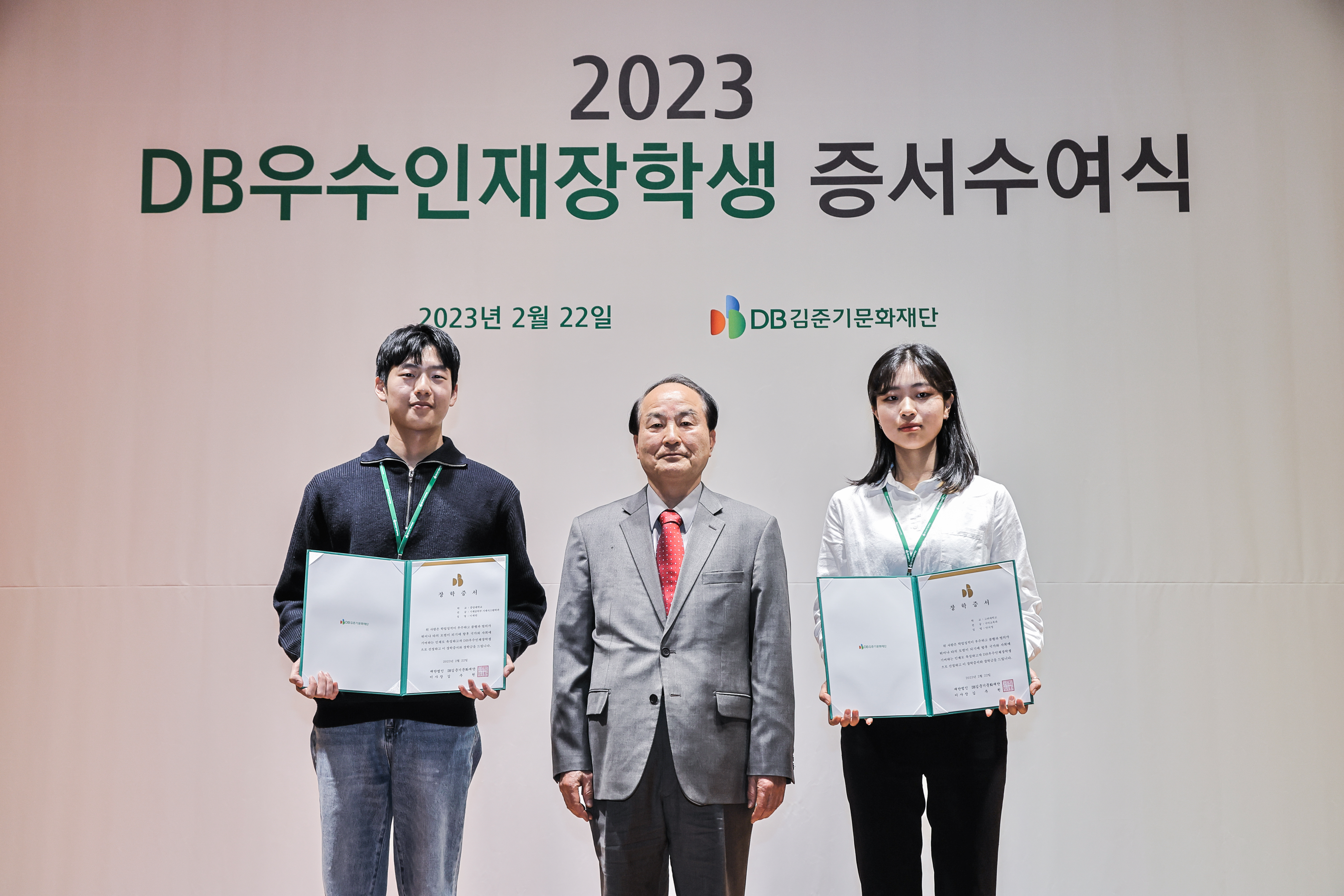 DB우수인재장학생 장학증서는 2023년 전체 장학생을 대표하여 고려대학교 안지영 장학생과 중앙대학교 이세헌 장학생에게 전달되었습니다. 행사에 참석한 장학생과 재단 관계자, 내빈들 모두 2023 DB우수인재장학생의 첫걸음을 축하하는 박수를 보내주셨습니다.