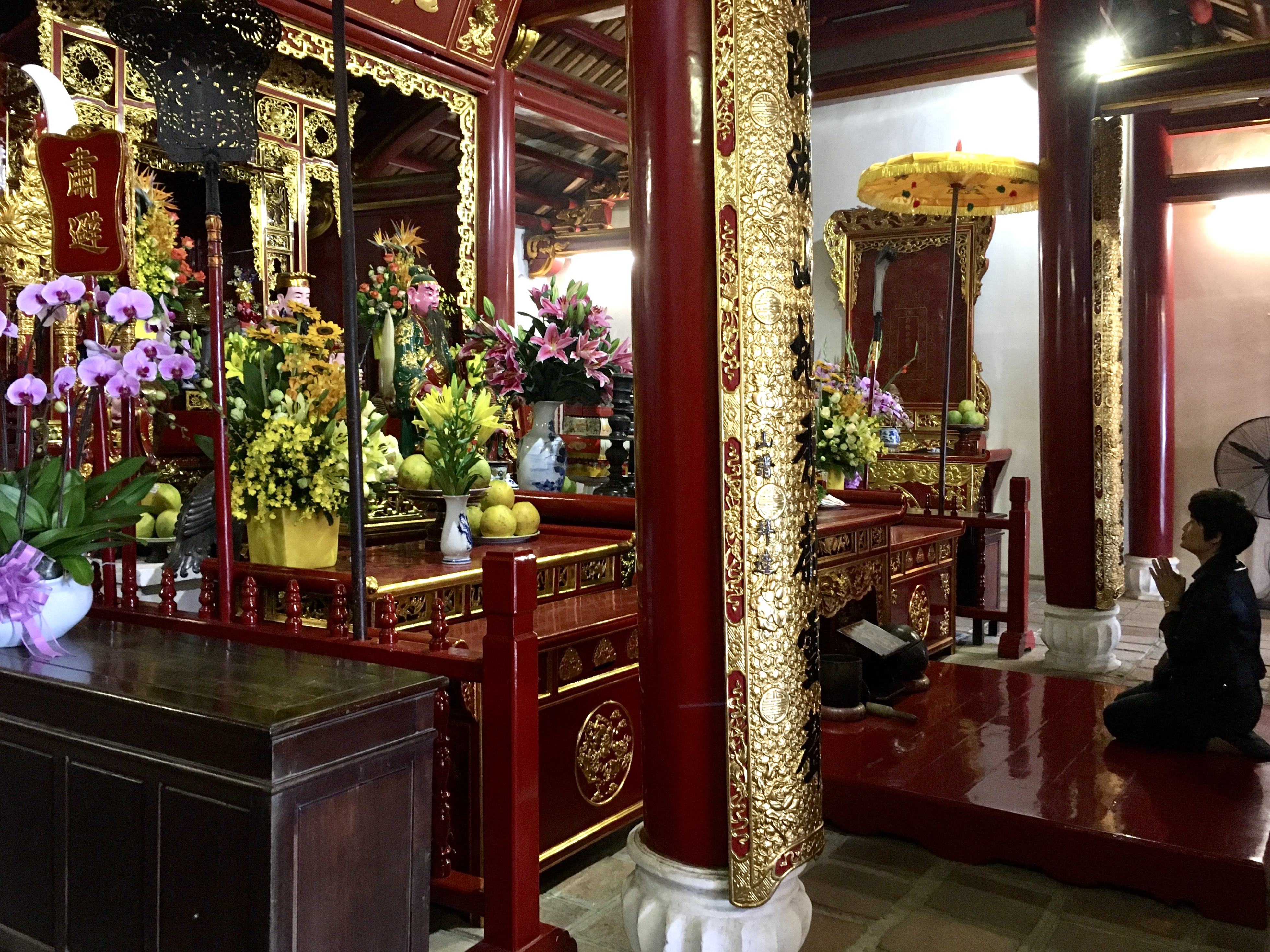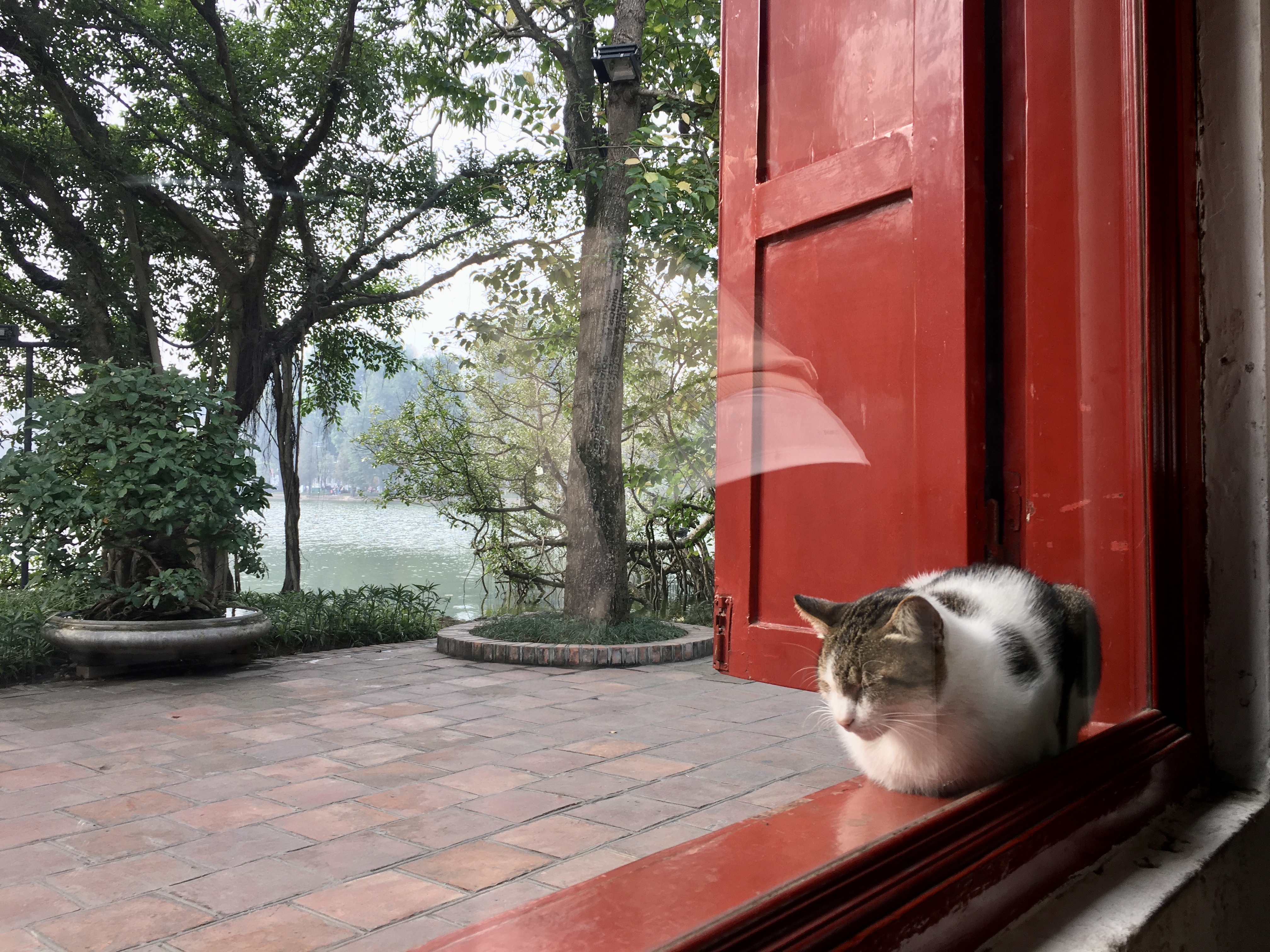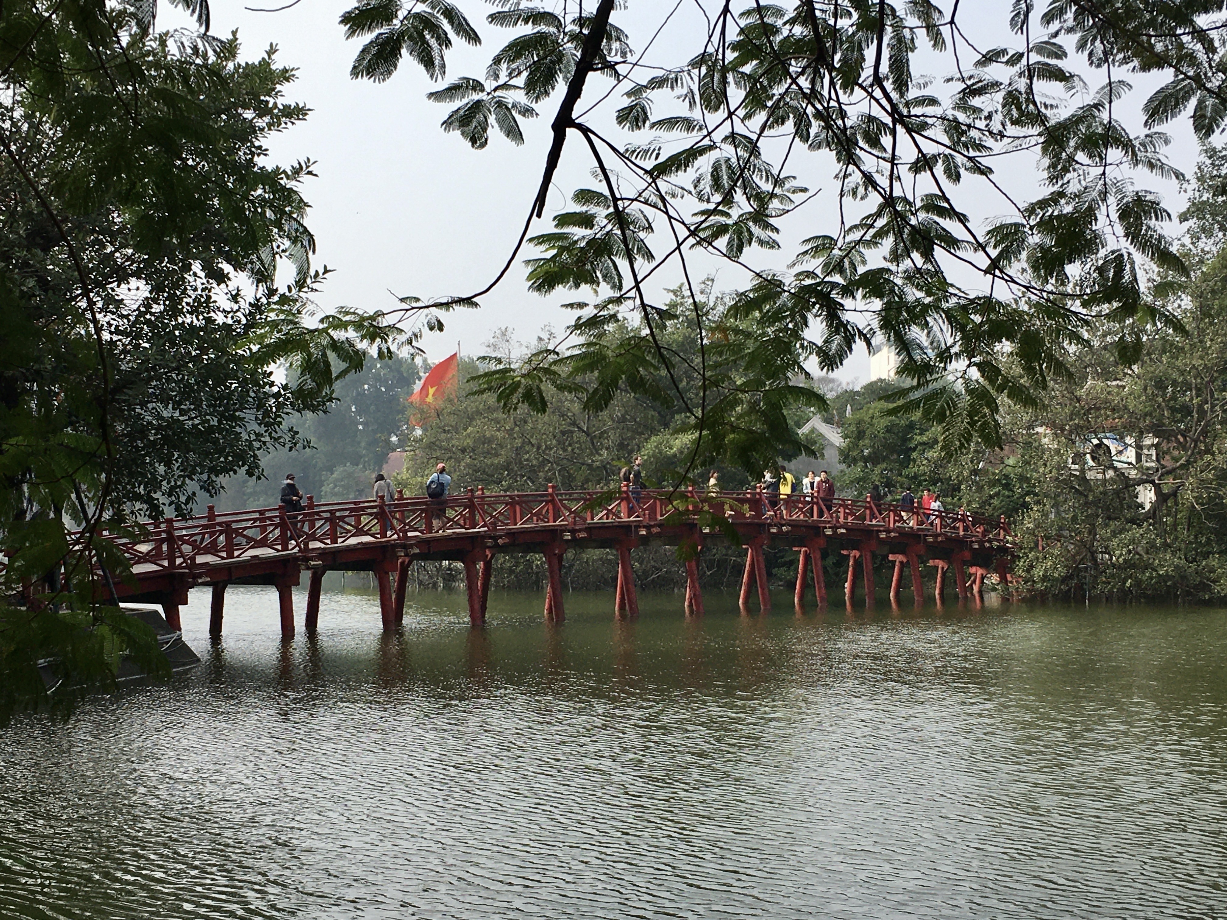 호수 동쪽에서 사당으로 들어가는 ‘테 훅’ 다리는 '따뜻한 아침 햇살'이라는 뜻이 있을 만큼 붉어요. 어둠이 내리면 붉은 조명을 밝혀 낮보다 더 강렬한 인상을 주죠. 다리는 사당 입구 왼편에서 바라보는 전경이 가장 아름답습니다.