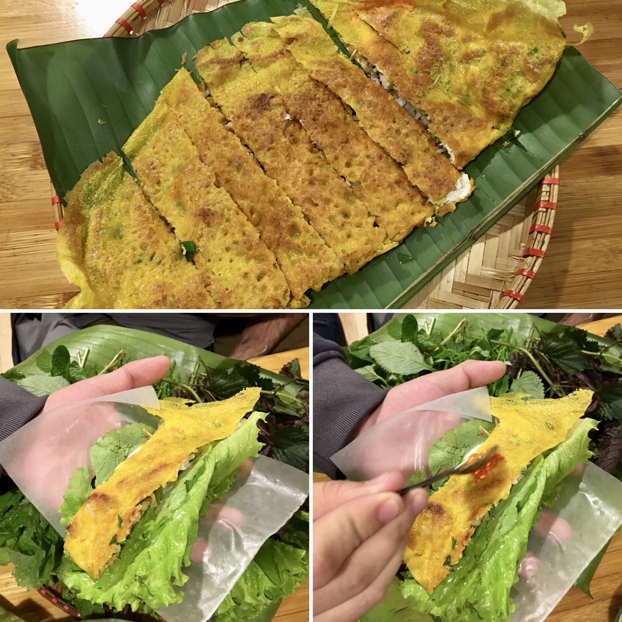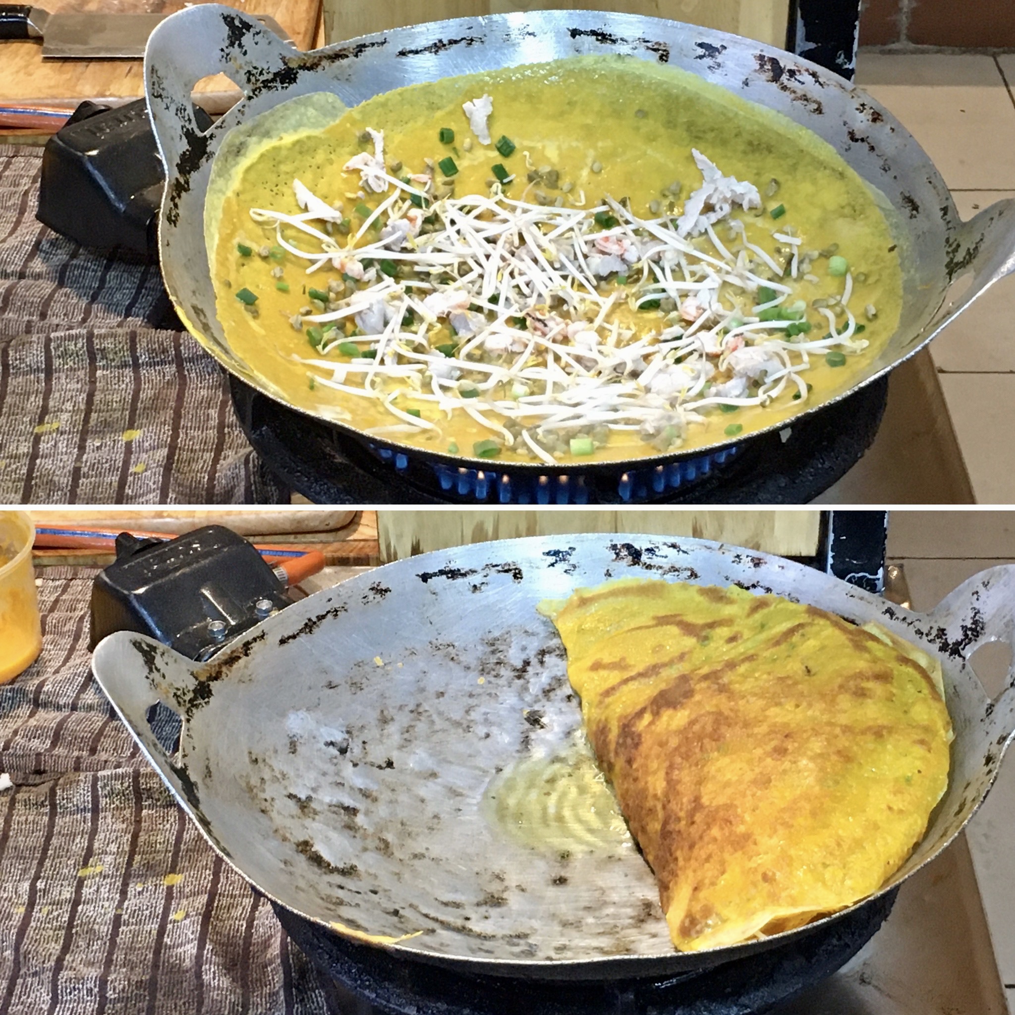 반쎄오는 숙주와 고기, 새우를 넣은 베트남식 빈대떡이라고 할 수 있어요. '분보남보(Bún Bò Nam Bộ)'에서 반쎄오를 만드는 걸 봤는데. 탐은 푼 계란을 달궈진 팬에 올릴 때 '쎄오 쎄오' 소리가 나서 쎄오라는 이름이 붙었다고 설명해 주었어요.