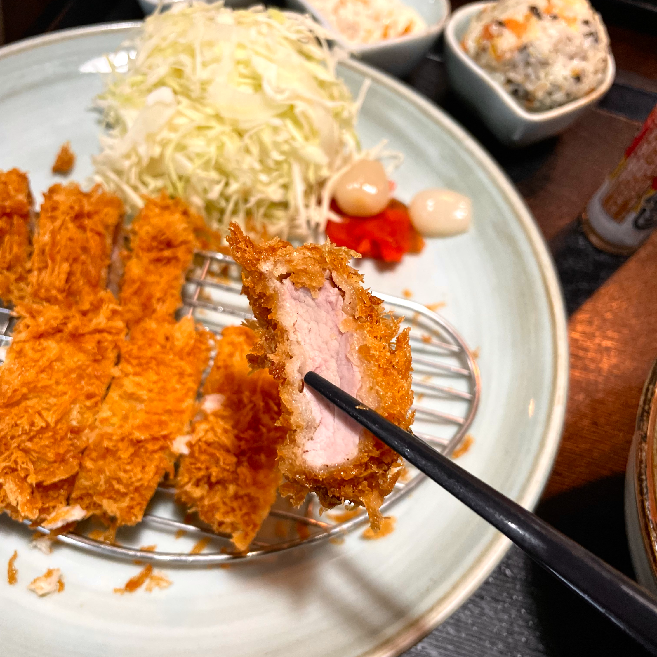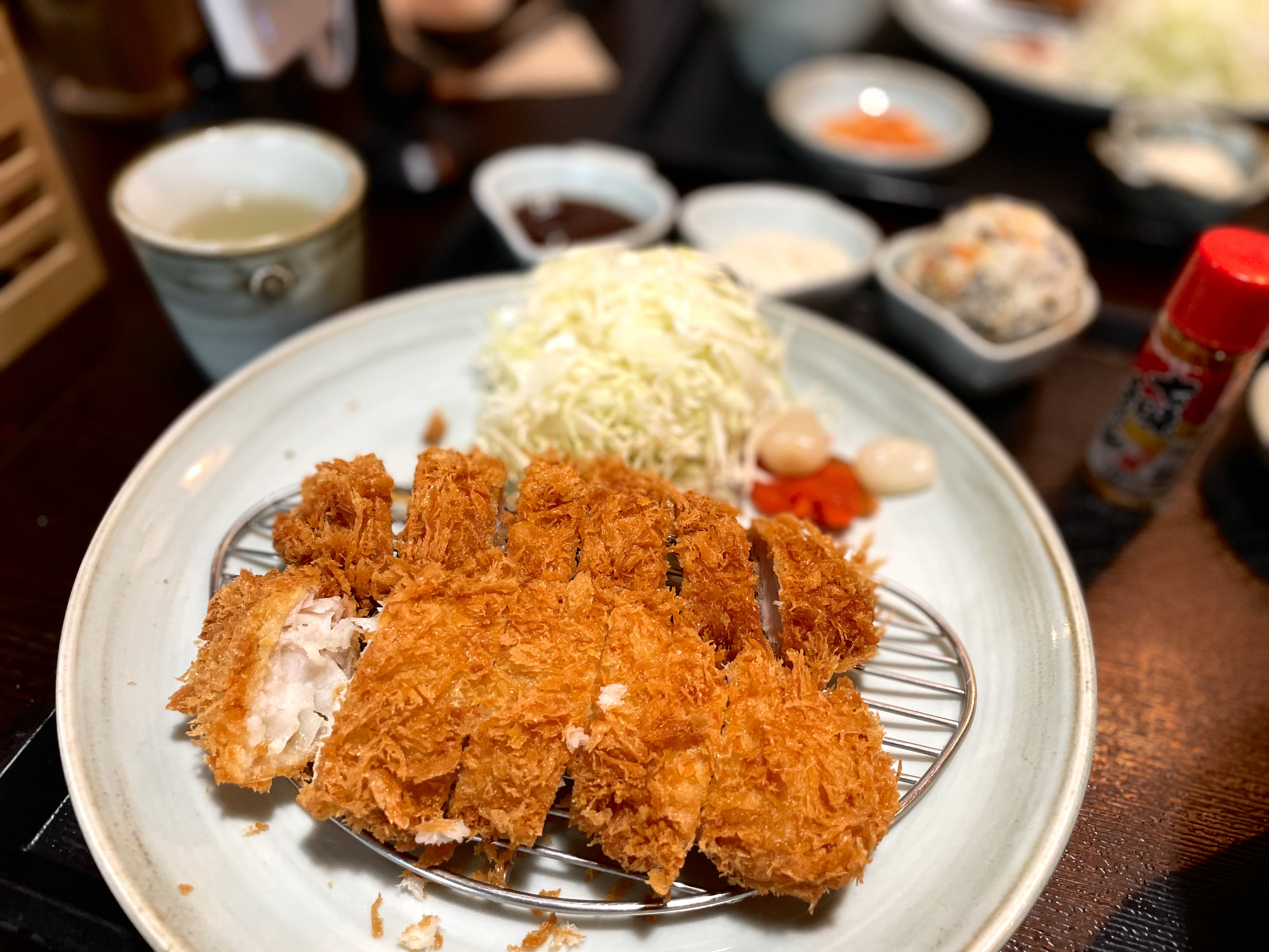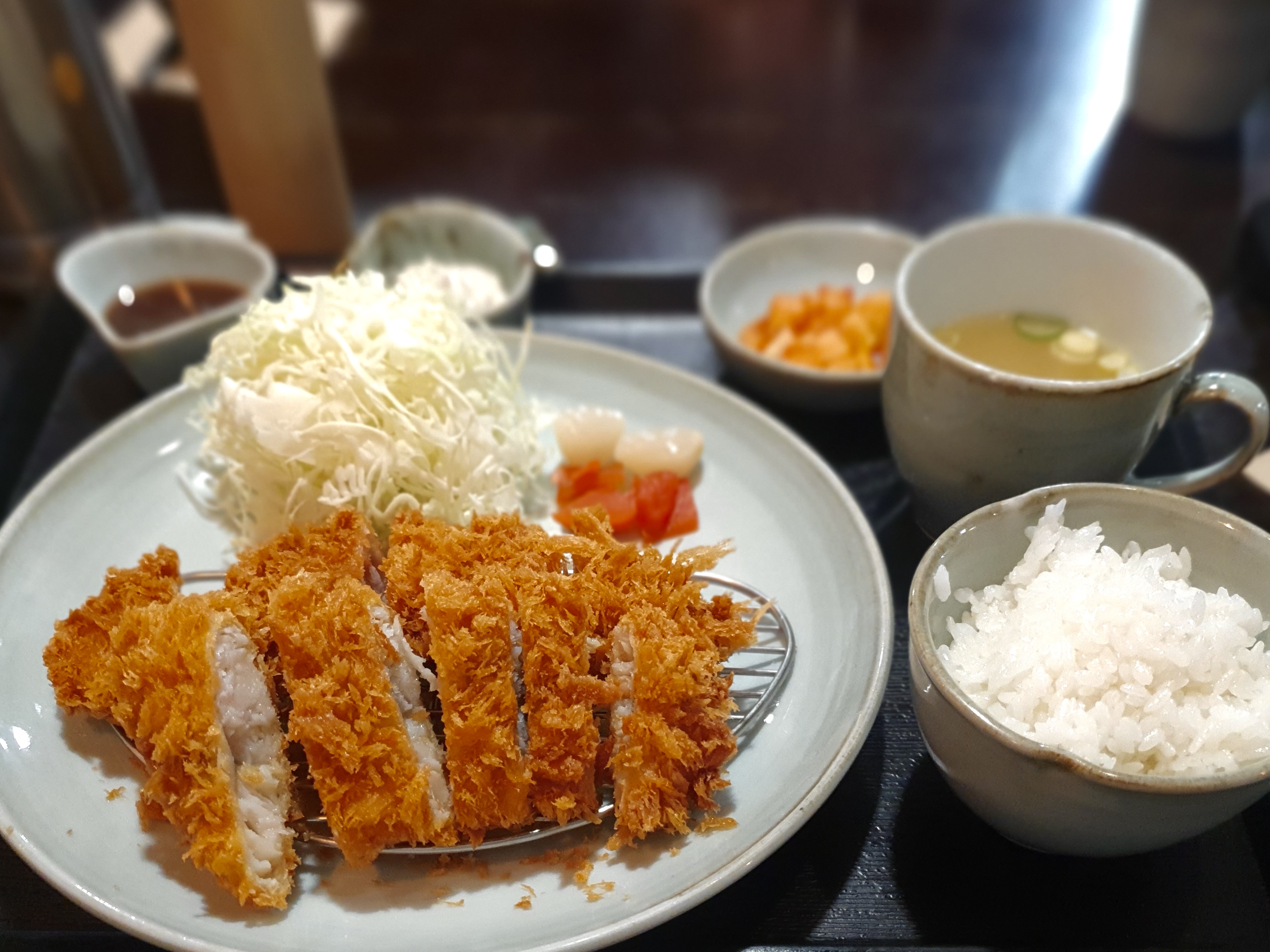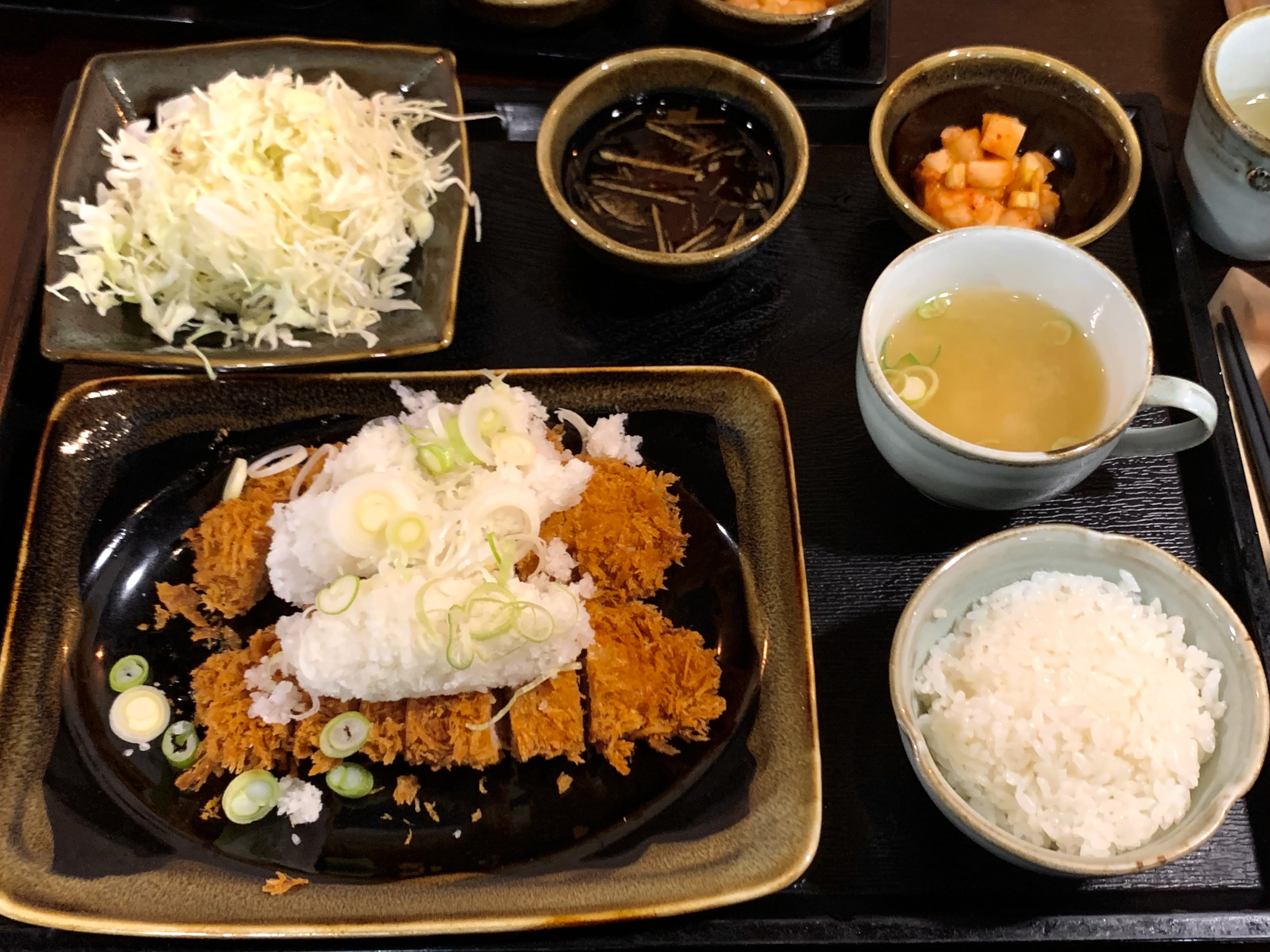 다음으로 주문한 오로시까스는 정식이 아닌 일반 돈까스 메뉴로, 샐러드와 장국이 포함된 한끼에 먹기 딱 좋은 깔끔한 구성이었습니다. 오로시까스의 ‘오로시’는 ‘무’를 뜻하는데요, 무즙이 올라간 안심 돈까스를 ‘오로시까스’라고 부른다고 합니다. 갈린 무, 파와 함께 돈까스를 새콤한 유자소스에 적셔 먹으니 돈까스의 느끼함이 전혀 없어서 평소보다 훨씬 많이 먹을 수 있었답니다!