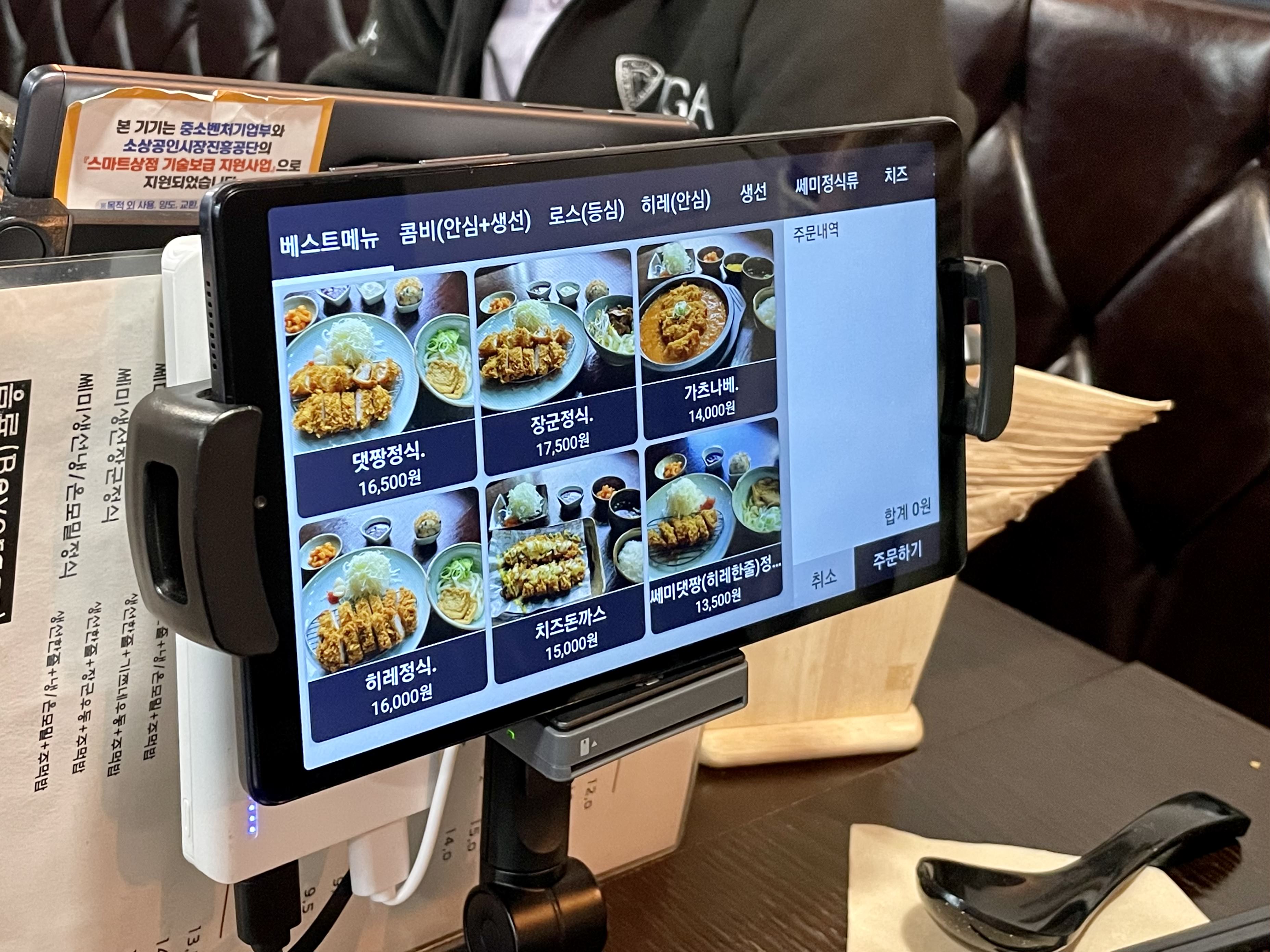 댓짱돈까스에는 자리마다 미니 키오스크가 있어 빠른 주문이 가능했어요. 미니 키오스크를 통해 메뉴 구성을 사진으로 미리 볼 수 있어 편리했고, 주문과 동시에 바로 결제까지 할 수 있는 시스템이었습니다.
