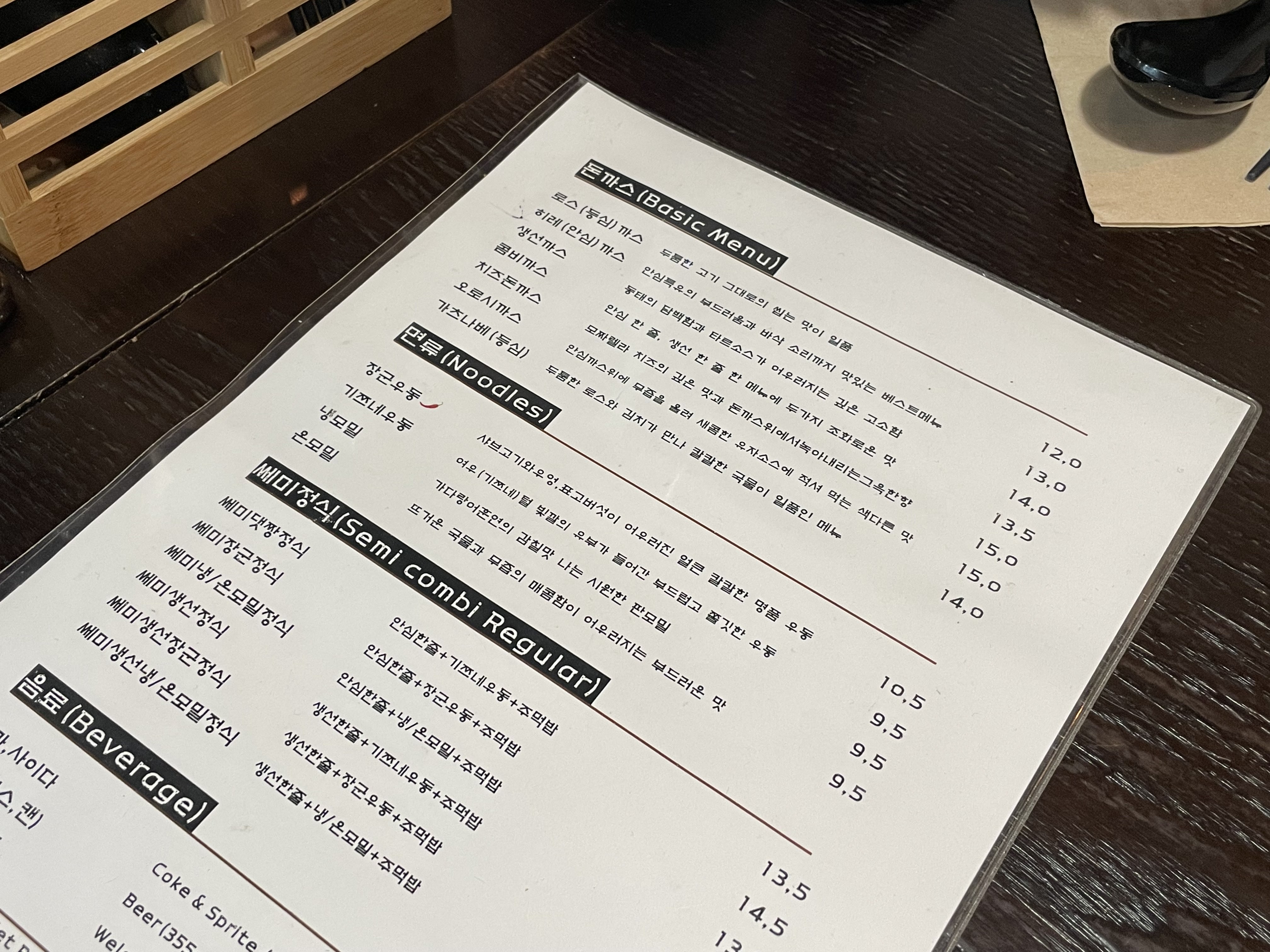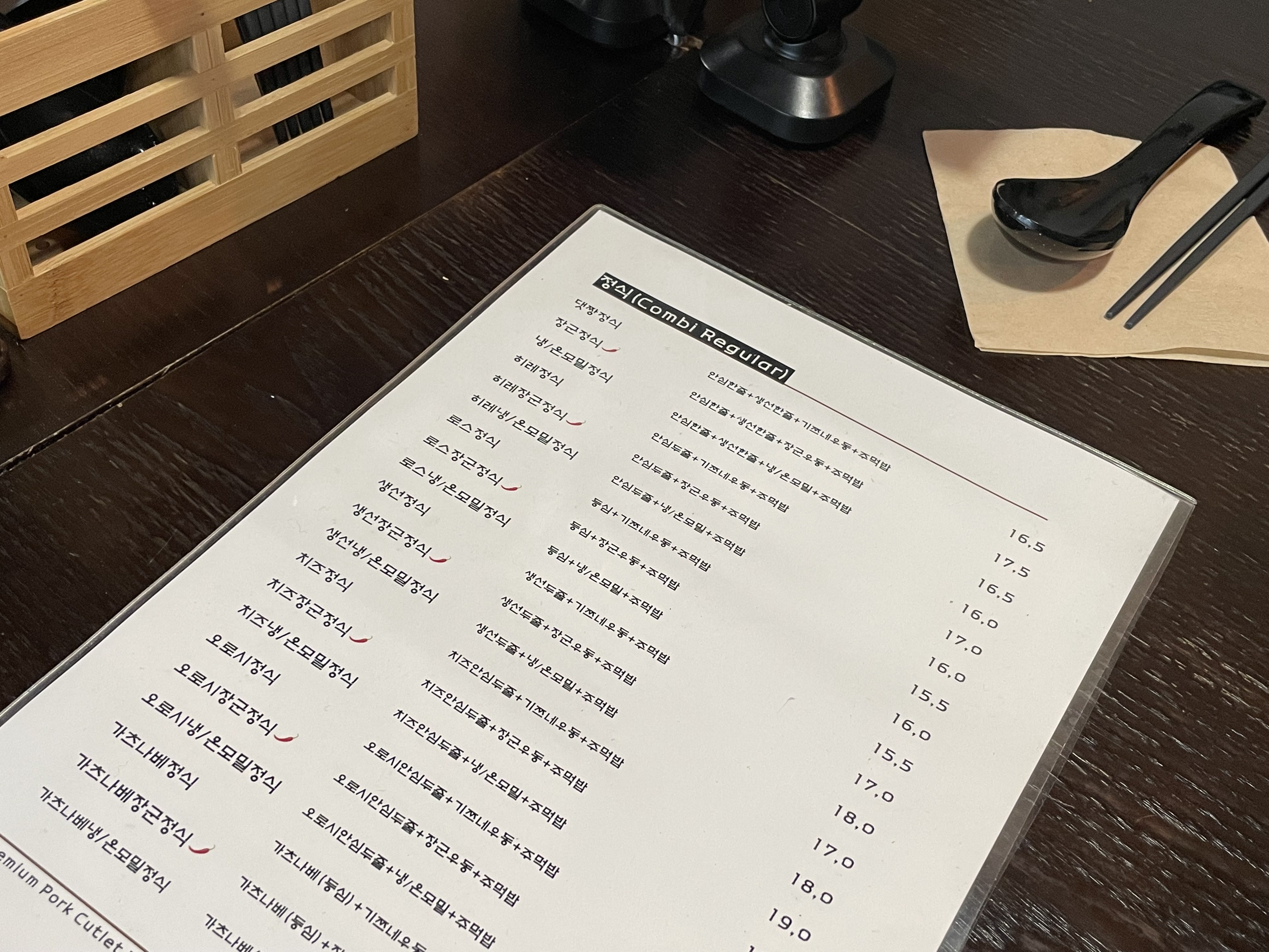 키오스크가 사진으로 메뉴 구성을 보여줬다면, 메뉴판에는 각 메뉴들이 어떤 구성으로 되어있는지 글로 설명되어 있었습니다. 베스트 메뉴인 댓짱정식, 장군정식뿐만 아니라 다른 메뉴와 조합된 구성의 로스장군정식, 치즈장군정식, 또 더 적은 양의 쎄미장군정식. 쎄미생선장군정식 등 모두의 취향과 양을 고려한 메뉴들이 굉장히 많아 놀라웠답니다.