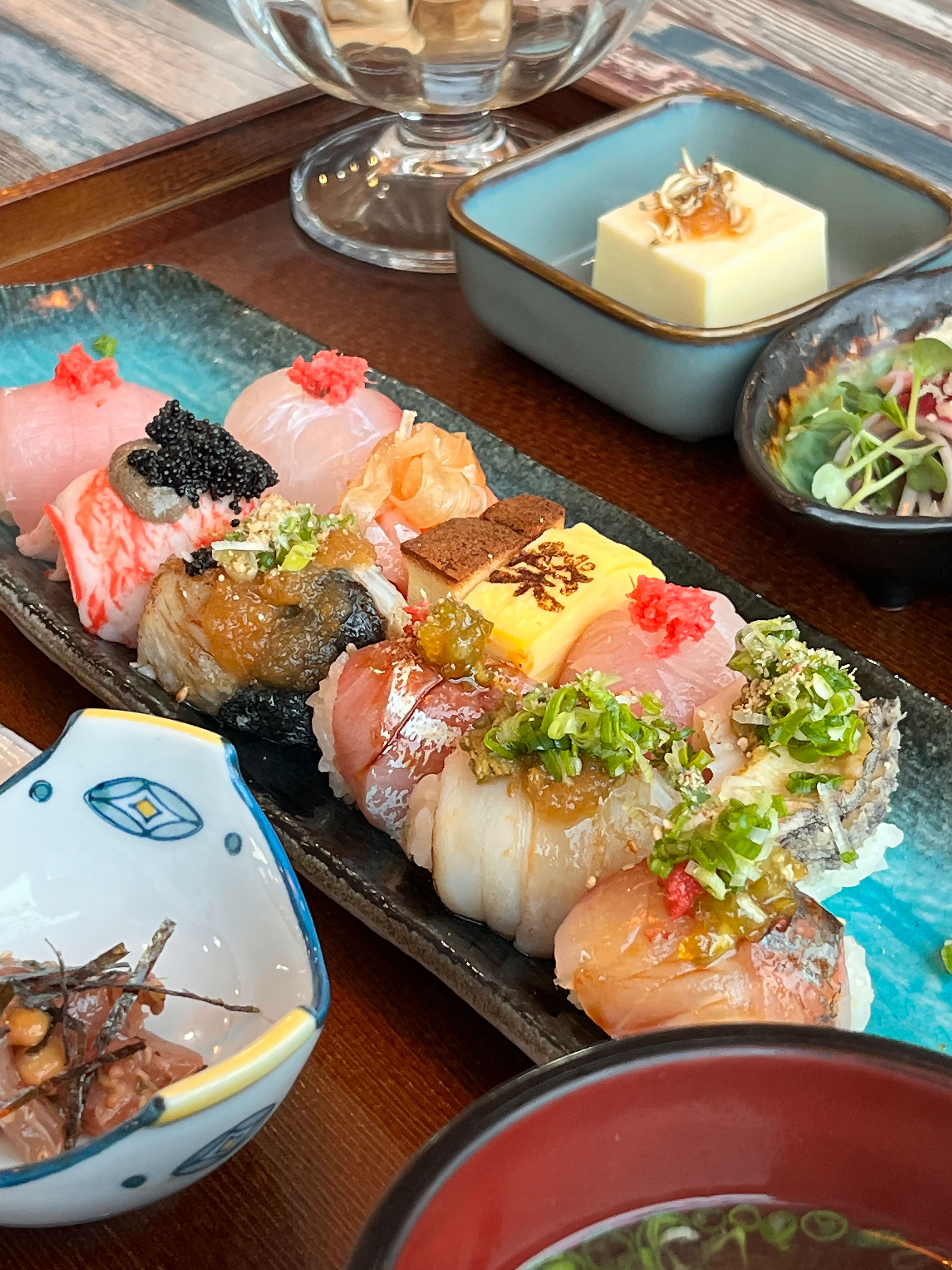 공항 근처에서 식당을 찾다가 발견한 보물 같은 초밥집 소개해 드릴게요. 신라호텔 출신의 셰프가 만들어 주시는 초밥과 고등어 온사케, 해산물 덮밥 정식 등이 유명합니다. 특히 구슬 모양으로 귀엽게 만들어주시는 구슬 초밥 정식은 눈도 입도 즐겁게 만들어 줘요. 모든 메뉴는 정식으로 준비되는데 총 6개의 곁들임 메뉴가 함께 나와 미식을 즐길 수 있습니다. 특히 초밥 위에 올라간 토핑은 그 종류가 조금씩 달랐는데요. 횟감과 가장 어울리는 토핑을 얹어 주셔 테이블에 써져 있는 메뉴 설명을 보며 식재료를 맞추는 즐거움까지 느낄 수 있습니다.
