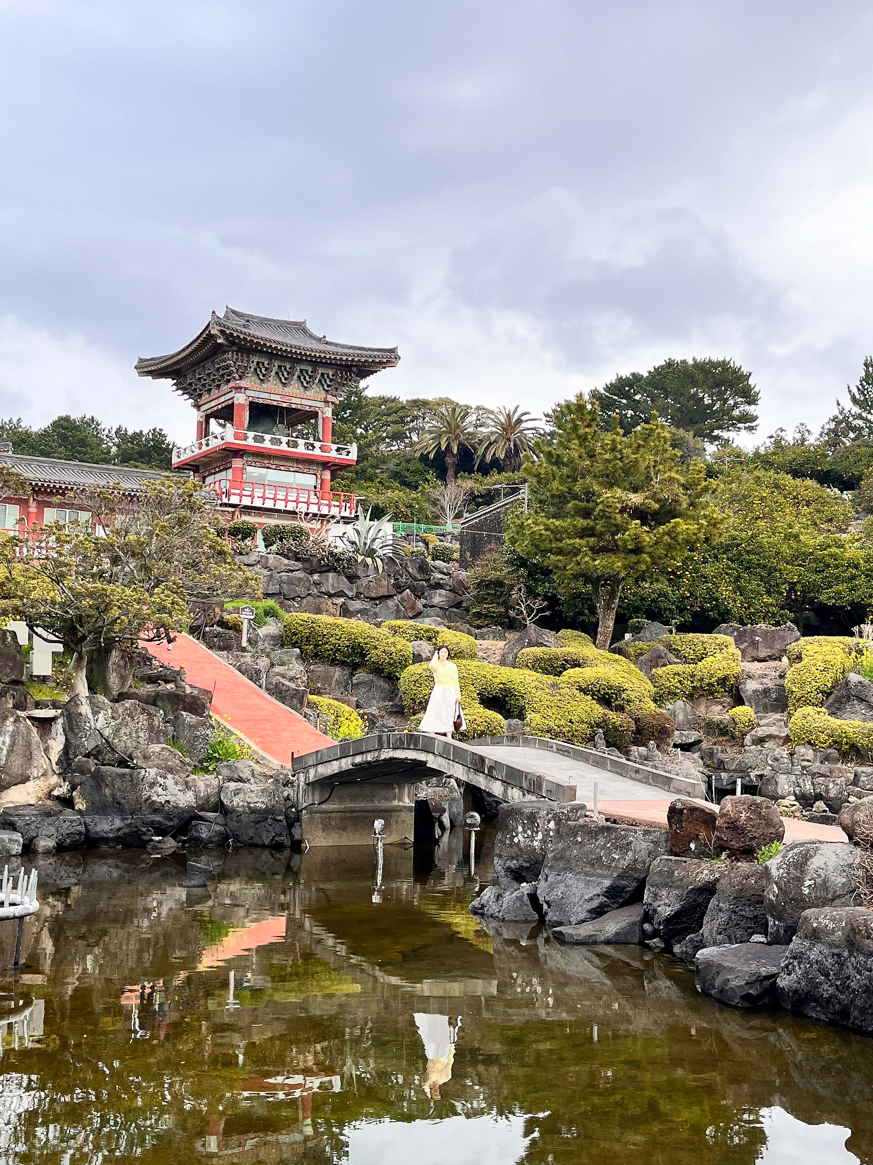 넓은 사찰 내, 제가 꼽은 포토 스팟은 바로 이곳입니다. 연못의 정중앙이 아닌 살짝 사선에서 바라보는 구도가 돌다리와 함께 전경을 담을 수 있어 좋아요. 연못을 한 바퀴 둘러보았다면 곧게 뻗은 길을 따라 올라가 보세요. 눈앞에 제주 남쪽의 바다를 한눈에 담을 수 있는 풍경이 펼쳐집니다.