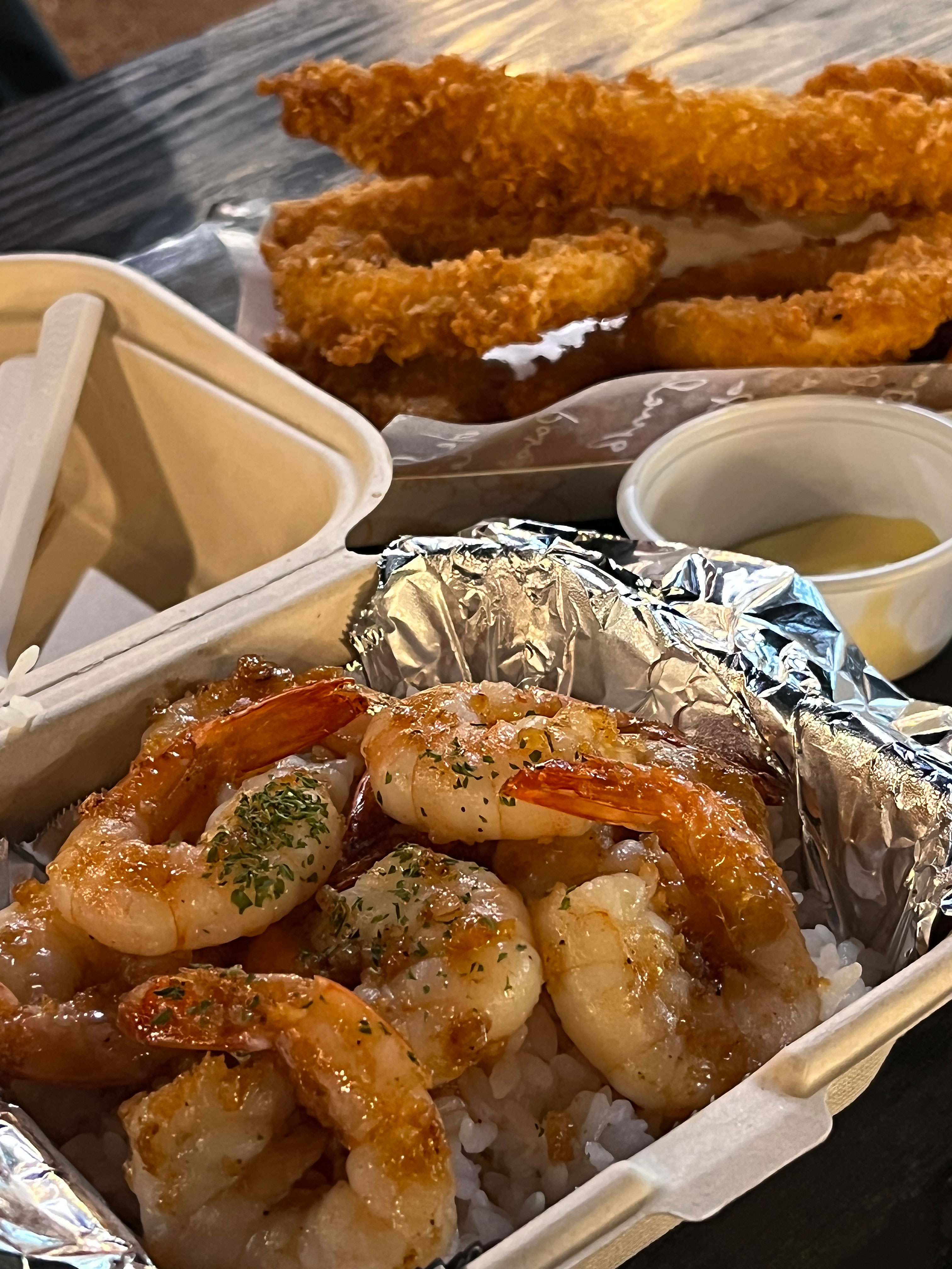 제주 수목원길 야시장은 깔끔하고 푸드트럭의 종류도 다양해 오랜 시간을 머물렀는데요. 저는 간단히 오징어튀김과 갈릭 새우 덮밥으로 골라봤는데 푸드트럭 메뉴 중에는 말고기 넓적다리가 유명하다고 합니다.