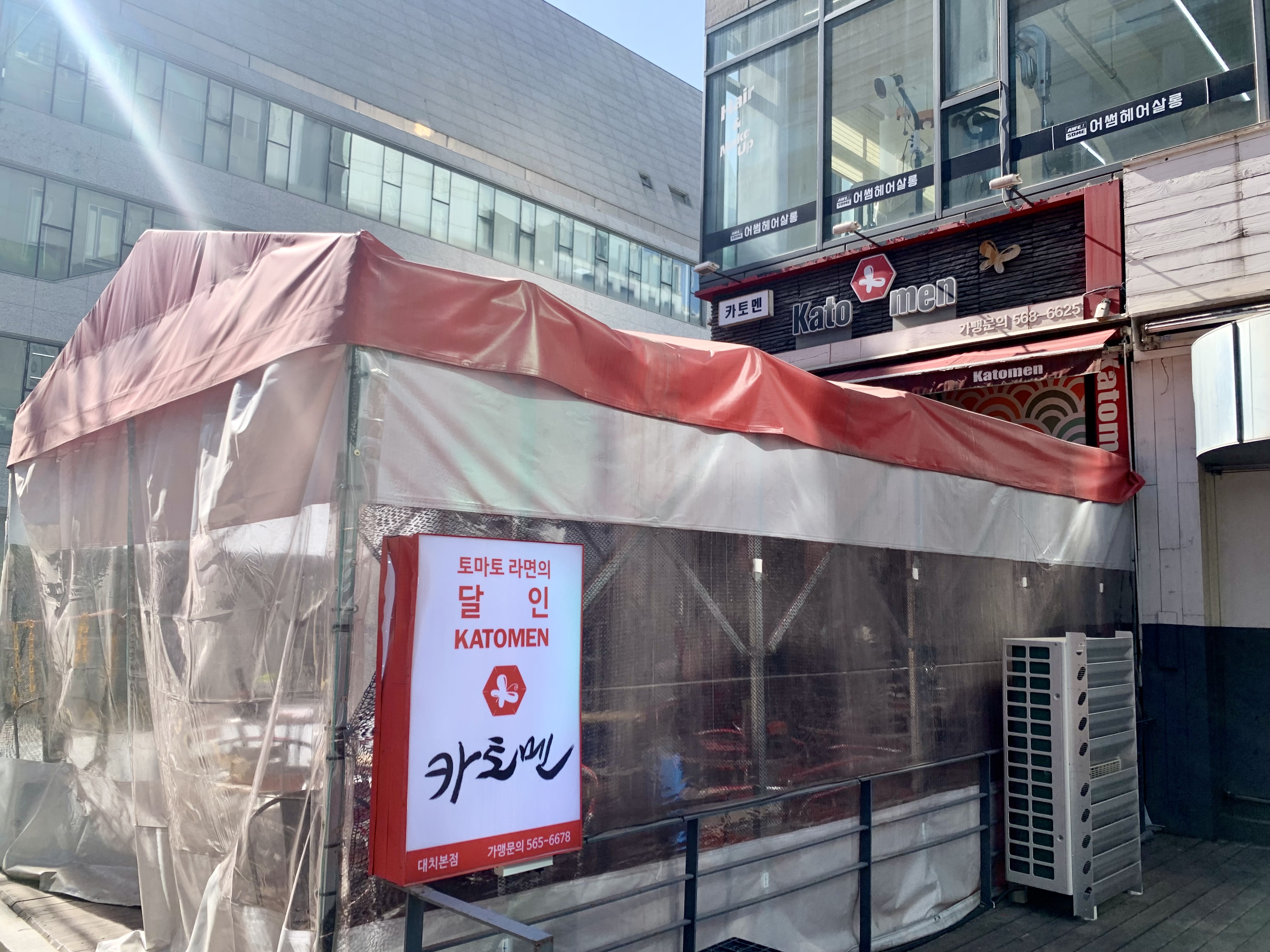 카토멘 대치본점은 선릉역과 포스코사거리 사이에 위치해 있습니다. 평일 화요일 오전 11시 15분에 방문했을 때 웨이팅 없이 입장할 수 있었습니다. 선릉역 점심 맛집으로 유명한 만큼 평일 12시 이후의 점심시간에는 웨이팅이 있지만, 메뉴가 금방 나오고 테이블 회전율이 높아 대기시간은 길지 않다고 해요. 내부 공간이 크지는 않았지만, 천막이 설치된 야외테이블이 마련되어 있어서 좌석 수가 적지 않았습니다. 가게 곳곳에서 생활의 달인 토마토라멘 달인 맛집으로 인증 받은 흔적도 볼 수 있었습니다!