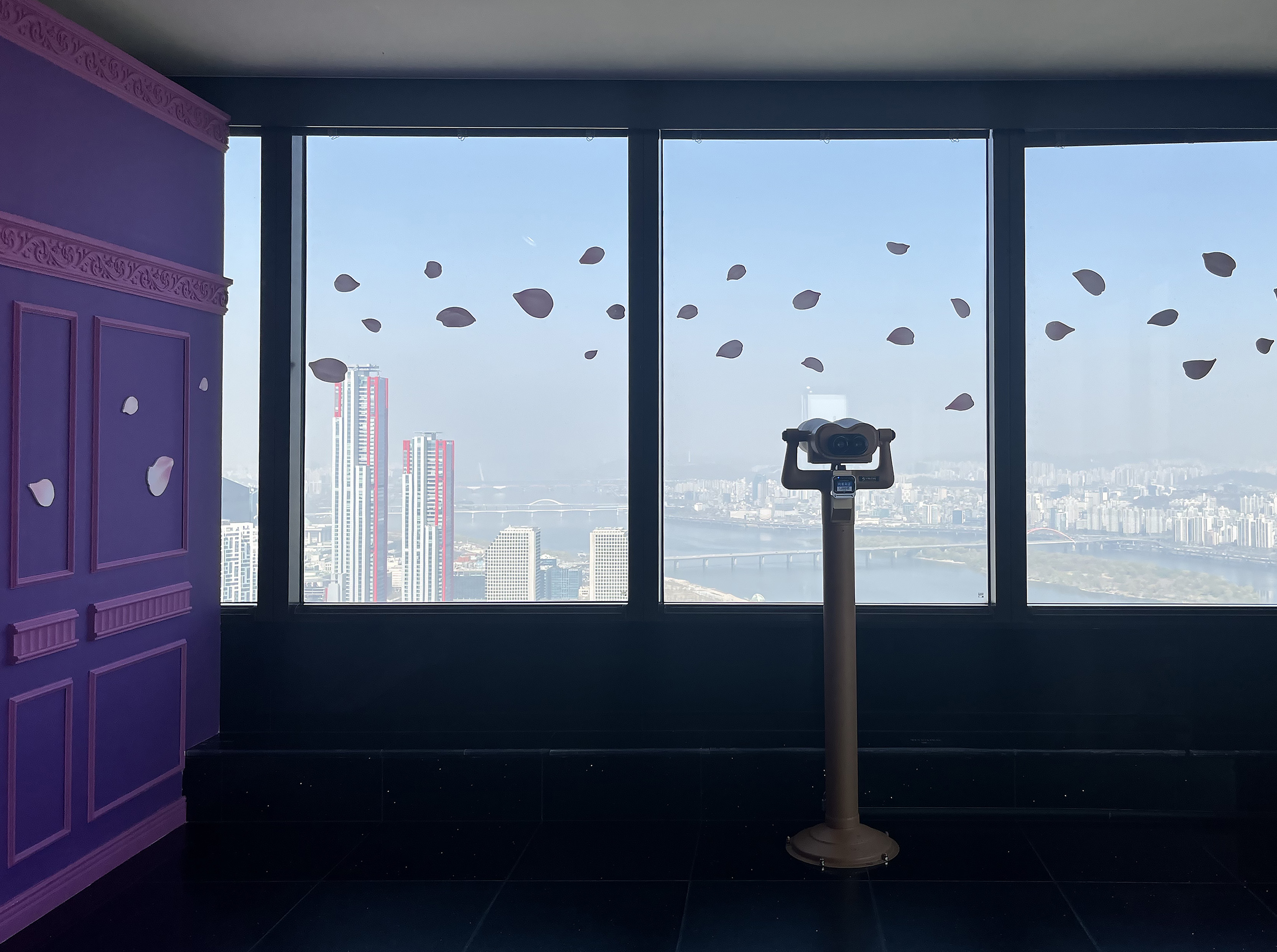 전용 엘리베이터를 타고 60층에 도착하면 전시 관람을 시작하기에 앞서 망원경(유료)을 통해 63빌딩에서 내려다보는 뷰를 즐겨보는 것도 좋겠습니다.