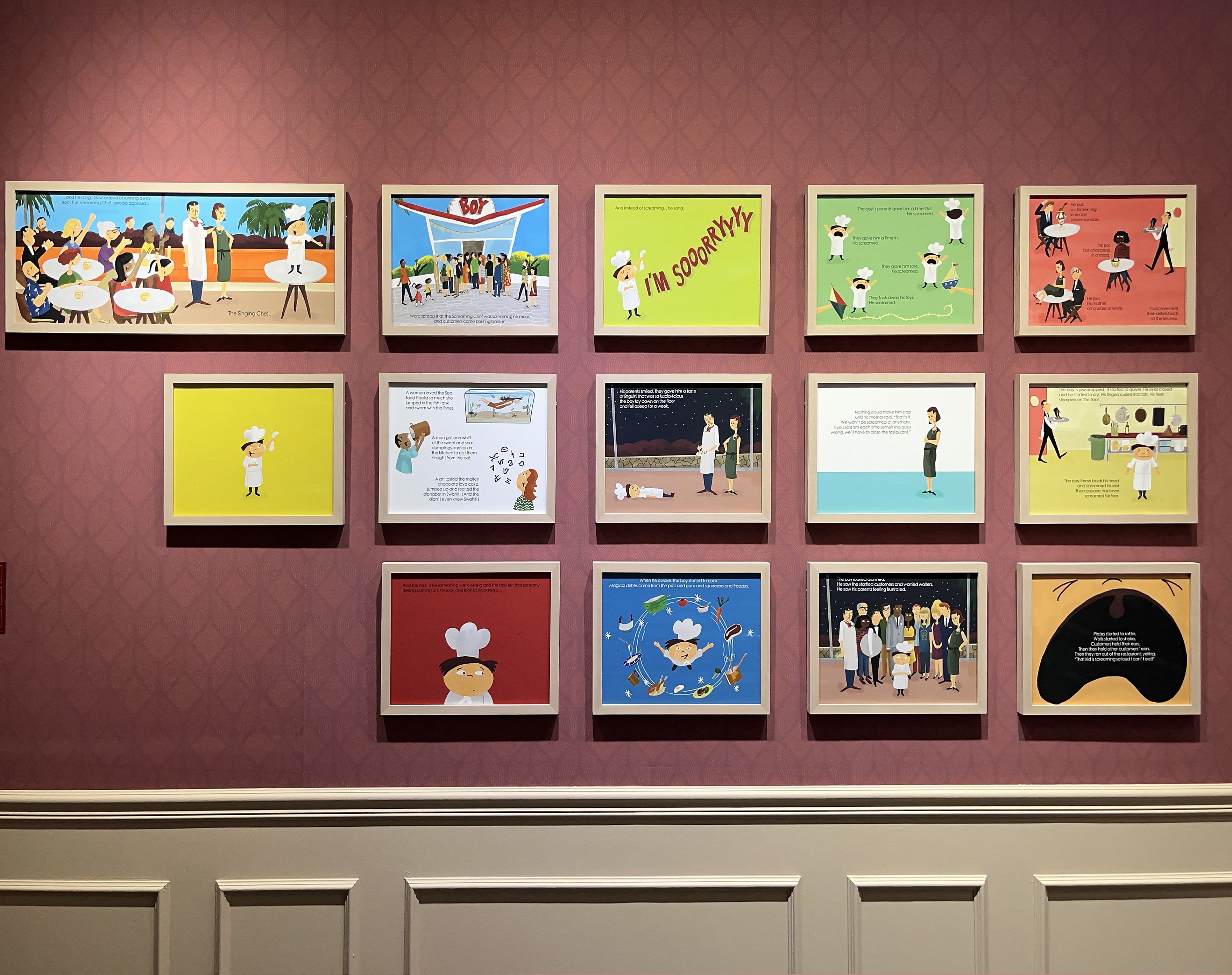 맥스 달튼은 영화 <로얄 테넌바움>으로 웨스 앤더슨의 영화 세계에 빠져들었다고 하는데요. 강박적일 정도로 완벽한 대칭을 표현해 내는 작품이 공통점인 두 아티스트의 작품들을 나란히 놓고 보면 그 어우러짐이 상당히 조화롭습니다. 특히 <프렌치 디스패치>와 <그랜드 부다페스트 호텔>을 테마로 한 작품들에서 그 매력을 여실히 느낄 수 있어요.