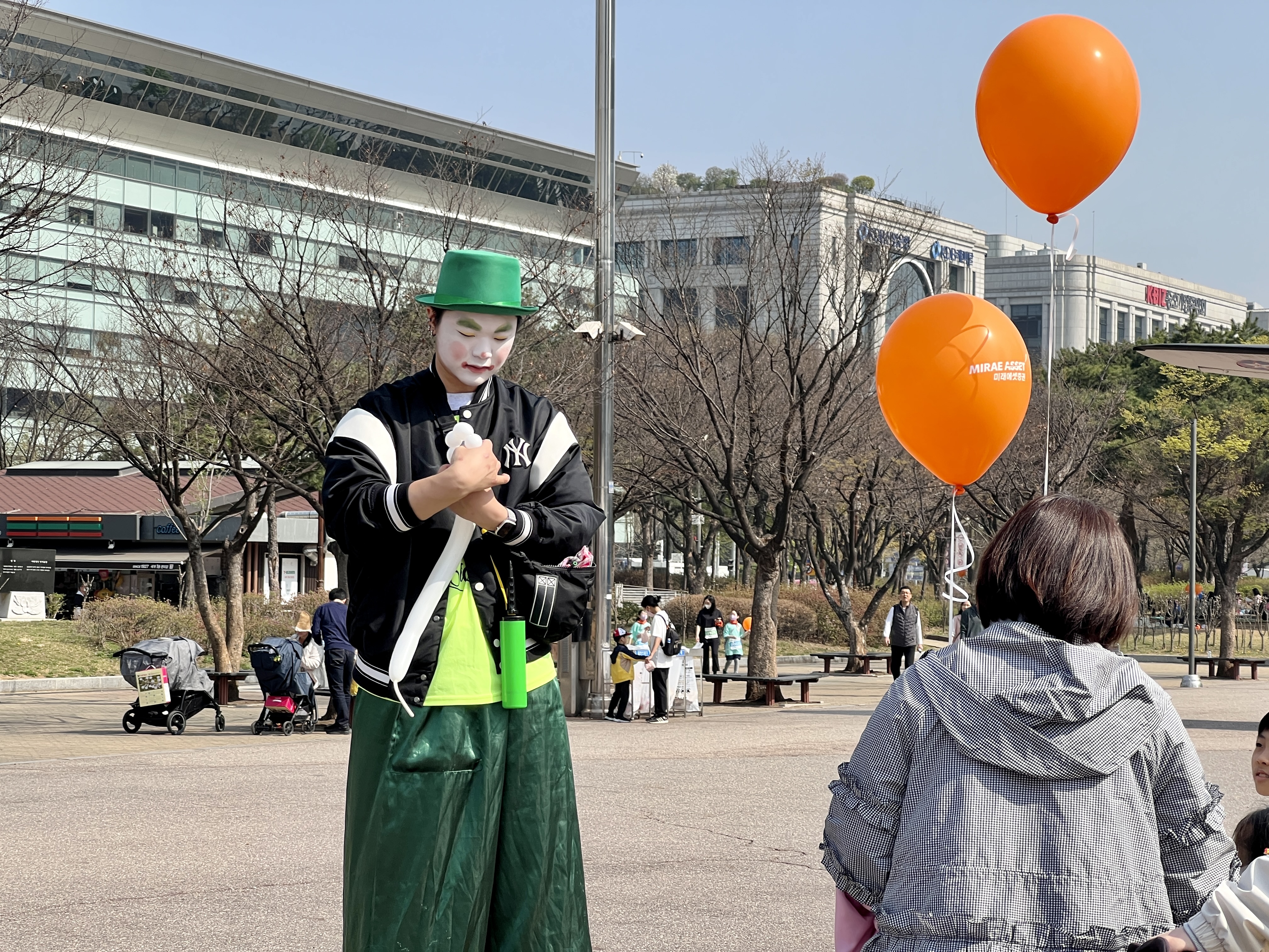키다리 퍼포머가 행사장 곳곳을 돌아다니면서 풍선 아트를 선보이며 환영인사를 건넸고, 놀이마당으로 조성한 불스패밀리파크에서는 스포츠게임과 클라이밍 체험, 증시활황 놀이를 즐겼다.