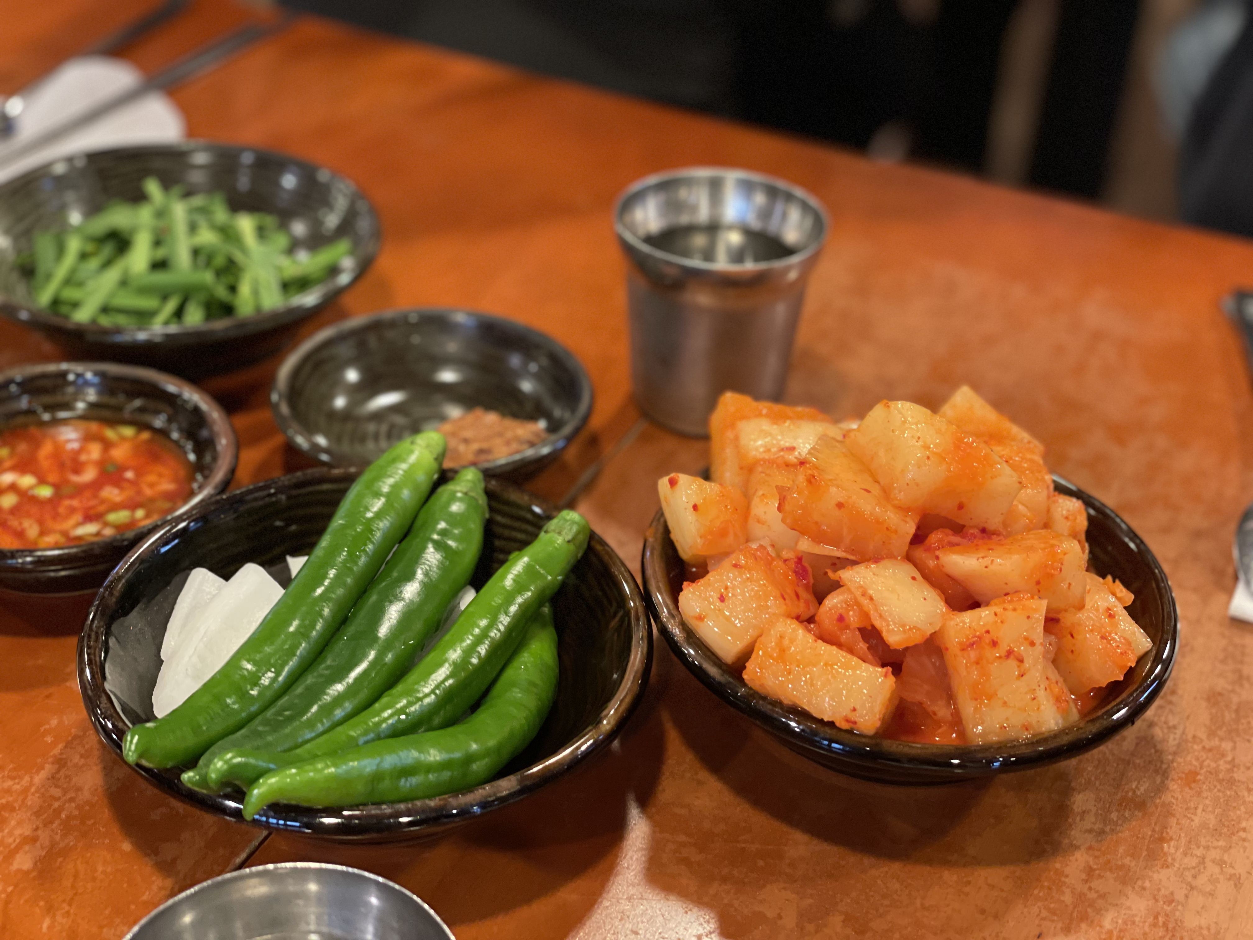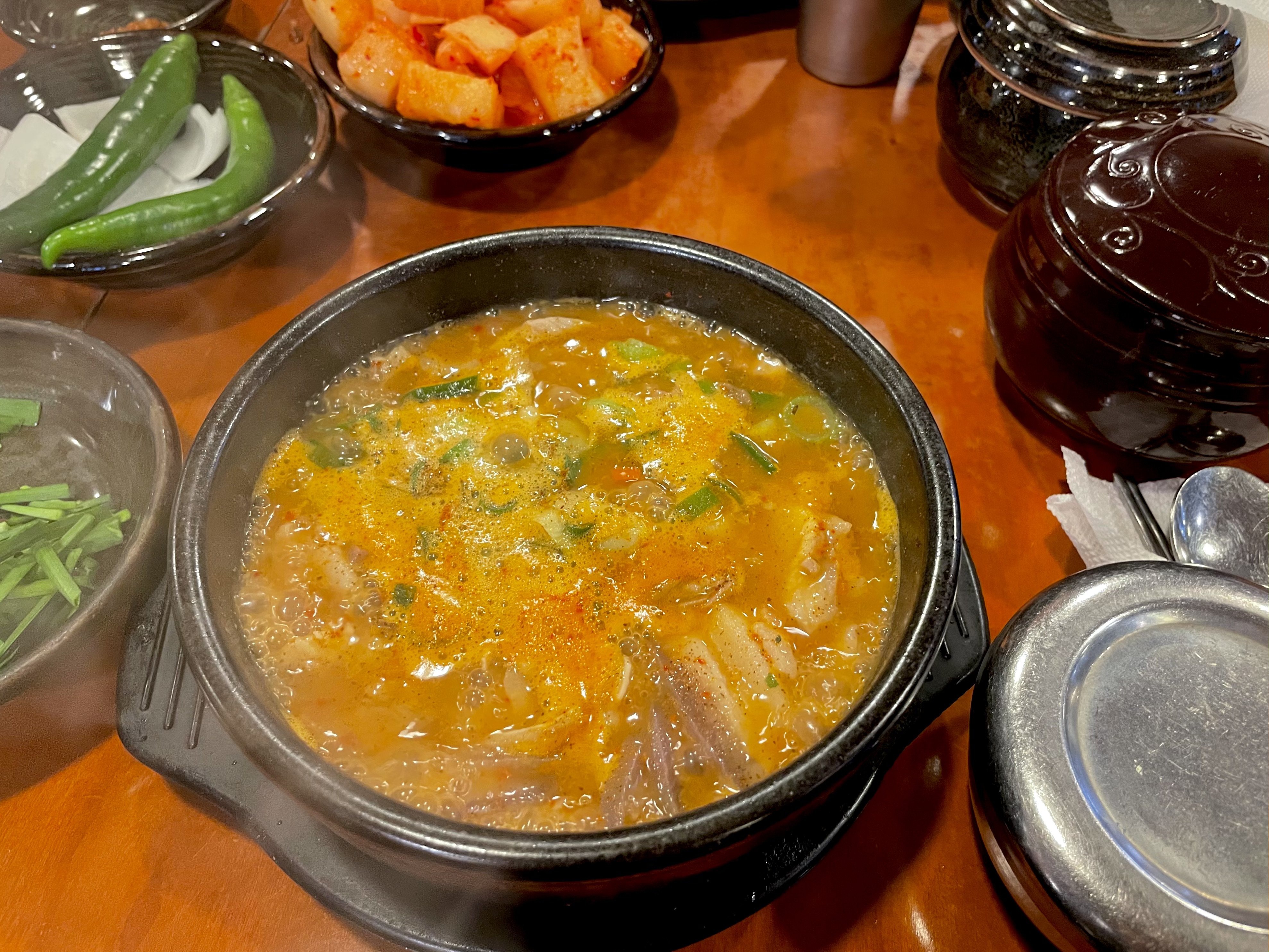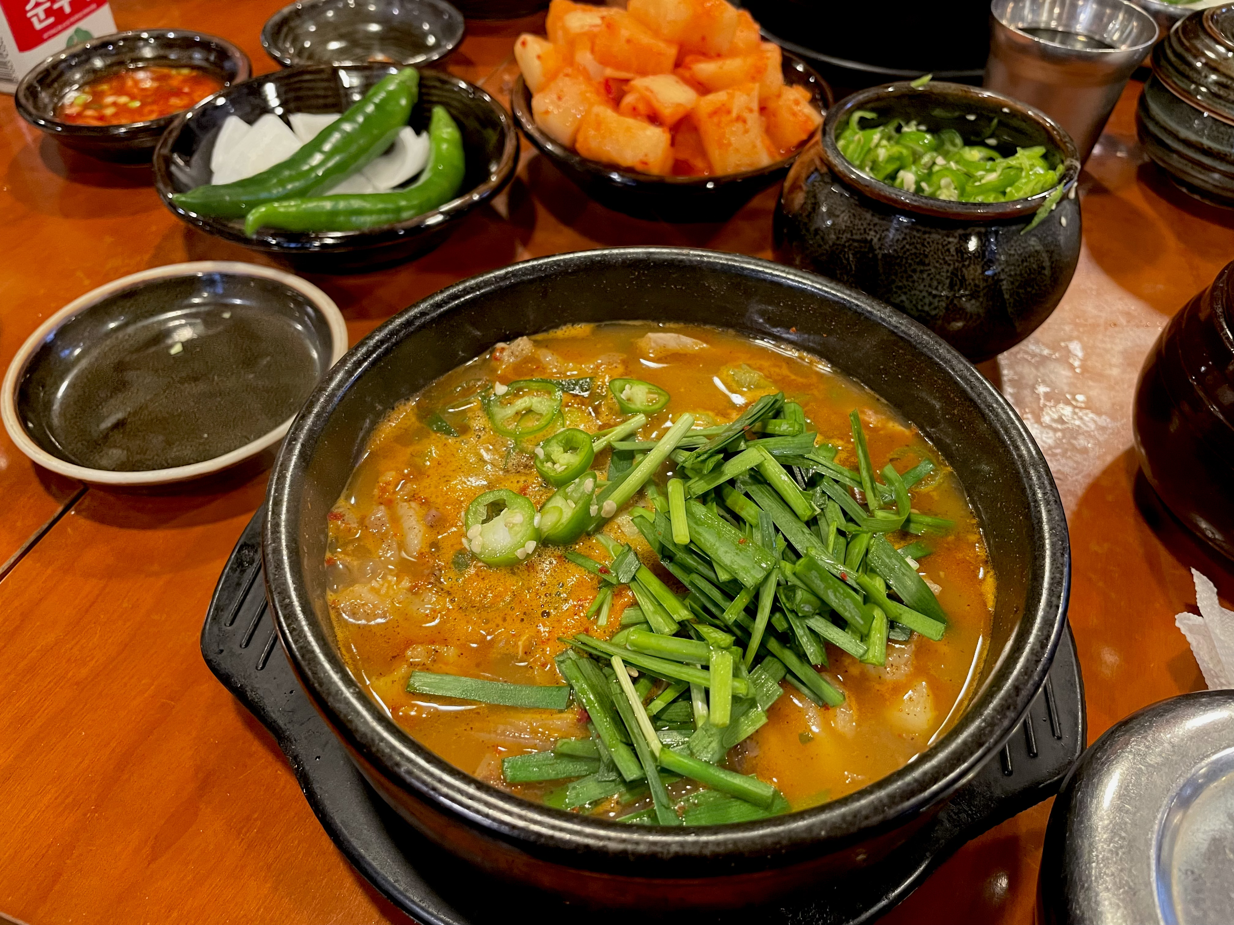 오이고추와 양파, 된장, 국밥에 넣어 먹을 수 있는 부추 무침과 고기를 찍어 먹을 수 있는 새우젓, 순댓국 먹을 때 빠질 수 없는 석박지까지! 다른 국밥집에서 볼 수 있는 기본적인 구성이지만, 이 기본 반찬이 맛있어야 맛집인 거 아시죠? 오이고추도 아삭하니 신선했고, 너무 달지 않고 알맞게 익은 석박지가 국밥과 함께 먹기 딱 좋았답니다.