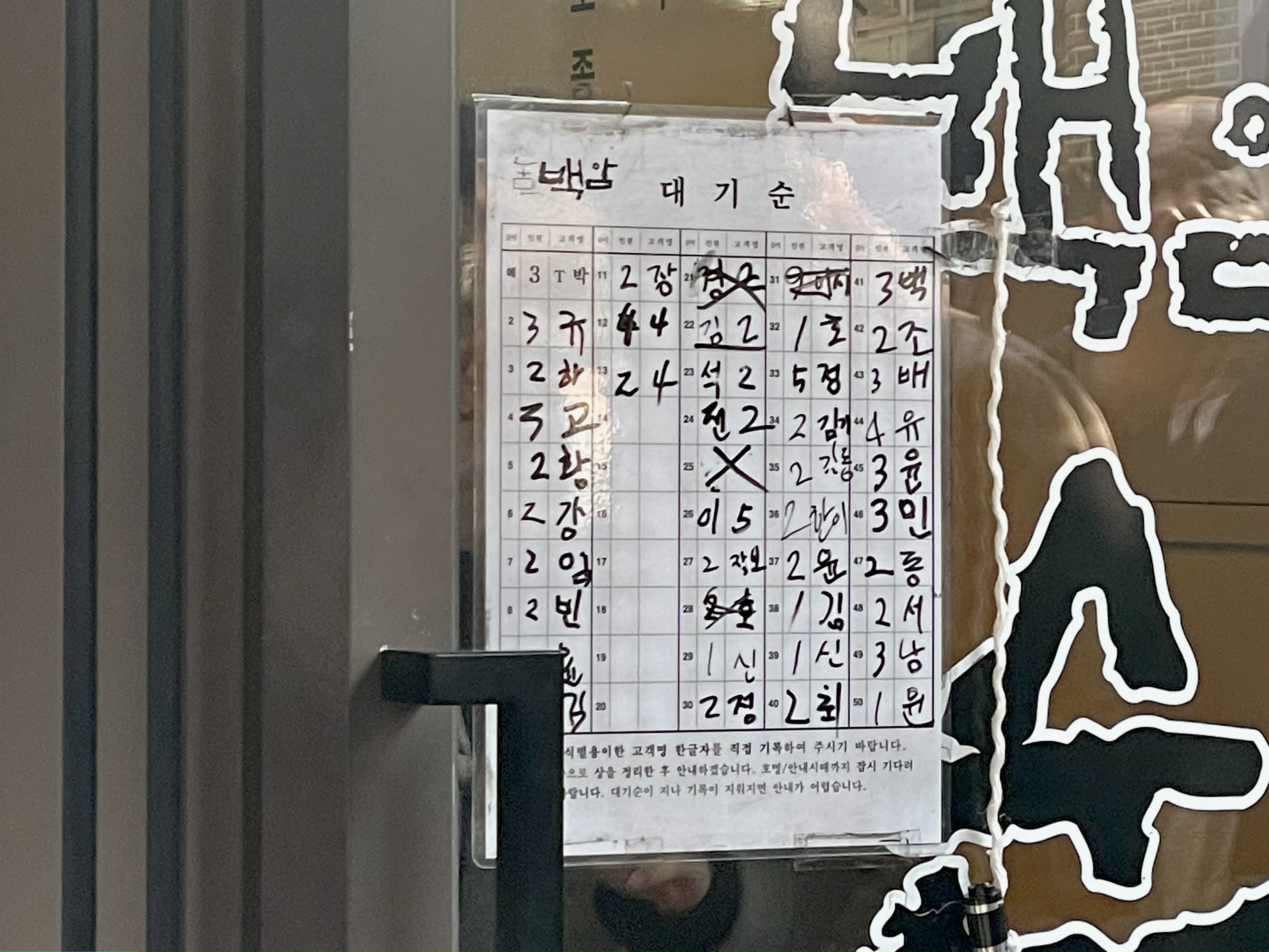 선릉역 직장인이라면 모를 수 없는 점심 맛집인 만큼 ‘11시 오픈’이 무색하게도 아침부터 대기 인원이 엄청납니다. 도착하자마자 대기 순번을 적어야 하고, 11시가 되면 불러 주시는 순서대로 입장합니다. 농민백암순대는 가게가 양쪽으로 있고 대기 순번을 각각 적을 수 있는데요, 부르고 없으면 바로 지우시기 때문에 양쪽 다 적으시는 걸 추천드립니다! 평일 10시 40분에 도착했을 때 식당 앞이 사람들로 가득했고, 11시 오픈했을 때 아슬아슬하게 입장할 수 있었습니다.
