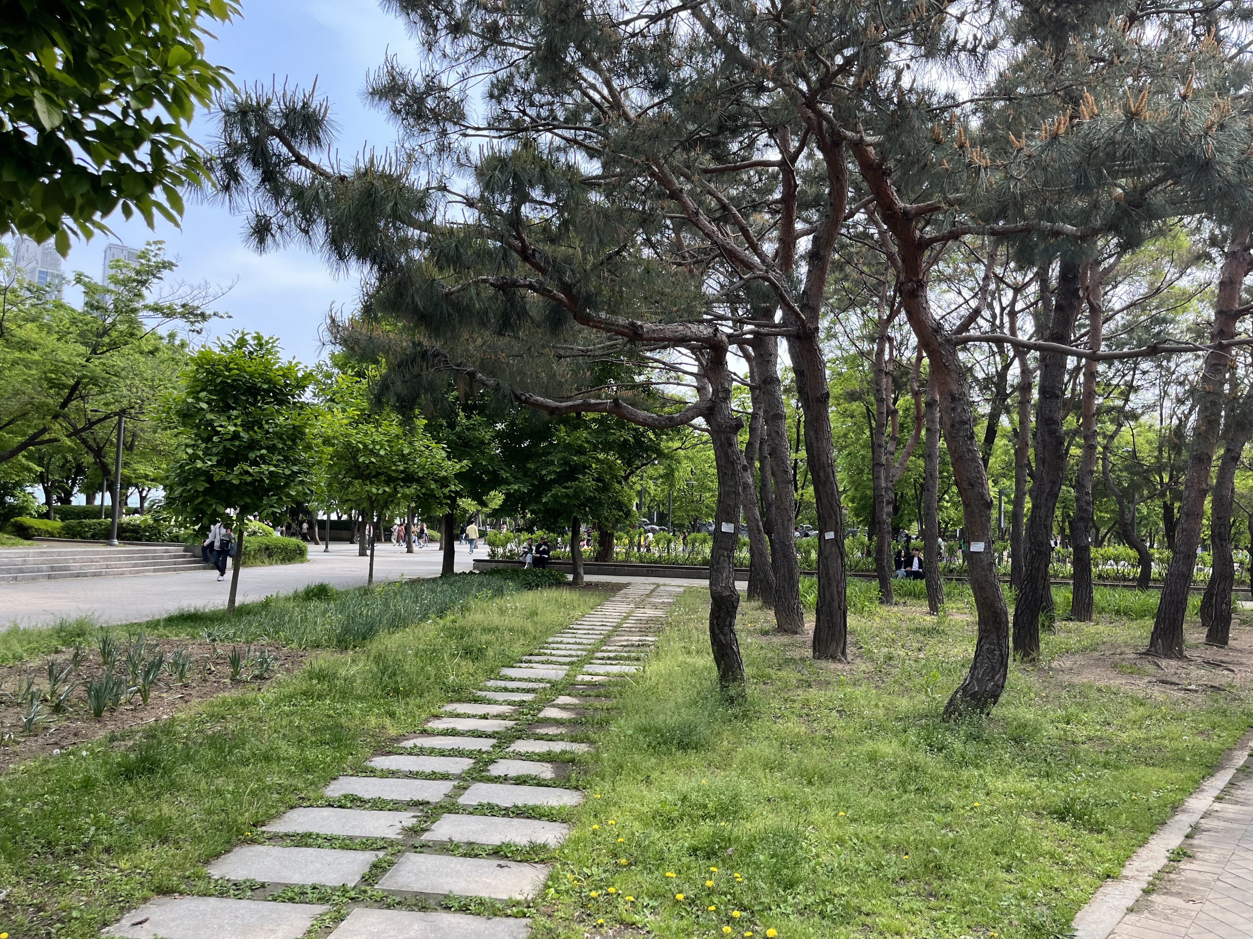 공원 초입에서 만난 거울 연못은 큰 키의 나무들이 물가에 비치는 인공 연못입니다. 물이 발목에 찰랑거릴 정도로 얕으며, 바닥 아래를 검은색 색으로 칠해 반사가 더 잘 보이도록 연출되어 있었어요. 이 스팟에서는 징검다리 위에 올라가 서 있기만 해도 사진이 잘 나와 많은 커플들이 사진을 남기기에 여념이 없었습니다.