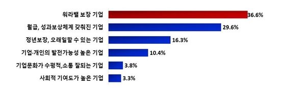 이어 ▲공정한 보상이 이뤄지는 일자리(43.3%) ▲복지제도가 잘된 일자리(32.8%) ▲회사 분위기가 수평적이고 자유로운 일자리(25.9%)가 뒤따랐고, ▲정년 보장 등 오래 일할 수 있는 일자리를 선택한 비율은 14.0% ▲기업 네임밸류가 높은 일자리는 3.3%에 그쳤어요.