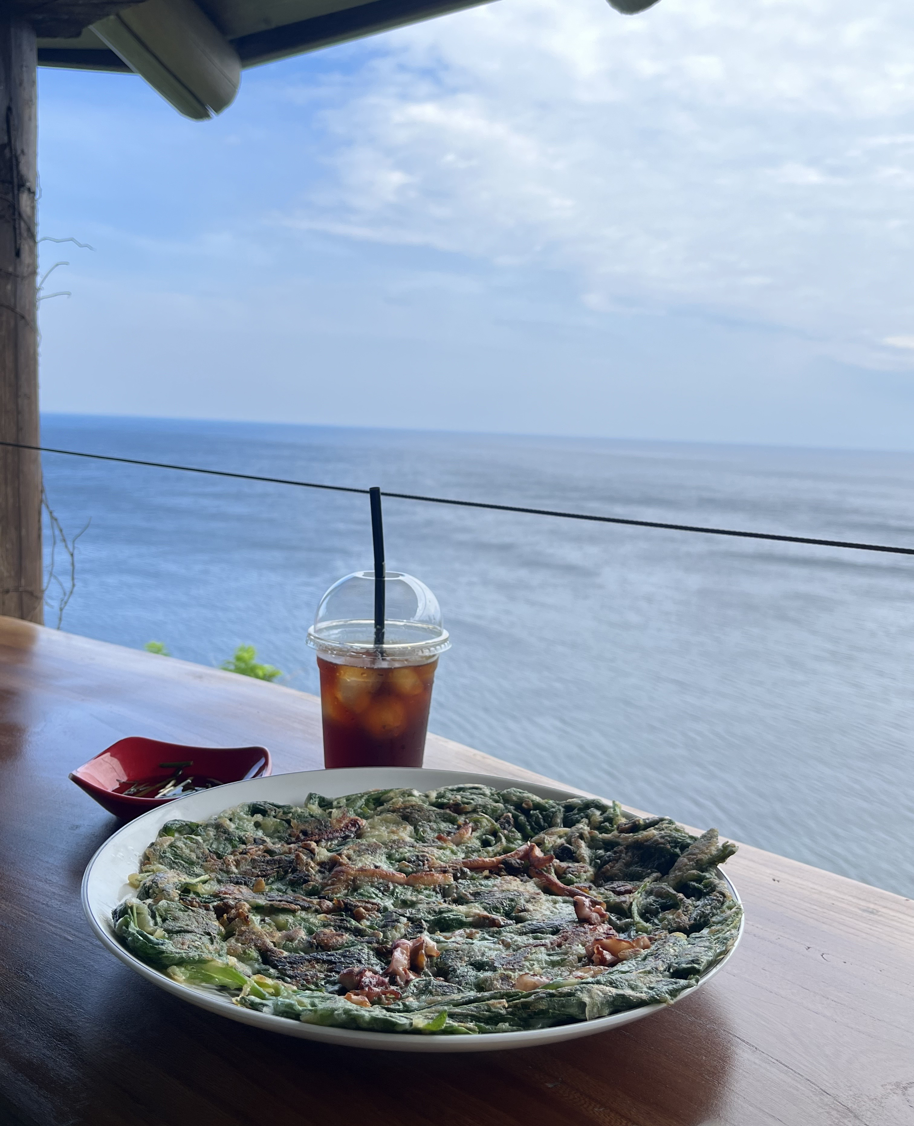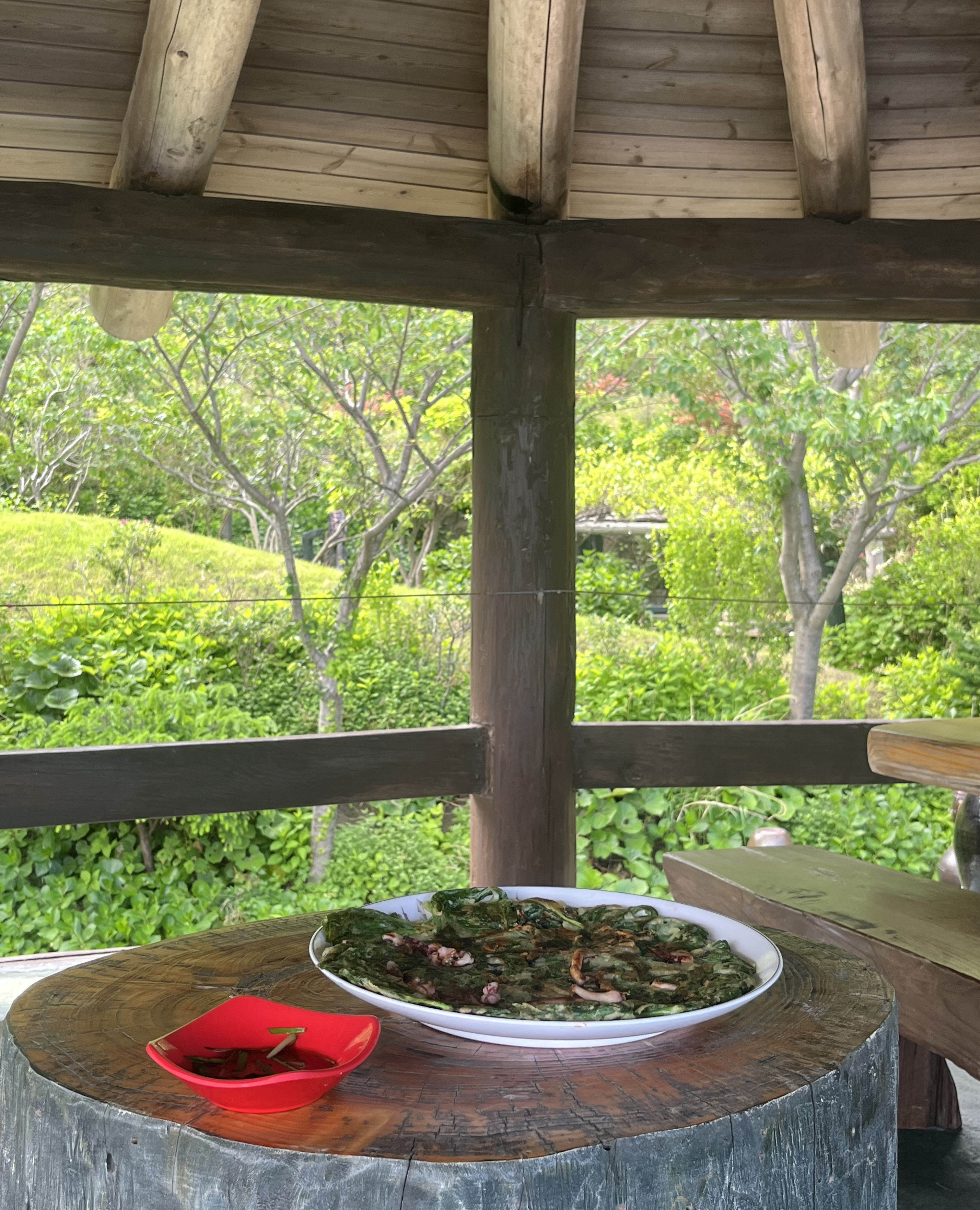 점 찍어 둔 자리로 가 앉으면 간장이 아니라 풍경에 부침개를 콕 찍어 먹는 기분이라고 해야 할까요? 각도에 따라 숲을 볼 수도 있고, 바다를 아래에 두고 즐길 수도 있어 이곳을 두고 무릉도원이라고 설명한 게 아닐까 생각이 듭니다.