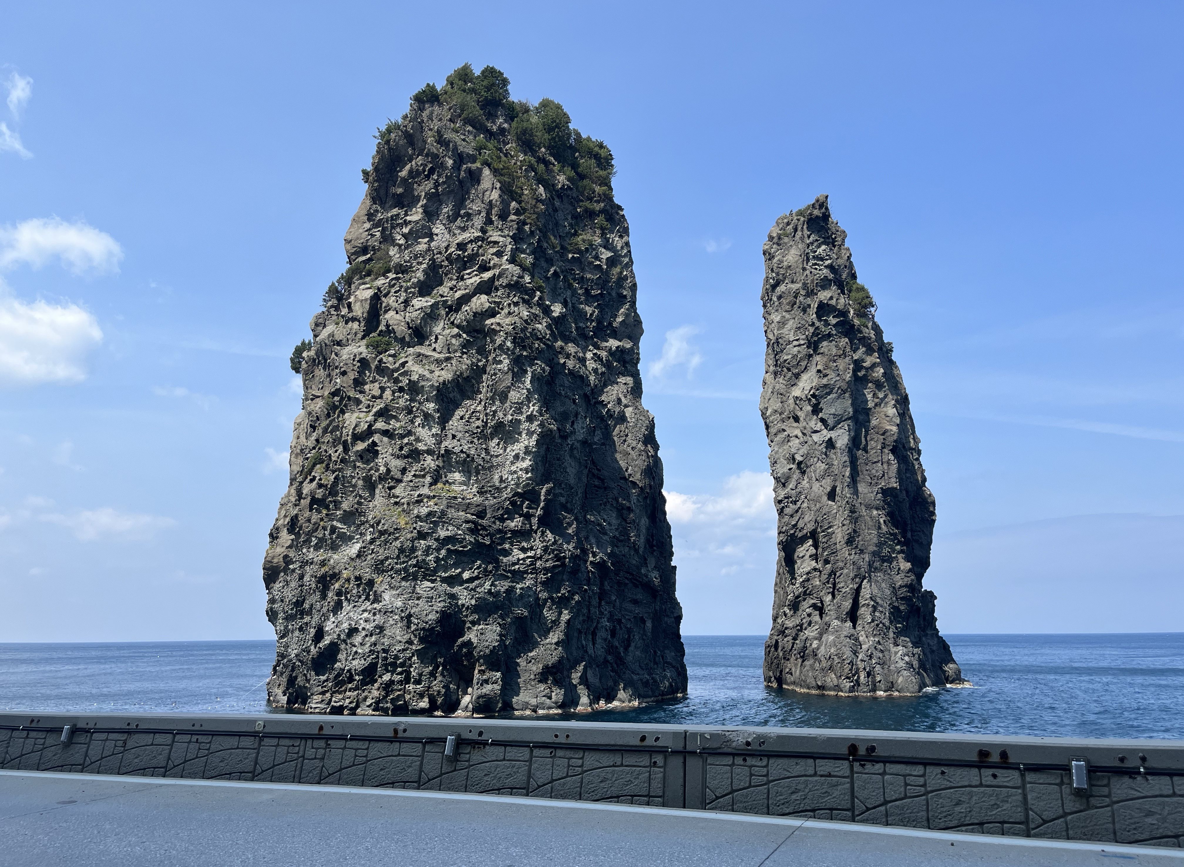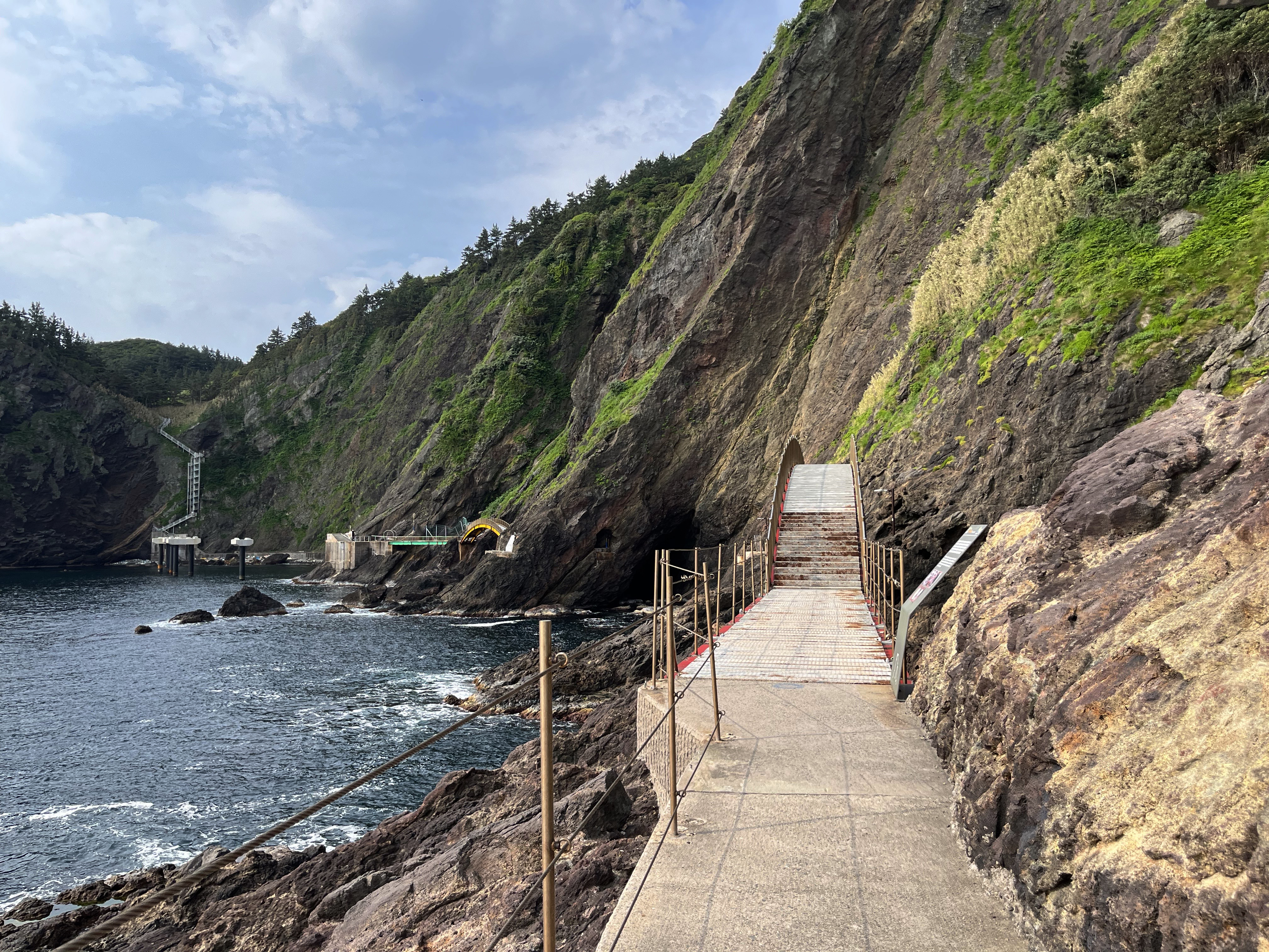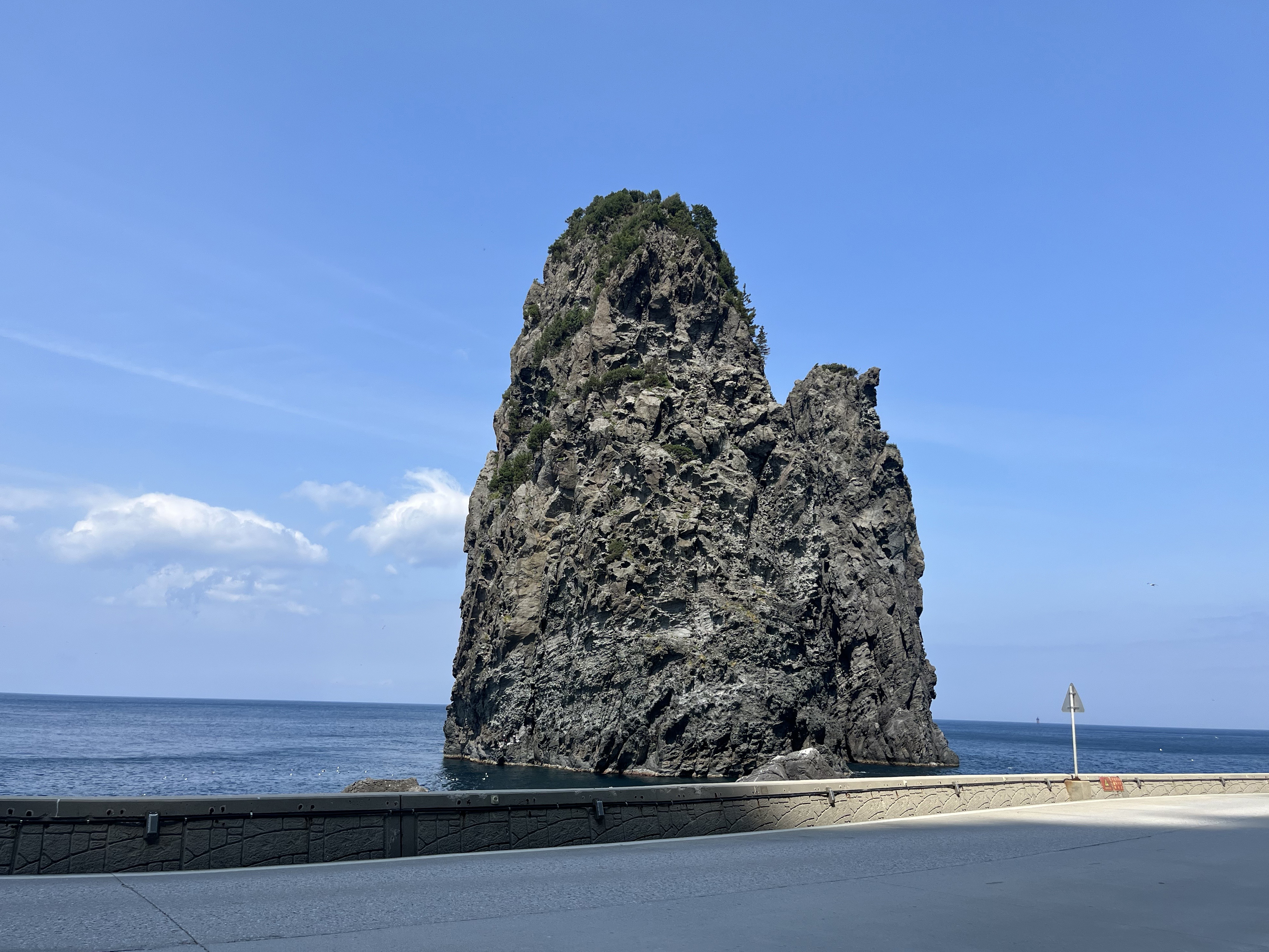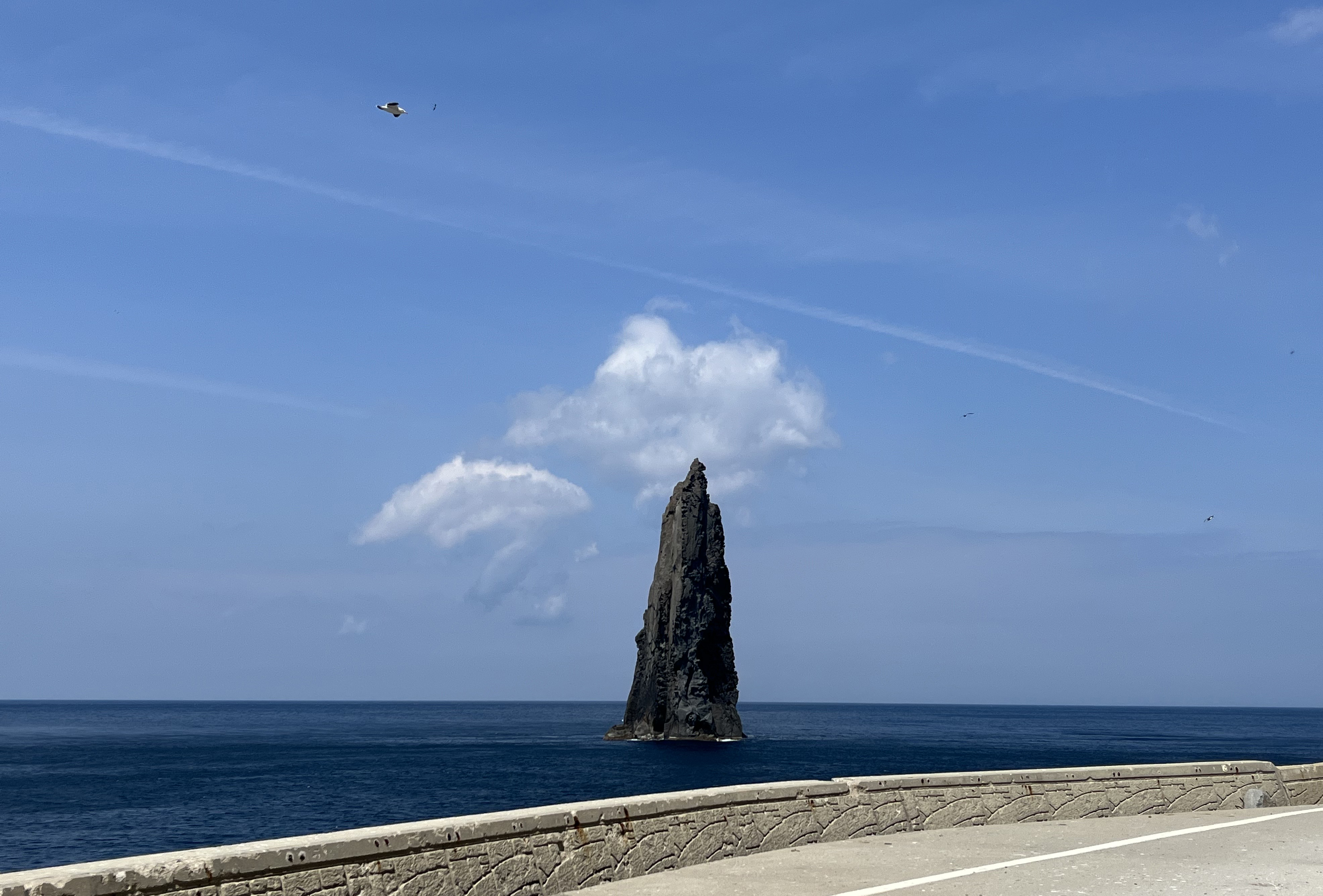삼선암을 만나기 전, 도로를 걸으며 해안 도로 넘어 보이는 바다와 바로 위에 보이는 기암절벽들이 눈에 들어옵니다. 이 길가를 걷다 보면 유독 갈매기가 많은가 싶었는데 알고 보니 괭이갈매기 서식지여서, 코앞을 날아가는 괭이갈매기를 가까이에서 볼 수 있는 재밌는 경험이었습니다.